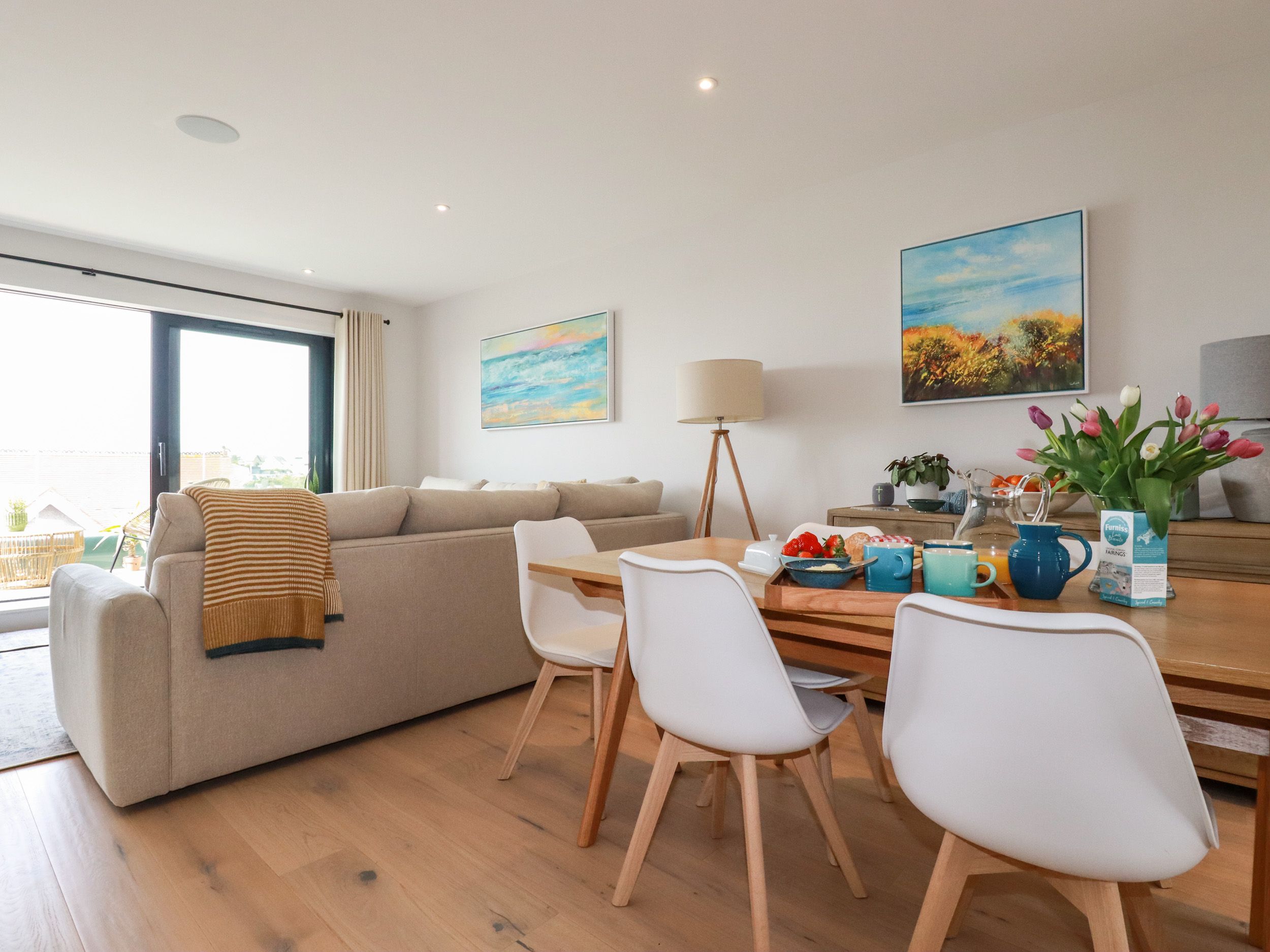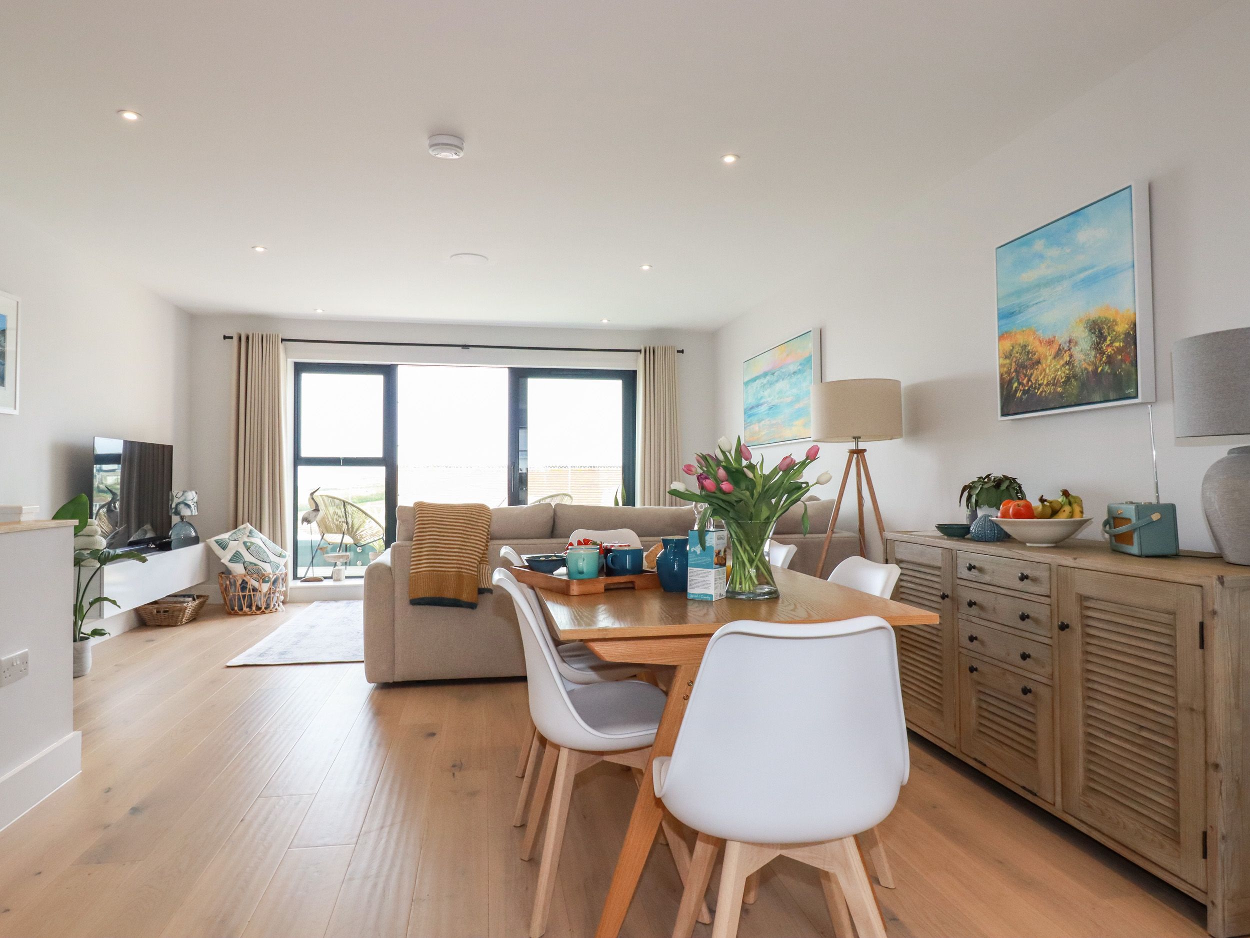 Accomodation Details Please note: this property has preferred check-in days of Mondays and Fridays. Family dog friendly reverse level accommodation. 2 bedrooms: 1 x ground floor king-size with en-suite walk-in shower, basin, heated towel rail and WC, 1 x ground floor twin (can be super king on request). Ground-floor bathroom with bath with shower over, basin, heated towel rail and WC. Ground-floor utility with washer dryer. Open-plan living space with corner sofa, kitchen, dining area and sitting area leading to furnished balcony with sea view over Porth Beach.