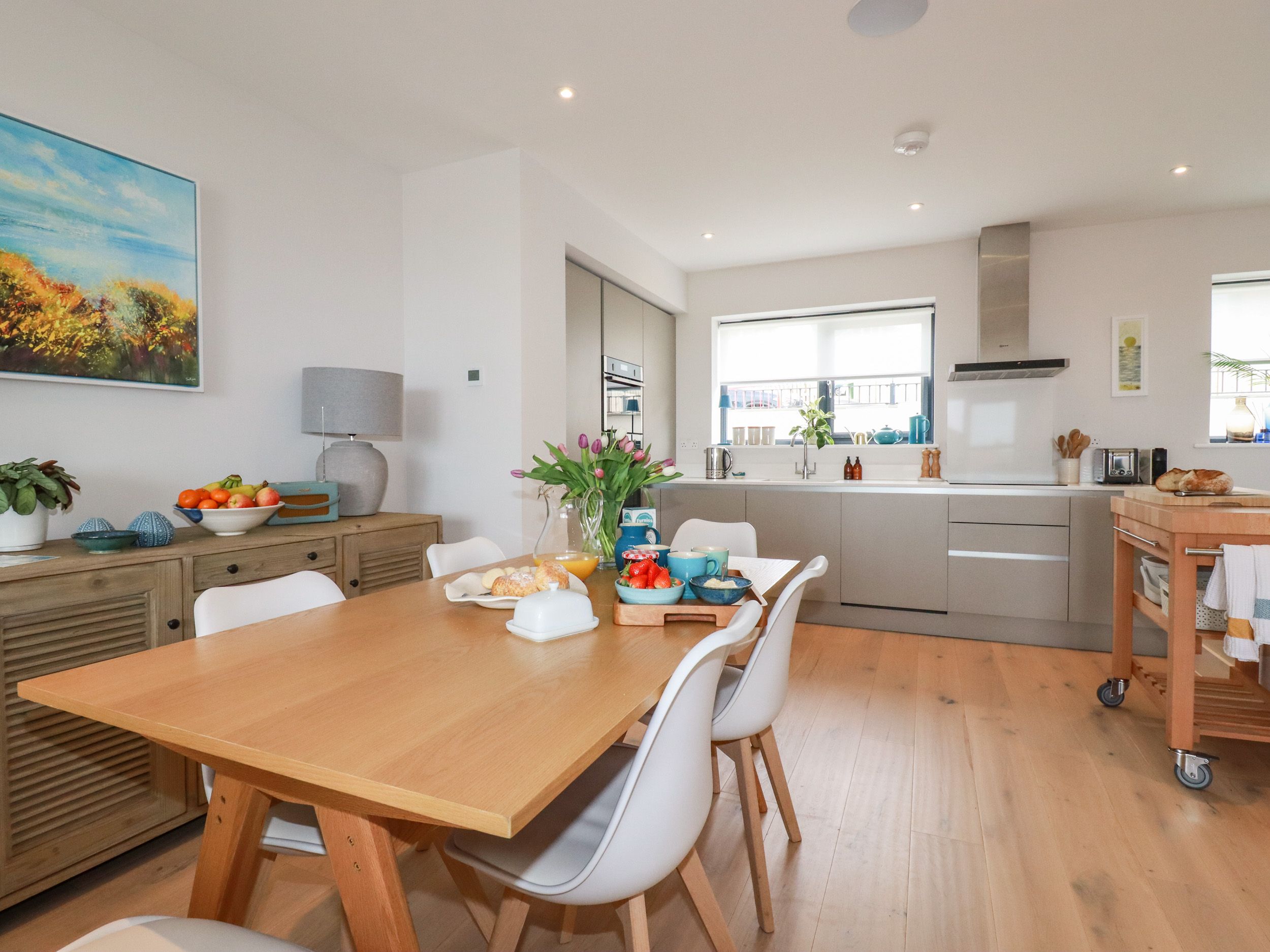 Amenities Underfloor heating. Electric oven and hob, microwave, fridge/freezer, washer/dryer, dishwasher, nespresso machine with complimentary pods. Smart TVs in Bedrooms and living room, superfast WiFi. Allocated parking for 1 car. Rear garden with patio, lawn, furniture and gas BBQ. One well-behaved small dog welcome, please make sure you add them when you make your booking. Stair gates, travel cot and highchair available at all times. Sea views from first floor living room and balcony. Sorry, no smoking. Beach 0.1 miles, shop 0.7 miles, pub 0.1 miles. Note: Entrance to the property is on the ground floor, with stairs to open plan living area.