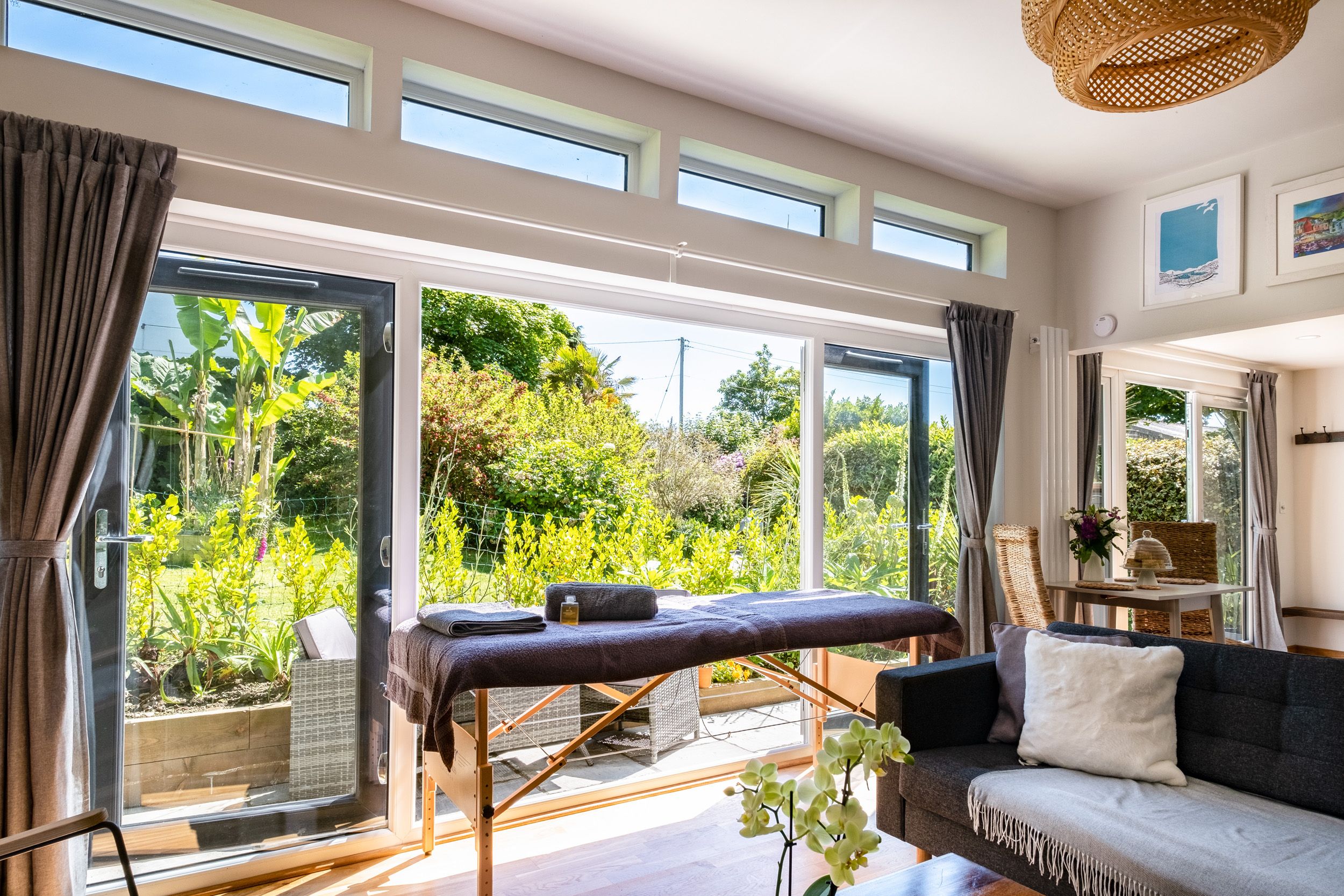 Electric central heating with woodburning stove. Electric oven and hob, microwave, fridge with ice box, washing machine, dishwasher. Smart TV (on demand services only), WiFi, selection of books and games. Fuel, power and starter pack for woodburning stove inc. in rent. Bed linen and towels inc. in rent. Hairdryer. Off-road parking for 1 car. Enclosed front garden with lawn, patio, furniture and outdoor shower. Secure storage for bikes and surfboards. Local pilates studio and mobile massage available at an additional charge, booking advised. Two well-behaved pets welcome. Sorry, no smoking. Shop 0.9 miles, pub 0.9 miles, beach 1.9 miles. Note: This property only accepts babes in arms