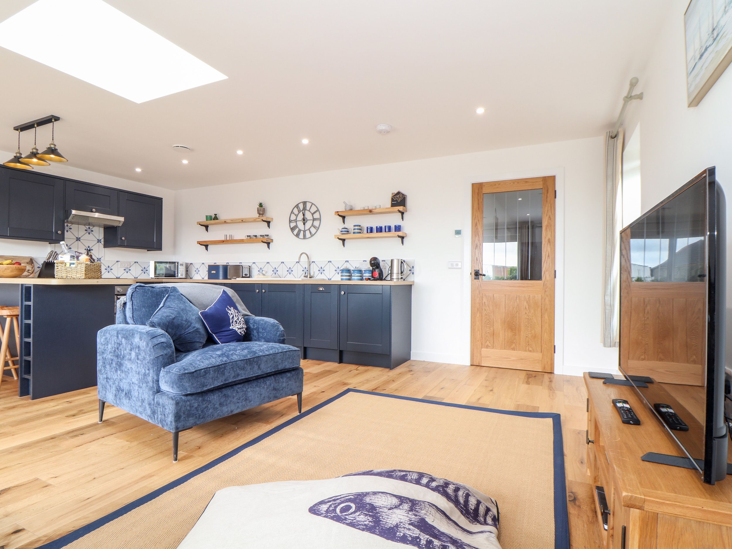 Amenities Underfloor heating. Electric oven and hob, microwave, fridge, freezer, washer/dryer, slimline dishwasher, coffee machine, kettle, toaster. 3 x Smart TV, WiFi, selection of games. Fuel and power inc. in rent. Bed linen and towels inc. in rent. Off-road parking for two cars. Enclosed garden with patio, lawn, furniture, and barbecue. Sorry, no pets and no smoking. Shop 0.5 miles, pub 0.1 miles, beach 1.1 miles. Note: Ceiling windows with remote control blackout in both bedrooms. Note: Working dairy farm