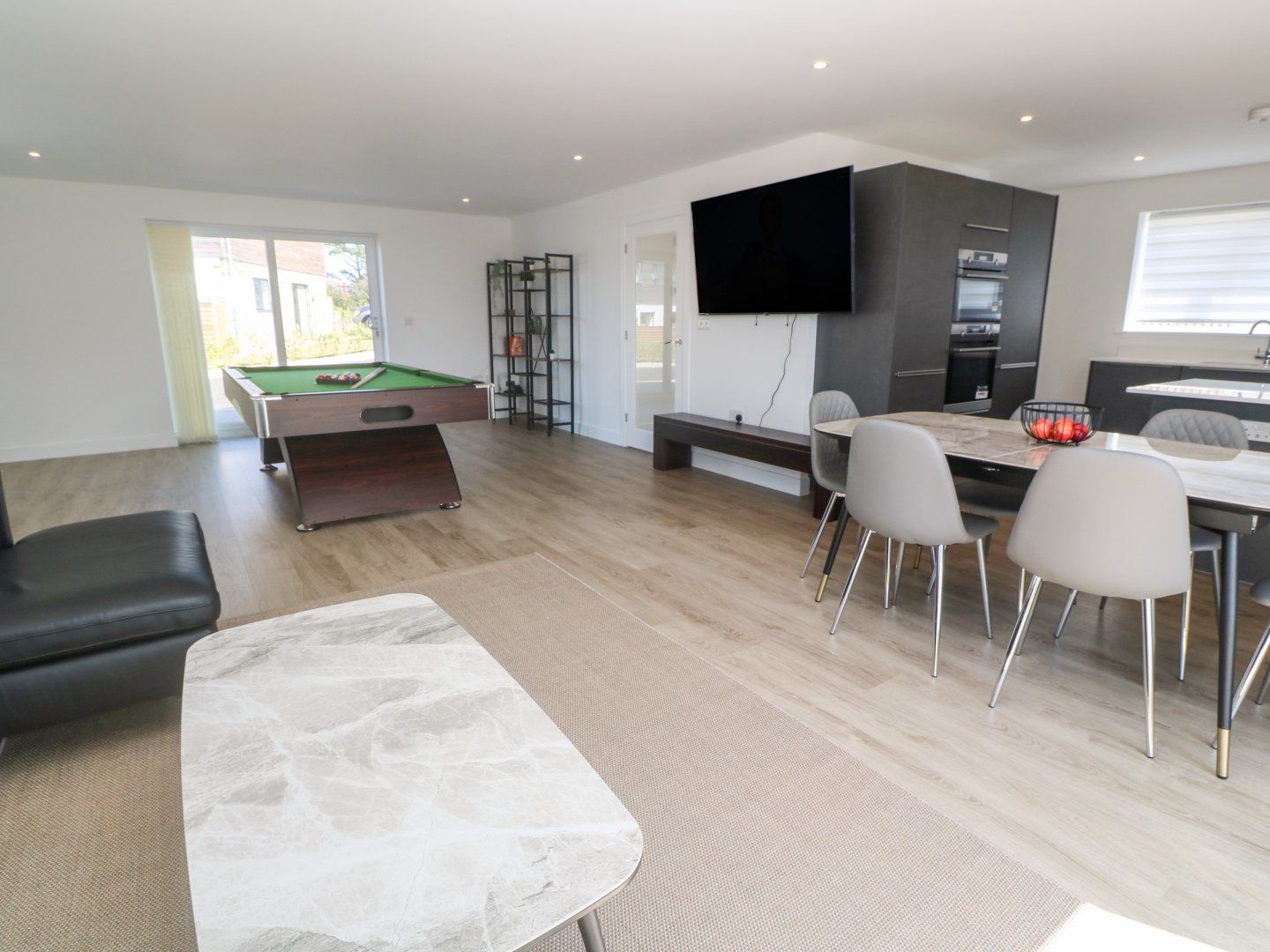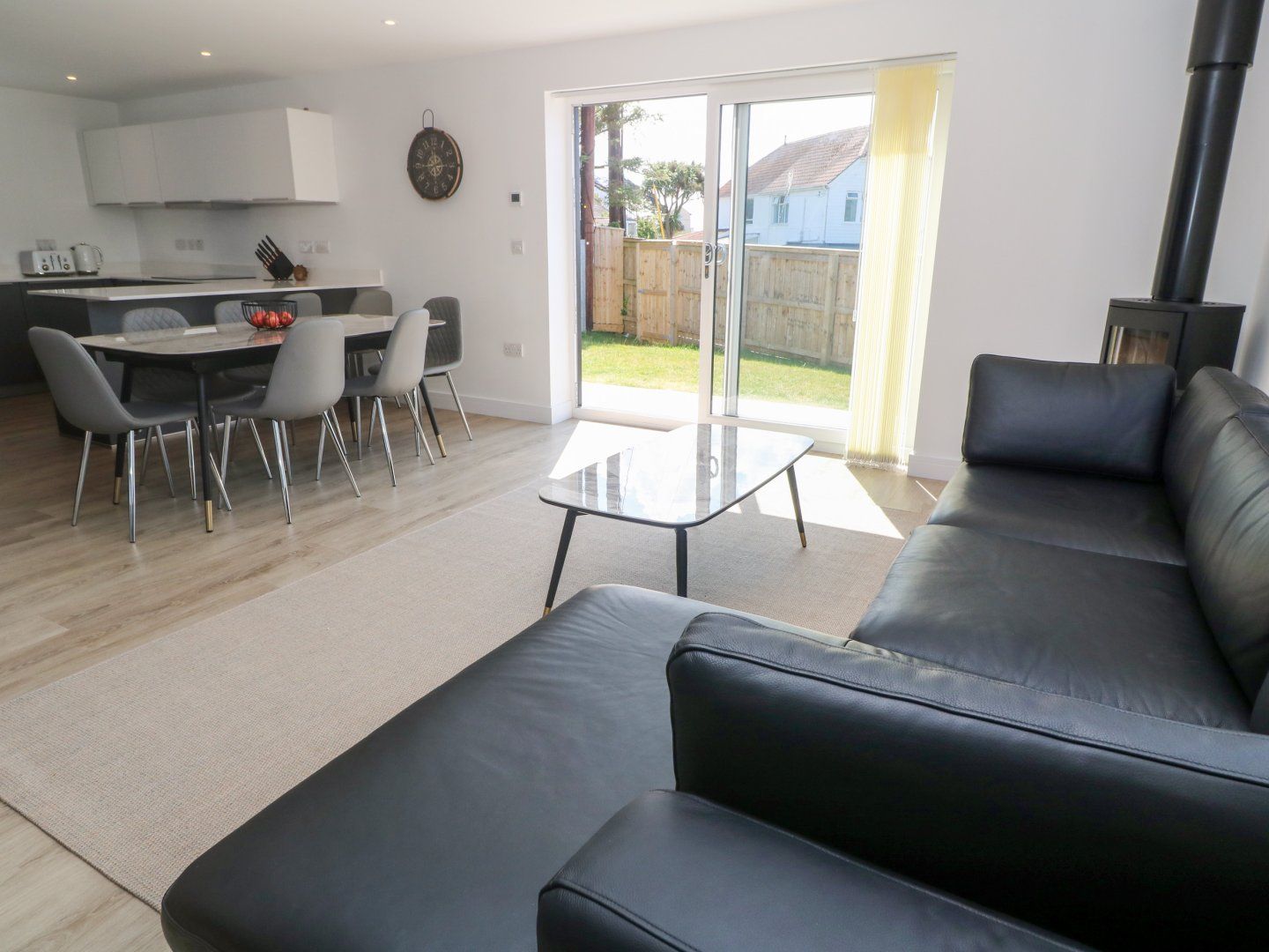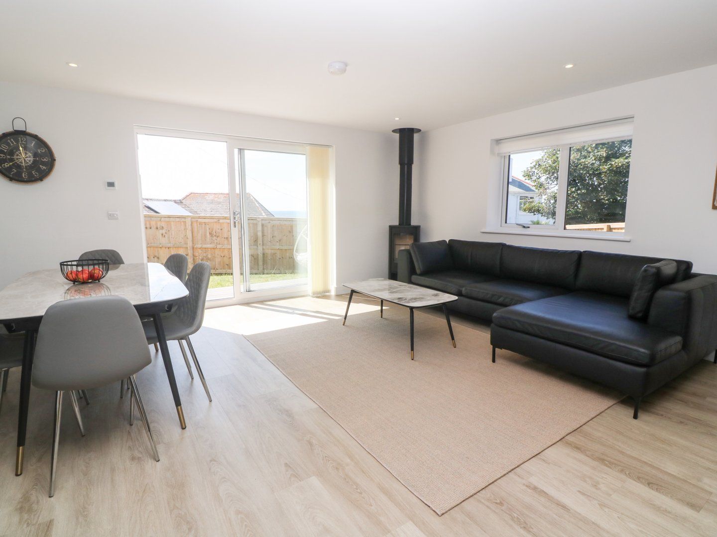Amenities Electric central heating with woodburning stove. Electric oven and hob, microwave, fridge/freezer, washing machine, tumble dryer, dishwasher, wine cooler. Smart TV, WiFi, pool table. Fuel, power, and starter pack for woodburning stove inc. in rent. Bed linen and towels inc. in rent. Highchair and travel cot available. Off-road parking for 3 cars. Enclosed rear garden with patio, lawn, decked area, furniture, barbecue, and hot tub. Two well-behaved dogs welcome. No smoking. Shop 0.6 miles, pub 0.9 miles, beach 0.1 miles