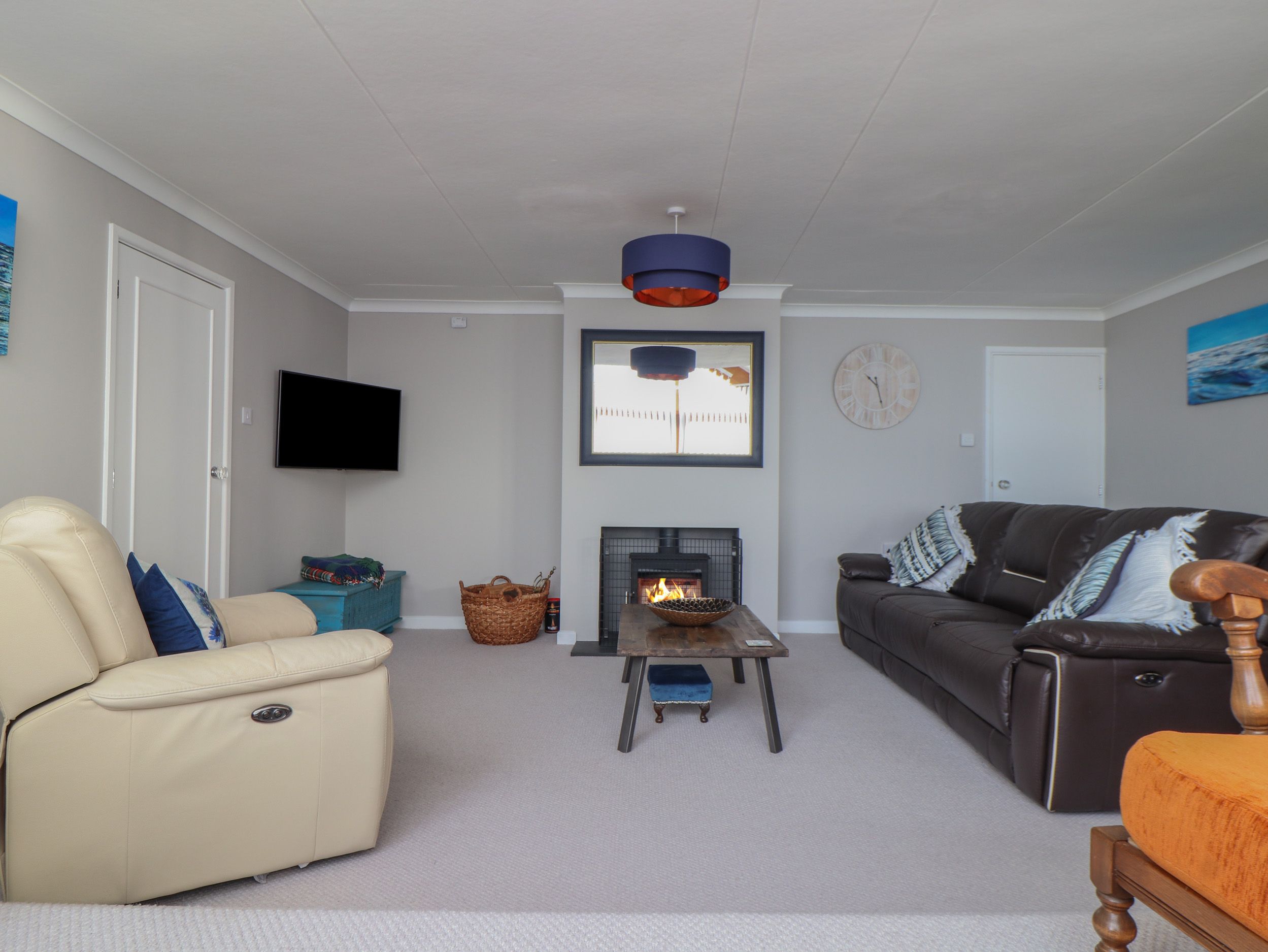Amenities Electric central heating with woodburning stove. Electric oven and grill, induction hob, microwave, fridge/freezer, washing machine, dishwasher, coffee maker. Smart TV, WiFi. Fuel, power and starter pack for woodburning stove inc. in rent. Bed linen and towels inc. in rent. Travel cot and high chair available. Off-road parking for 2 cars. Enclosed, multi-level front garden with lawn, patio and furniture. Rear, multi-level garden with lawn, patio and furniture. Two well-behaved pets welcome. Sorry, no smoking. Shop 0.4 miles, pub 0.6 miles, beach 0.4 miles. Note: This property is on an elevated position with stone steps, please take care. Note: The greenhouse in the rear garden is off limits. Note: The stone steps leading up to the patio in the rear garden are off limits due to safety risks