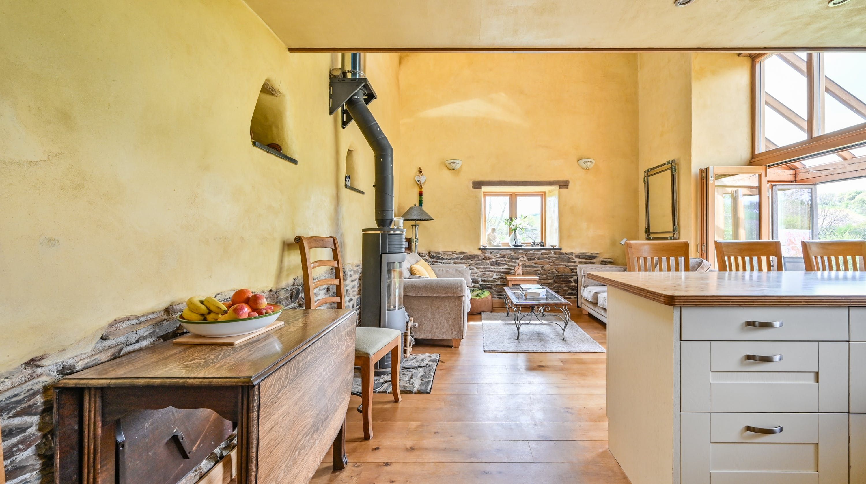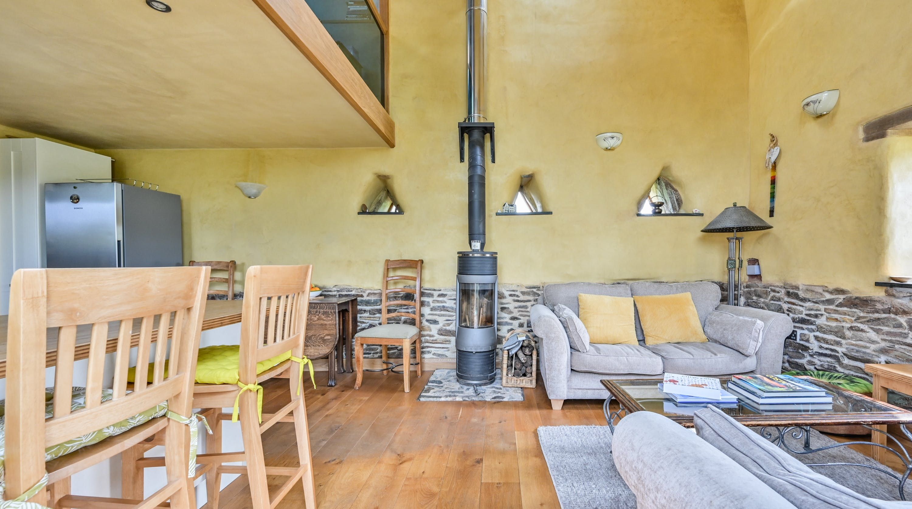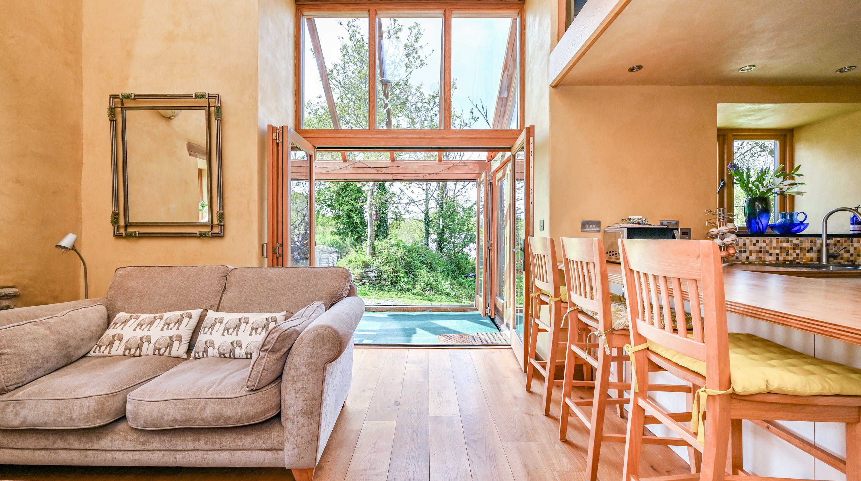 The renovated cob and stone property sits within six acres of idyllic riverside woodland and is built out of natural materials, including oak, lime, cob, pigmented clay plaster and locally sourced slate. Inside, there are a few rustic features, such as the exposed stonework and wood-burning fireplace, but otherwise, it's undeniably contemporary thanks to the conservatory, sleek kitchen and pristine bathrooms. The fact that it's powered by a wind turbine and a heat pump is pretty impressive, too.