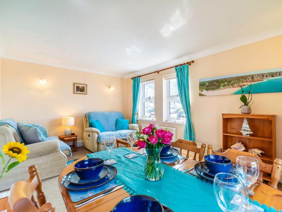 Each morning, you can wander through the pretty streets down to the harbour front for a postcard-perfect spot to start the day. Light, bright and full of colour, the open-plan living space of this property invites you in to sit back and relax on the two cosy sofas looking out of the window across the harbour and out to Gull Rock on the beach.