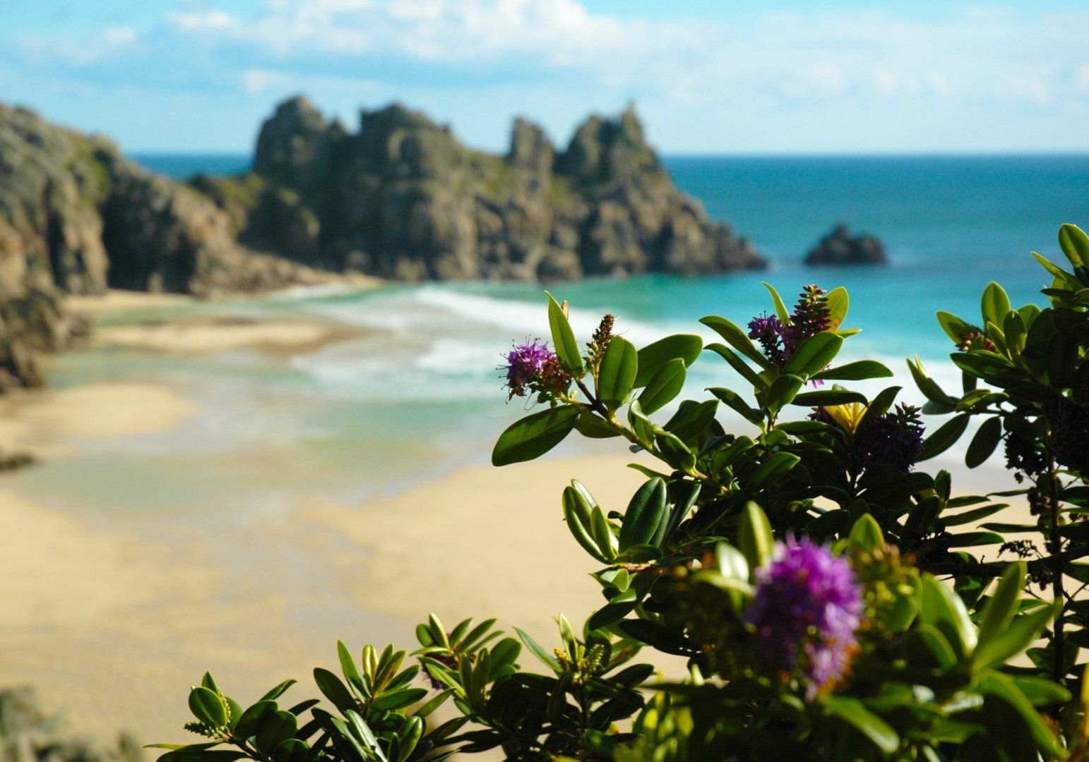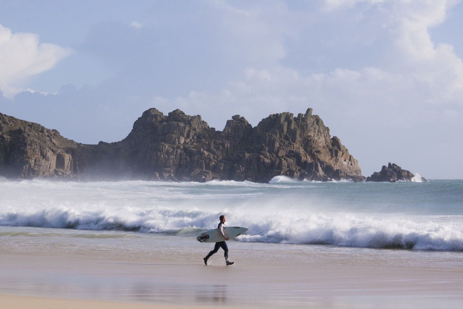 Renowned for its snow-white sands and turquoise-blue waters, Porthcurno Beach is situated in a small cove between grassy headlands and is reachable in just four minutes by car or if you fancy a long walk, you can reach it on foot in thirty-three minutes. The large boulder formations here add to the beaches striking appearance and also provide great conditions for both bodyboarding and swimming. What’s more, backing the beach is the iconic open-air Minack theatre with its Grecian architecture and panoramic views over the bay. From May until September, you will be able to experience a variety of plays and concerts with an incredible ocean backdrop stretching to Logan Rock headland in the distance.