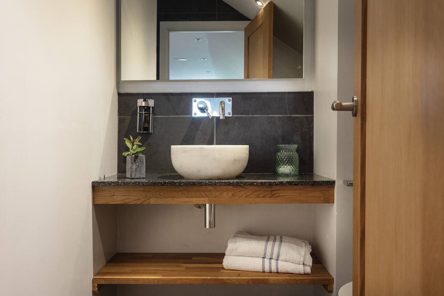 Upstairs, a spacious double bedroom also boasts a separate seating area with views out over the gorgeous landscapes. During peak holiday periods, the leather armchairs can be switched out for a couple of single beds, transforming this couple's retreat into a family-friendly getaway. There's also a sleek slate bathroom with a walk-in shower and separate bath.