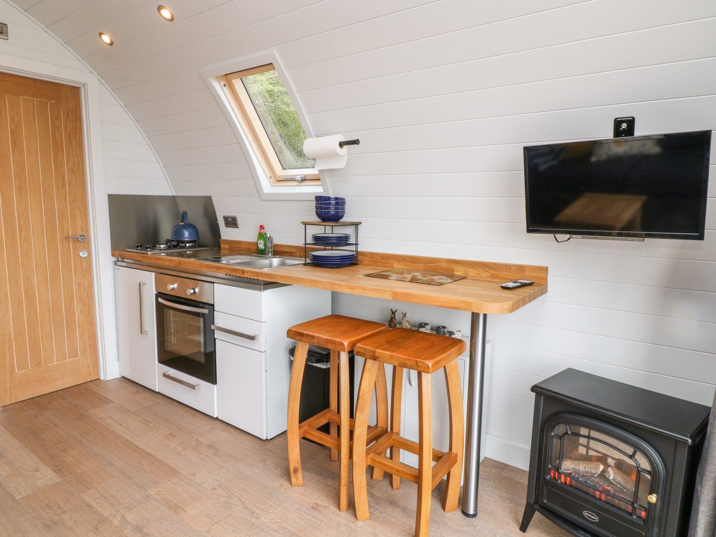 This contemporary pod has a studio layout with an open-plan living area housing a kitchen with gas oven, gas hob, microwave, fridge with ice box, a dining area for two, a sitting area with a Smart TV and electric fire stove and double bed. There is also a shower room with walk-in shower, basin, heated towel rail and WC. Outside there is a non-enclosed patio with hot tub and furniture and communal lawn, plus ample off-road parking in car park. Within 2.5 miles you will find a shop, within 2.3 miles, a pub, and within 0.9 miles, a river, and please note this is a pet-free and smoke-free property. Fuel, power, bed linen, towels and WiFi included in the rent. Indulge in the countryside of Cornwall with a stay at Ash.