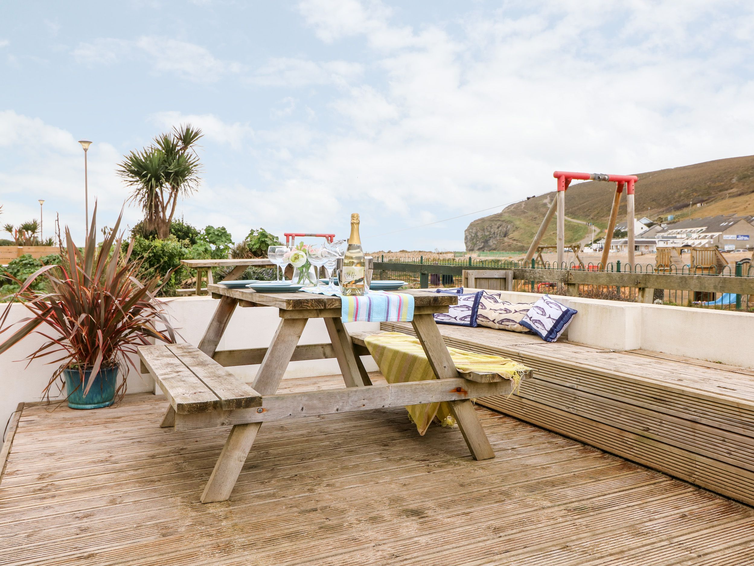 Holiday home Offshore is a ground floor apartment on the road to Porthtowan beach. The property sleeps four adults and has two bedrooms, one double and one with bunks.The living area is open plan with a well equipped kitchen, dining area and comfortable sitting area which leads to the sun deck with furniture. Off road parking for one car. A short walk to the beach and childrens play area. Perfect location to explore Porthtowan and surrounding countryside, Offshore is a beautiful beachside bolthole with ocean views.
