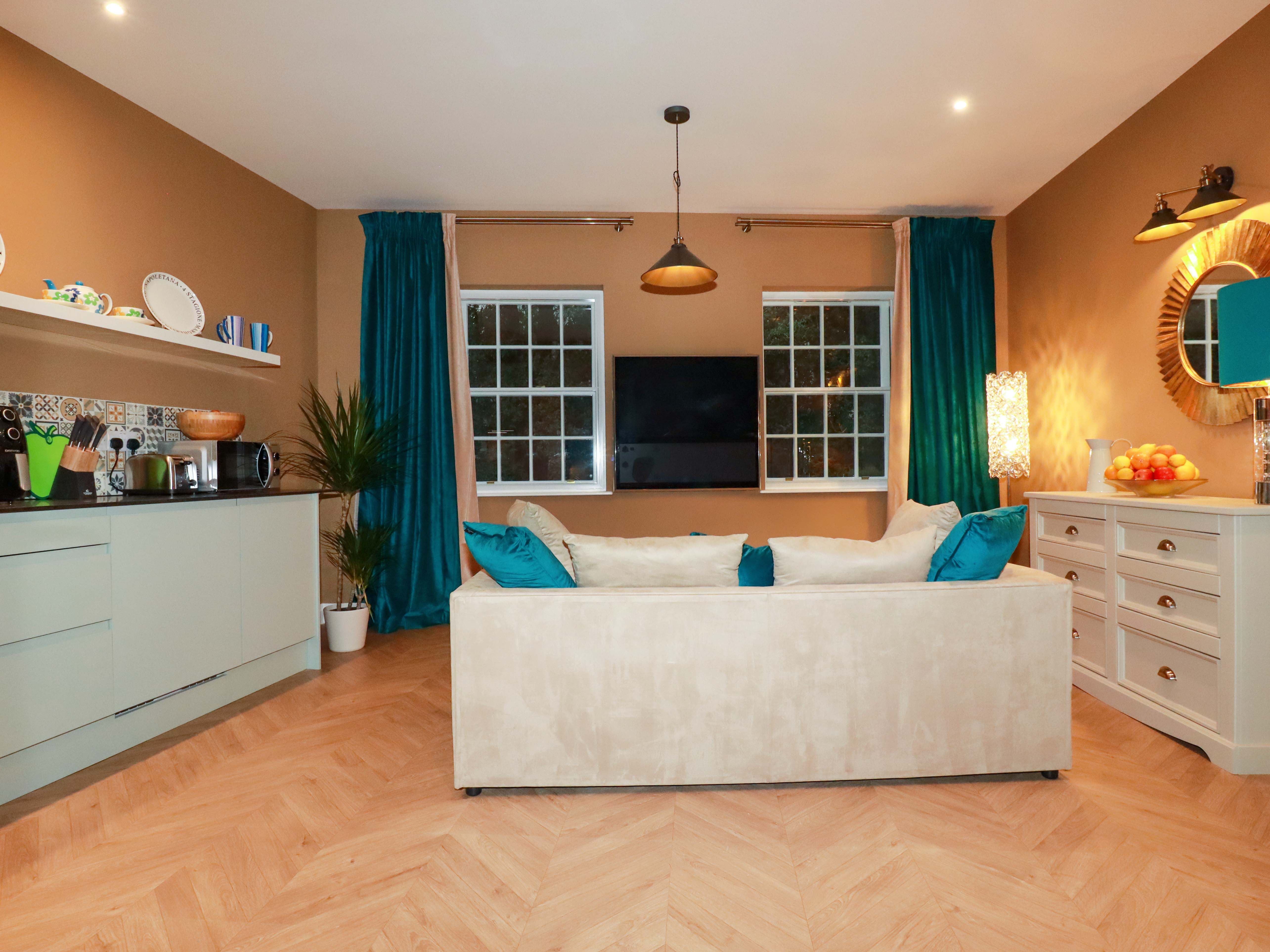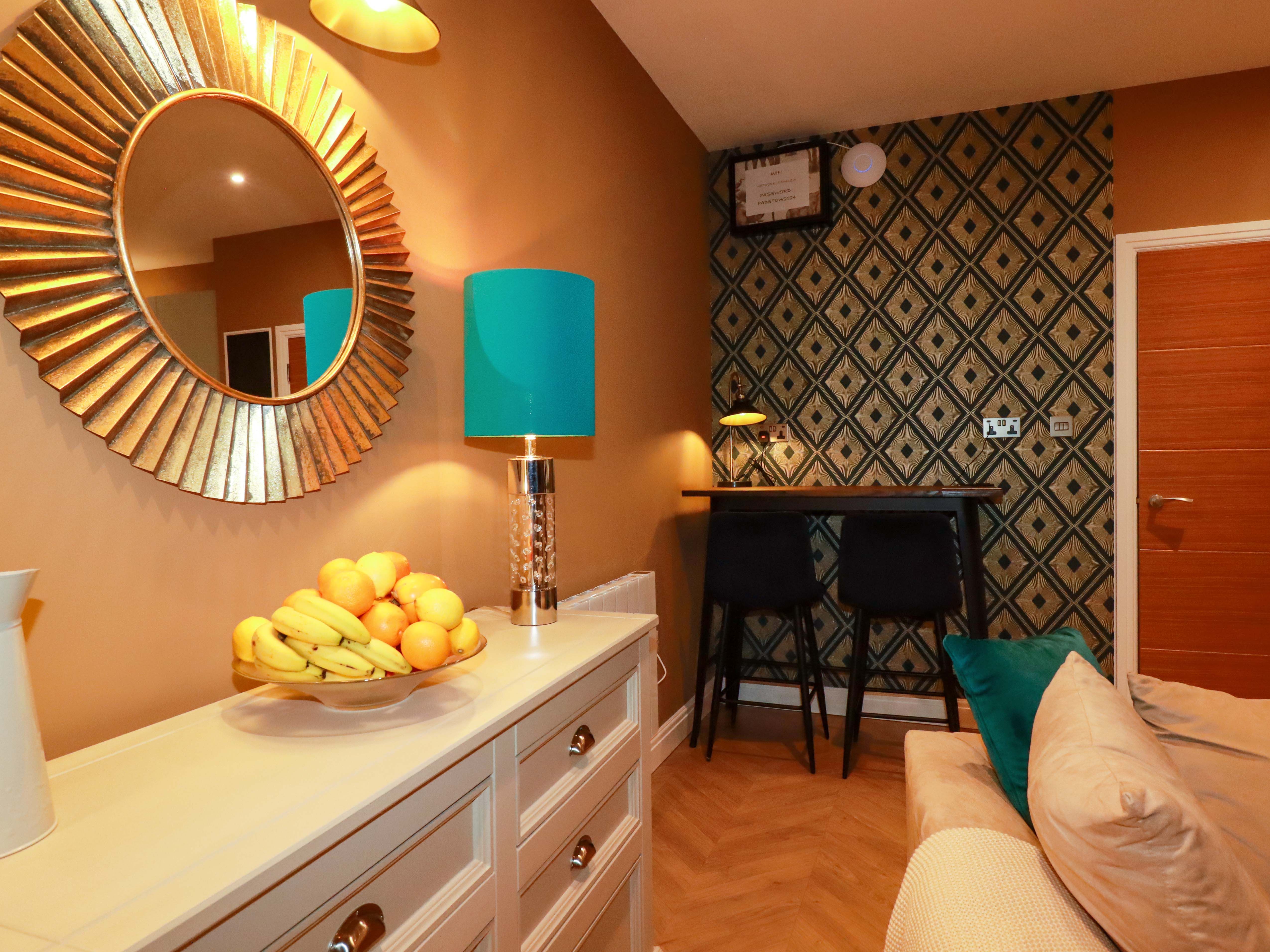 Accomodation Details First-floor apartment. One double bedroom with TV. Shower room with walk-in shower, basin, heated towel rail, WC. Open-plan living space with kitchen, dining area and sitting area. USB A & C sockets on the bedside tables and at the breakfast bar/workstation.