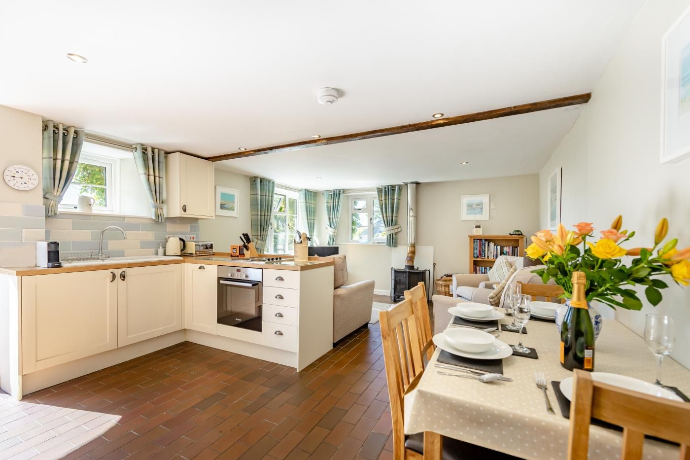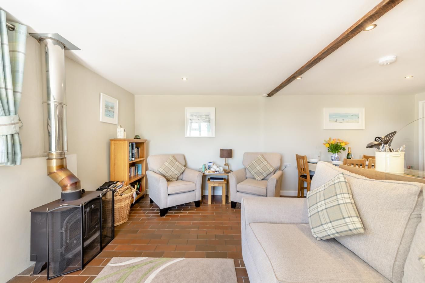 Ensuring plenty of space to spend time with your loved ones, the open-plan kitchen/living room/diner has soft seating, a woodburner and a Smart TV for a perfect evening at home.