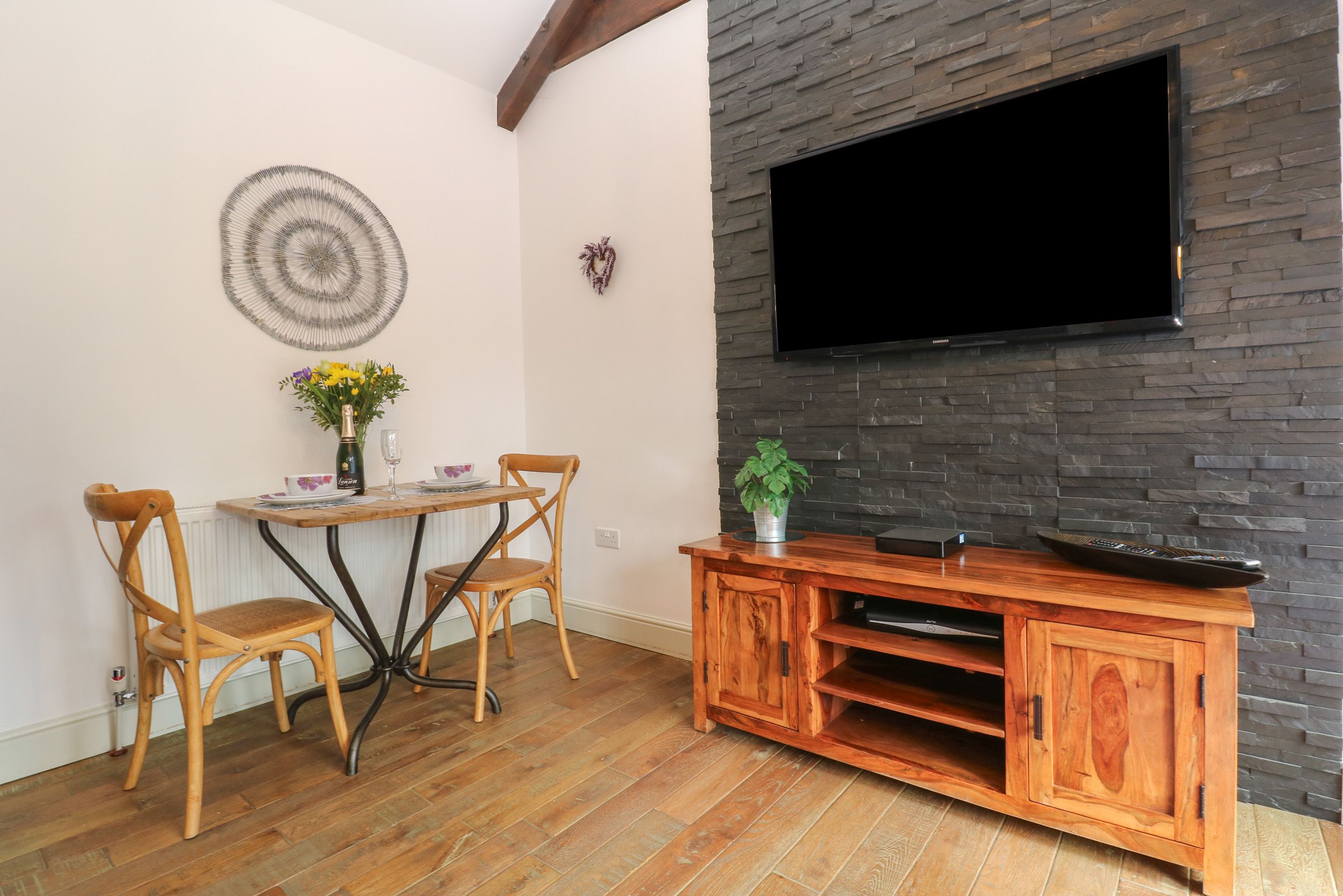Holiday home The Stables has one king-sized bedroom with en-suite walk-in shower, basin, heated towel rail and WC. There’s an open-plan living space with a kitchen equipped with an electric oven and hob, microwave, fridge/freezer, washing machine, tumble dryer, dishwasher, kettle and toaster, a dining area and sitting area with a Smart TV, Bluray Player, DVD Player and a CD Player. Gas central heating, WiFi, fuel and power, bed linen and towels are included in the rent. Outside there’s off-road parking for 1 car, a non-enclosed front patio with furniture and barbecue, and communal grounds with furniture. Sorry, no pets and no smoking. Shop 2.4 miles, pub 2.5 miles. A romantic getaway awaits at The Stables. Note: No children allowed, including babes in arms. Note: From November to March there's an extra charge of £15 per week for heating and electricity. Note: Owner is happy to do washing at a small charge per load. Note: Owner hosts an annual party/get together every August bank holiday weekend. Note: This property's changeover day is Saturday only. Note: This property can be booked with Ref. 1152980 together sleeping up to four guests.