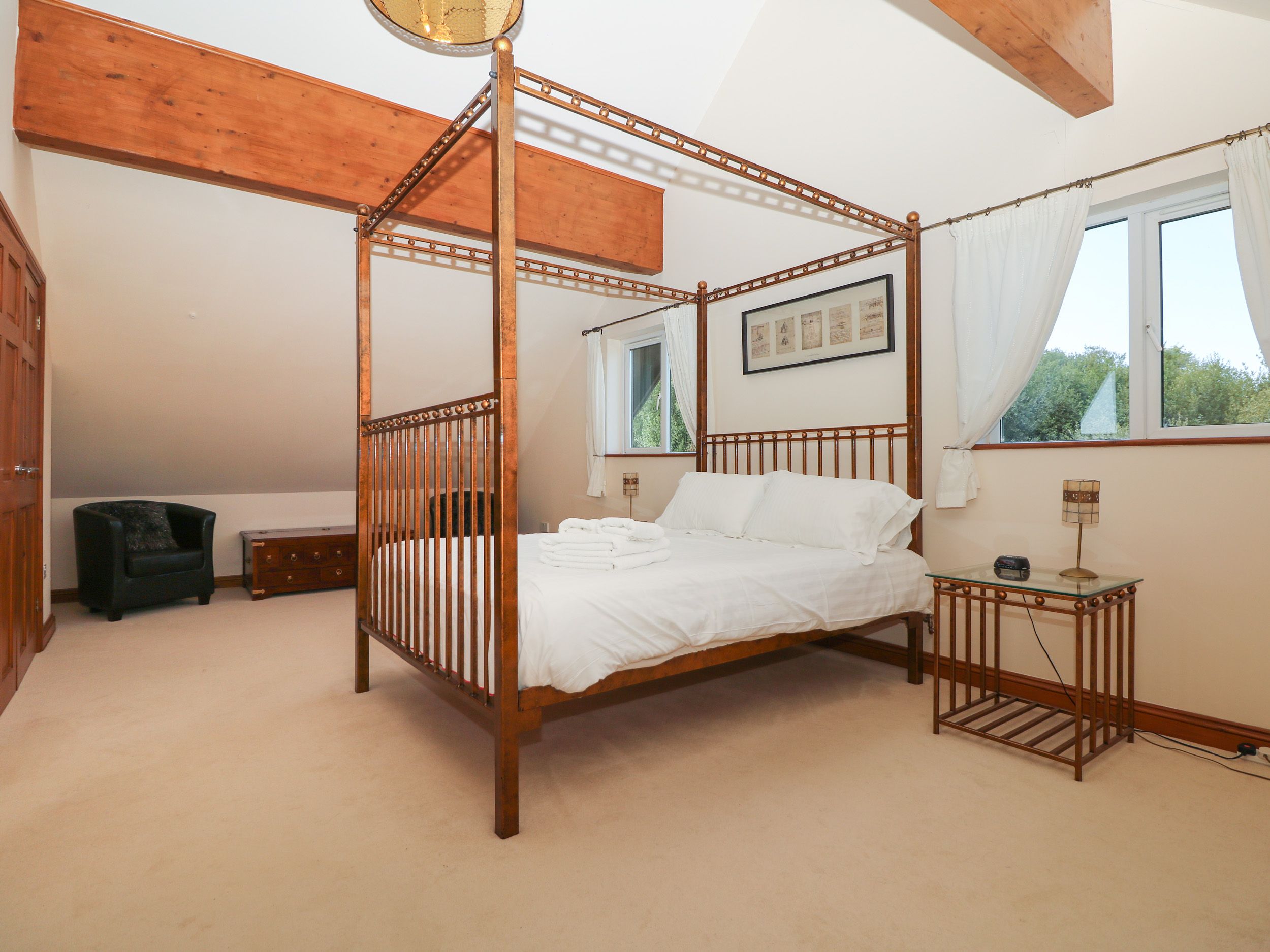 Upstairs offers a spacious master suite with en-suite shower room, super king four poster bed and fabulous vaulted ceilings, a separate twin bedroom, it’s own lounge with TV, balcony and full height windows offering far reaching views of the Cornish countryside.