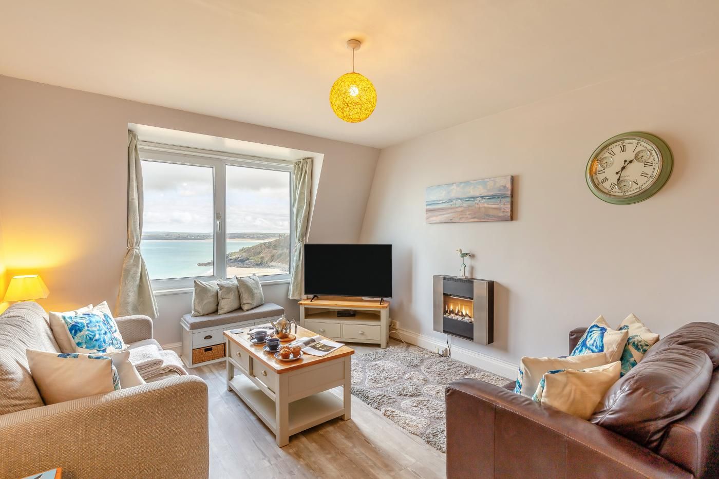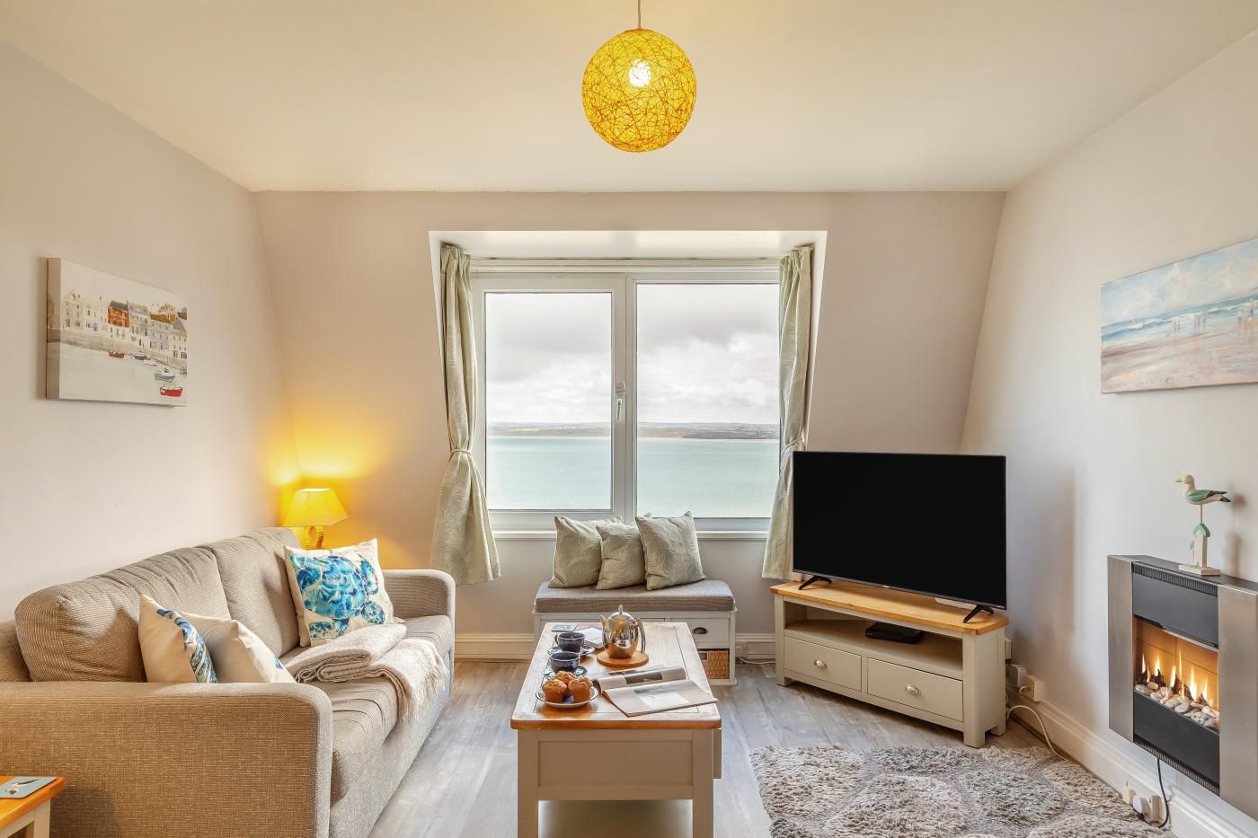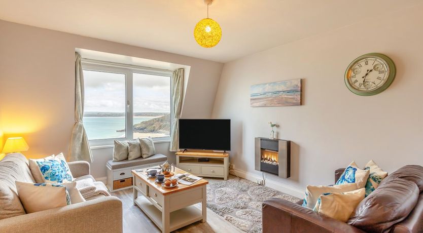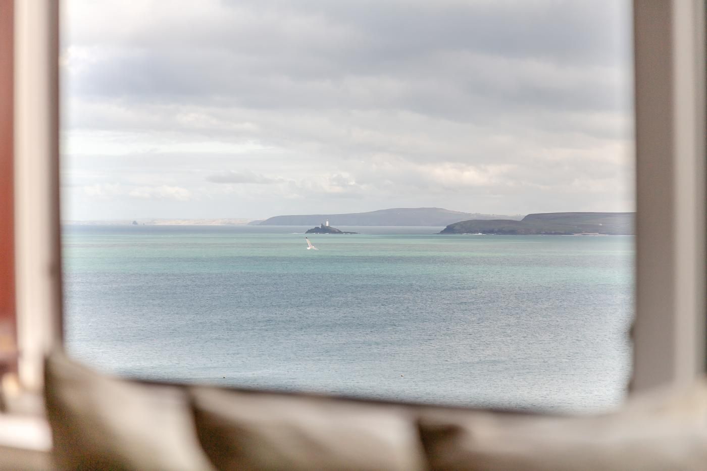 This comfortably furnished apartment offers superb sea views over Porthminster Beach toward Hayle Towans, Godrevy Lighthouse and beyond.