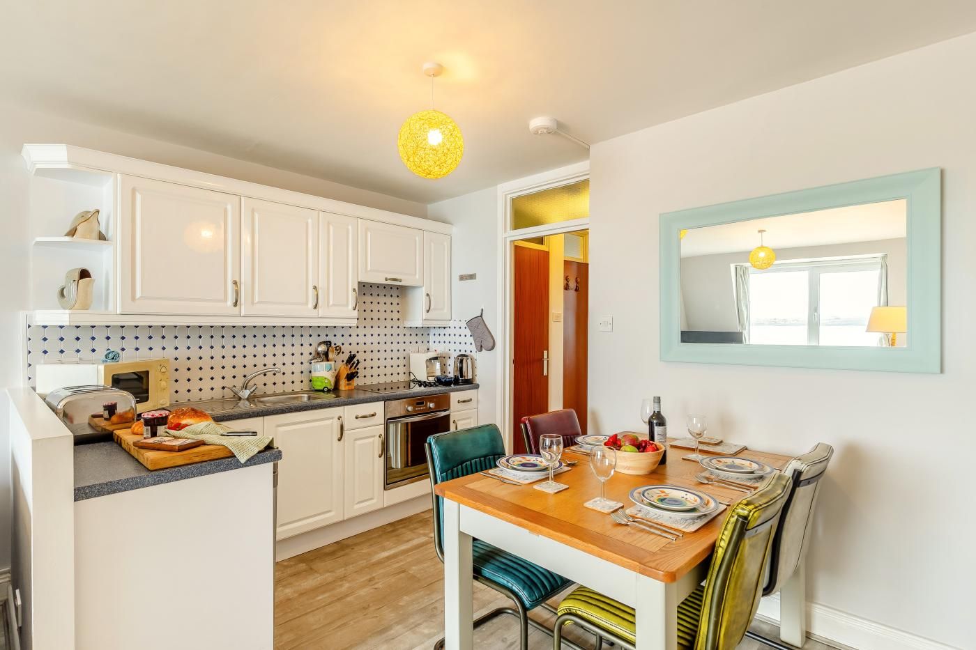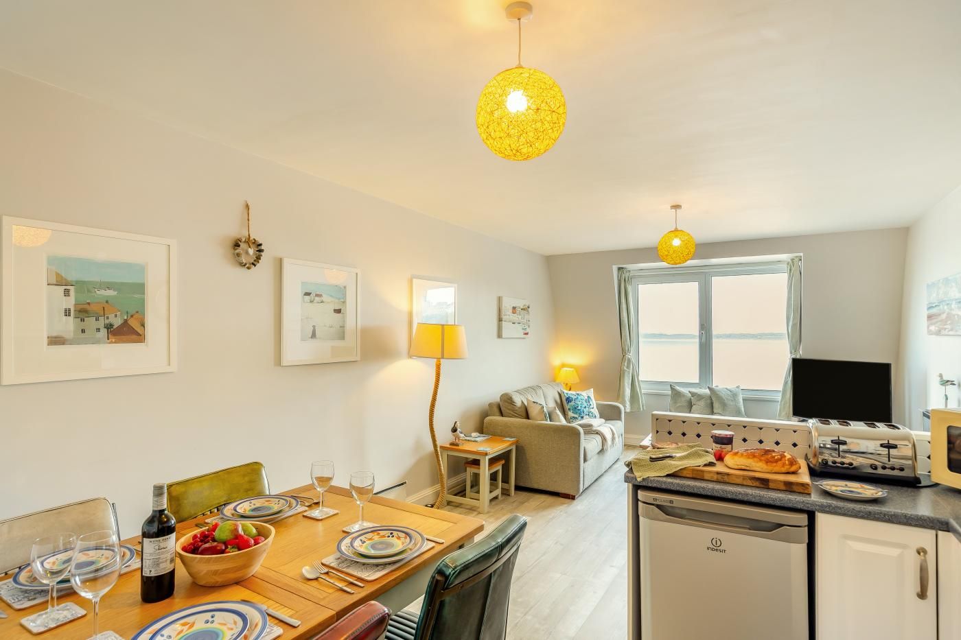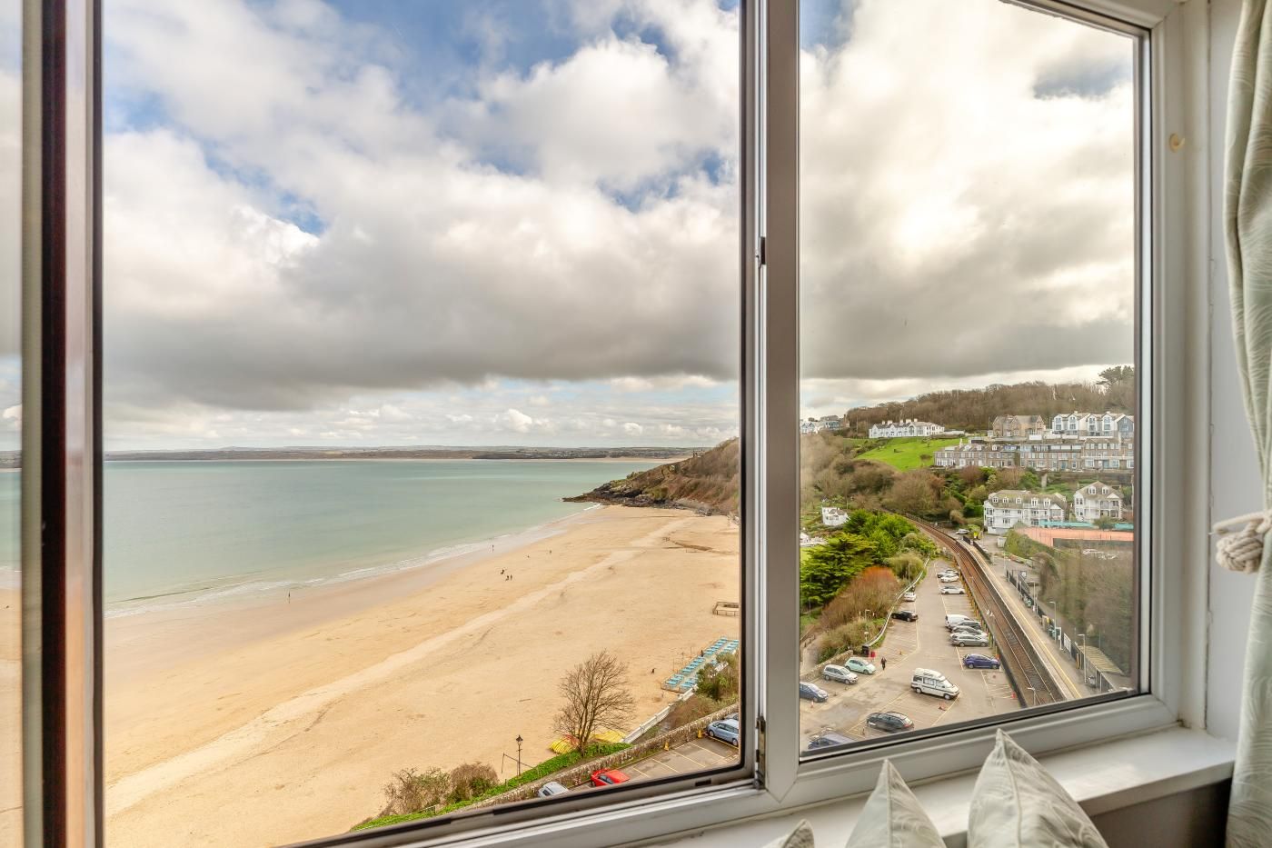 This comfortably furnished apartment offers superb sea views over Porthminster Beach toward Hayle Towans, Godrevy Lighthouse and beyond.