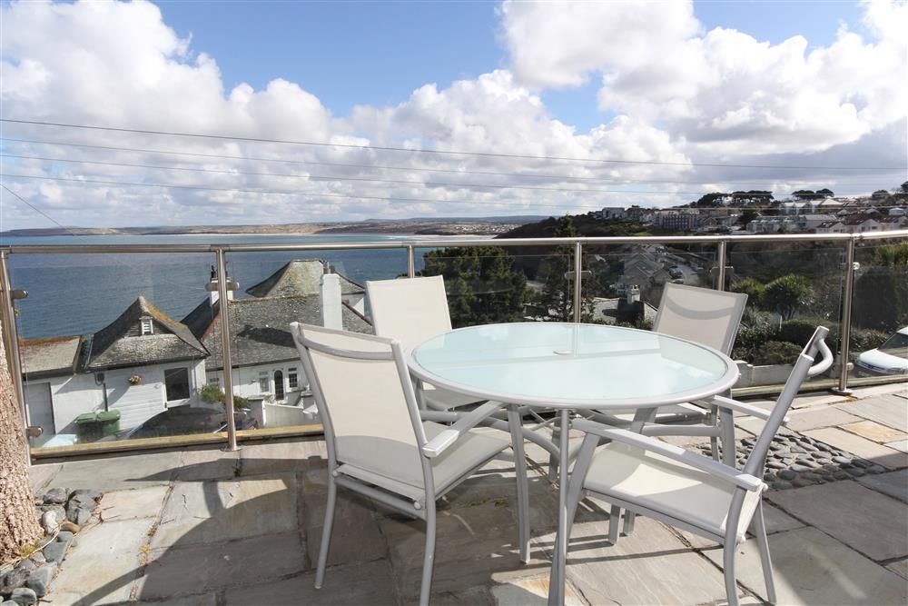 Access via 19 steps from parking area to the entrance: Lounge with Smart TV, access to balcony with superb views over Carbis Bay beach and across the bay.