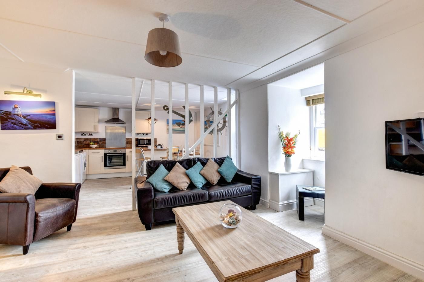 It features a light and airy living area where five can enjoy time together, while admiring the characterful nautical touches that adorn the space.
