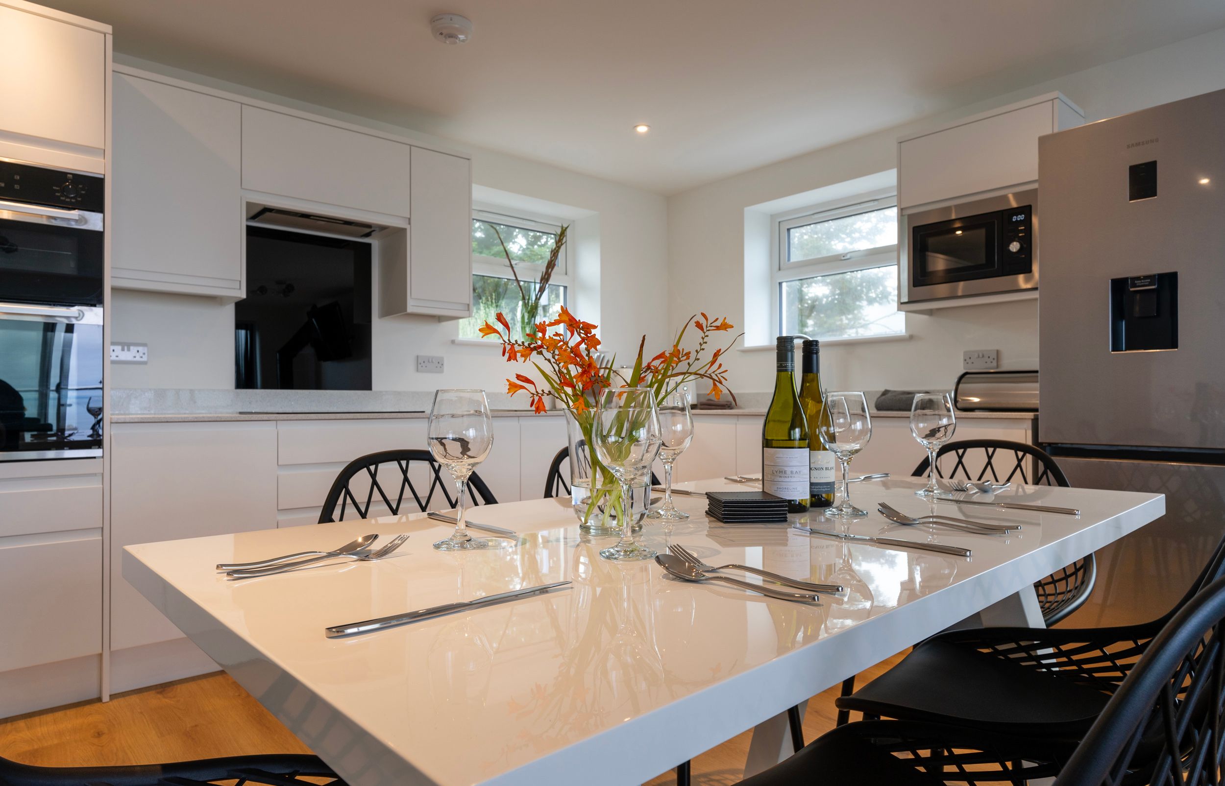 Accomodation Details Reverse-level. Three bedrooms: 1 x ground-floor super-king-size (zip/link, can be twin on request), 1 x ground-floor king-size with en-suite walk-in shower, basin and WC, 1 x ground-floor twin (zip/link, can be super-king-size on request). Bathroom with bath, shower over, basin and WC. Shower room with walk-in shower, basin and WC on first floor. First-floor open-plan living space with kitchen, dining area and sitting area with woodburning stove. Balcony