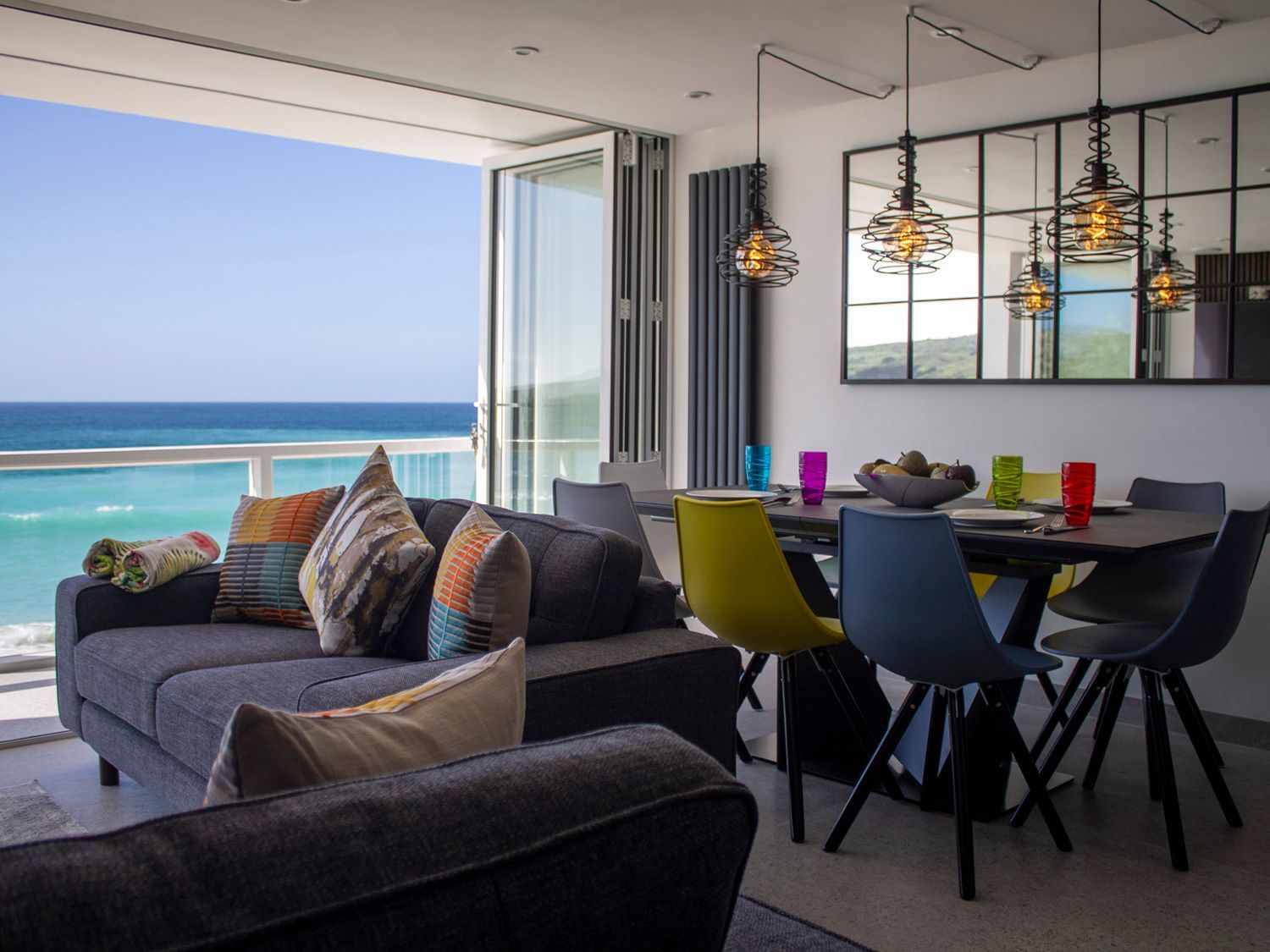 Accomodation Details First-floor beachside apartment with sea views. Two bedrooms: 1 x king-size with Smart TV, 1 x bunk room. Jack-and-Jill shower room with walk-in shower, basin and WC. Open-plan living space with kitchen, dining and sitting area. Balcony (5 meters long). Communal external laundry