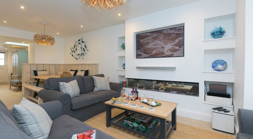 Holiday home The open-plan living space includes a kitchen housing an electric oven and hob, microwave, fridge/freezer, dishwasher, washing machine, dining seating and a sitting area with Smart TV with Sky and Sky Sports, and electric flame-effect fire. The bedrooms include a second-floor super-king-size with Smart TV and en-suite shower room, a king-size with TV and a bunk, serviced by a bathroom. To the outside there is an enclosed balcony with furniture, allocated parking for two cars, and a outdoor cold tap. Within 0.5 miles or less there is a shop, beach and pub. This property will accept one small/medium sized dog, however smoking is not allowed. Highchair, travel cot, and stairgate available. WiFi, fuel, power, bed linen and towels are all included in the price. Pebbles is a refreshing break in St Ives.