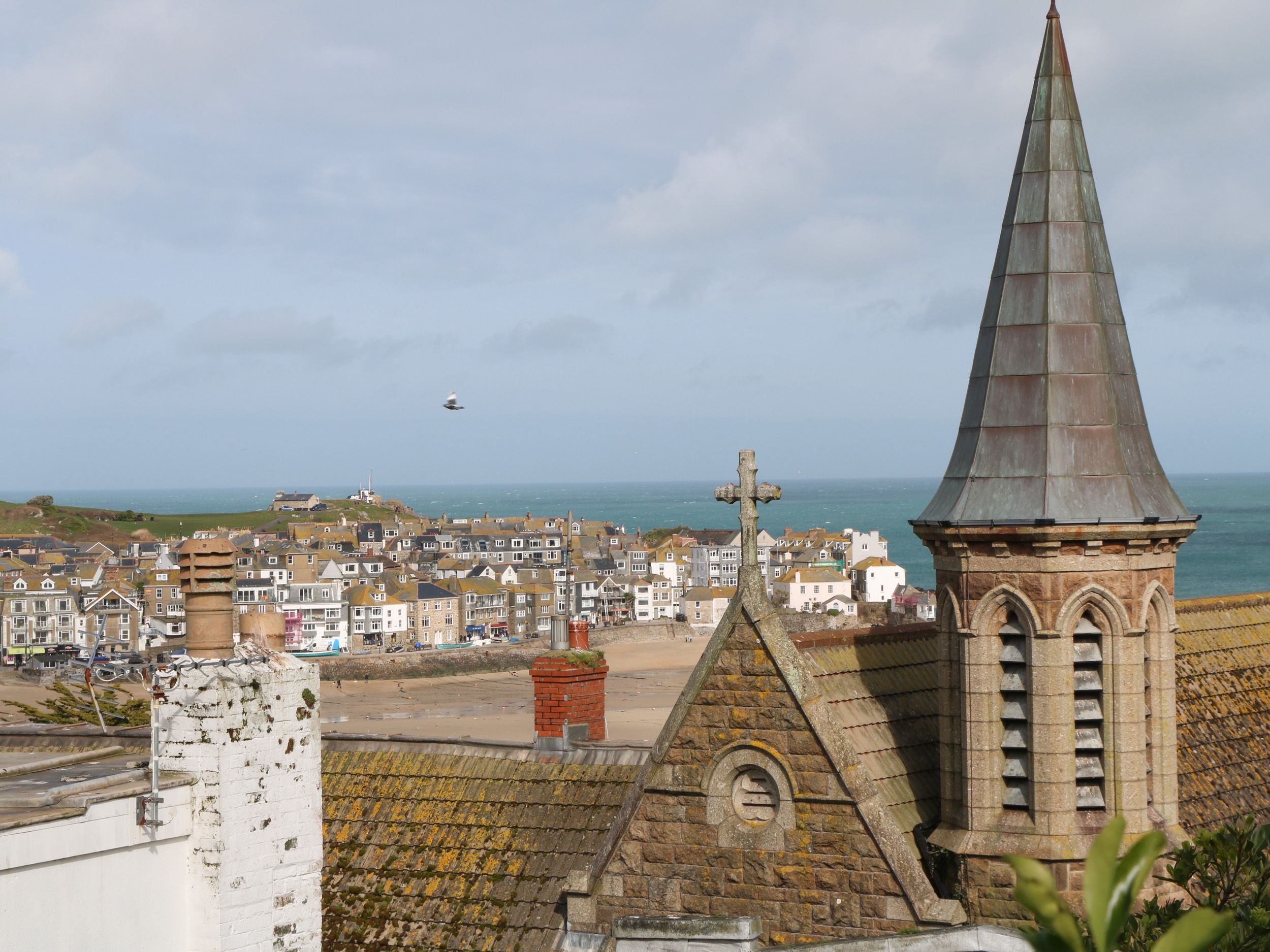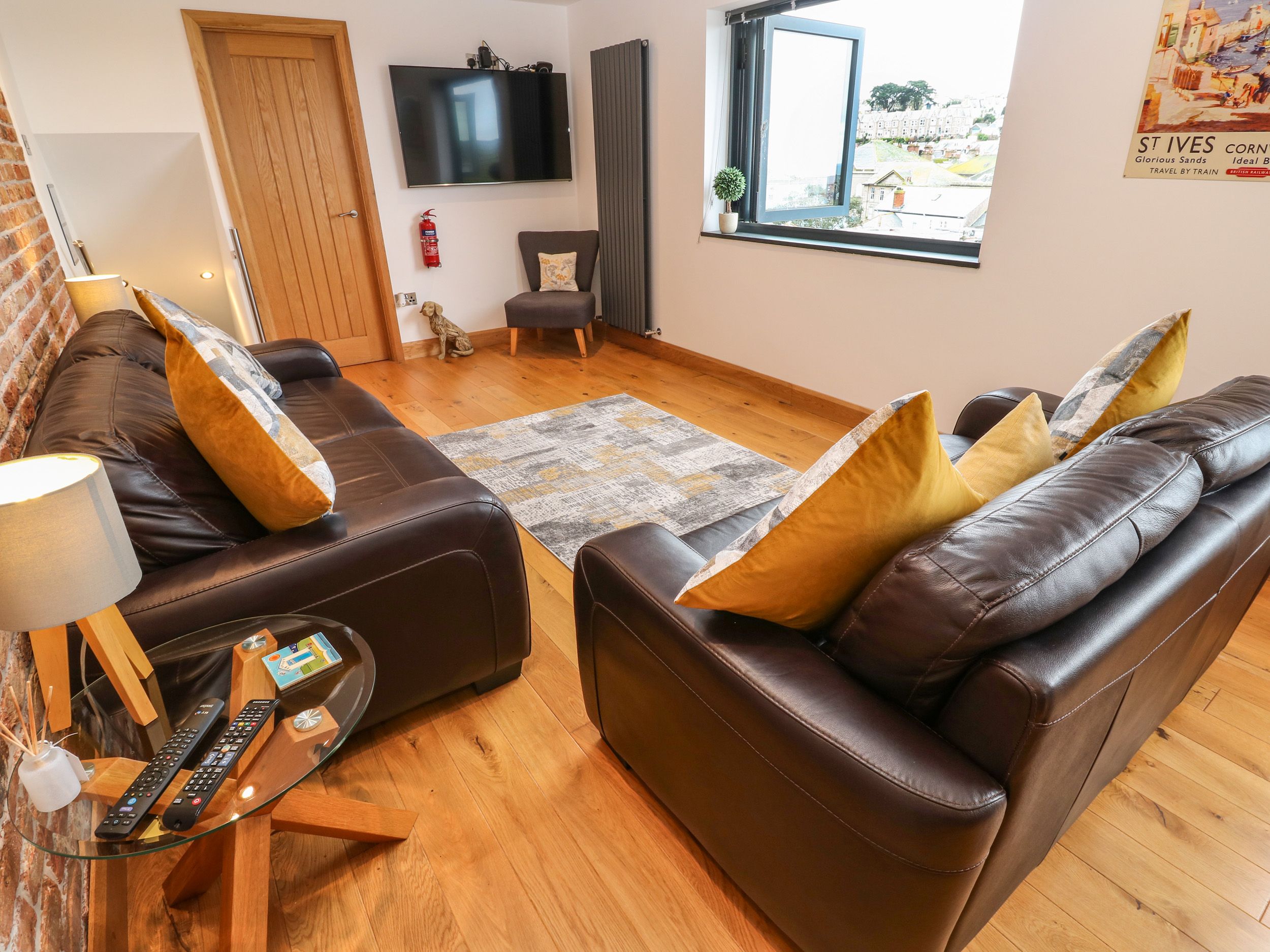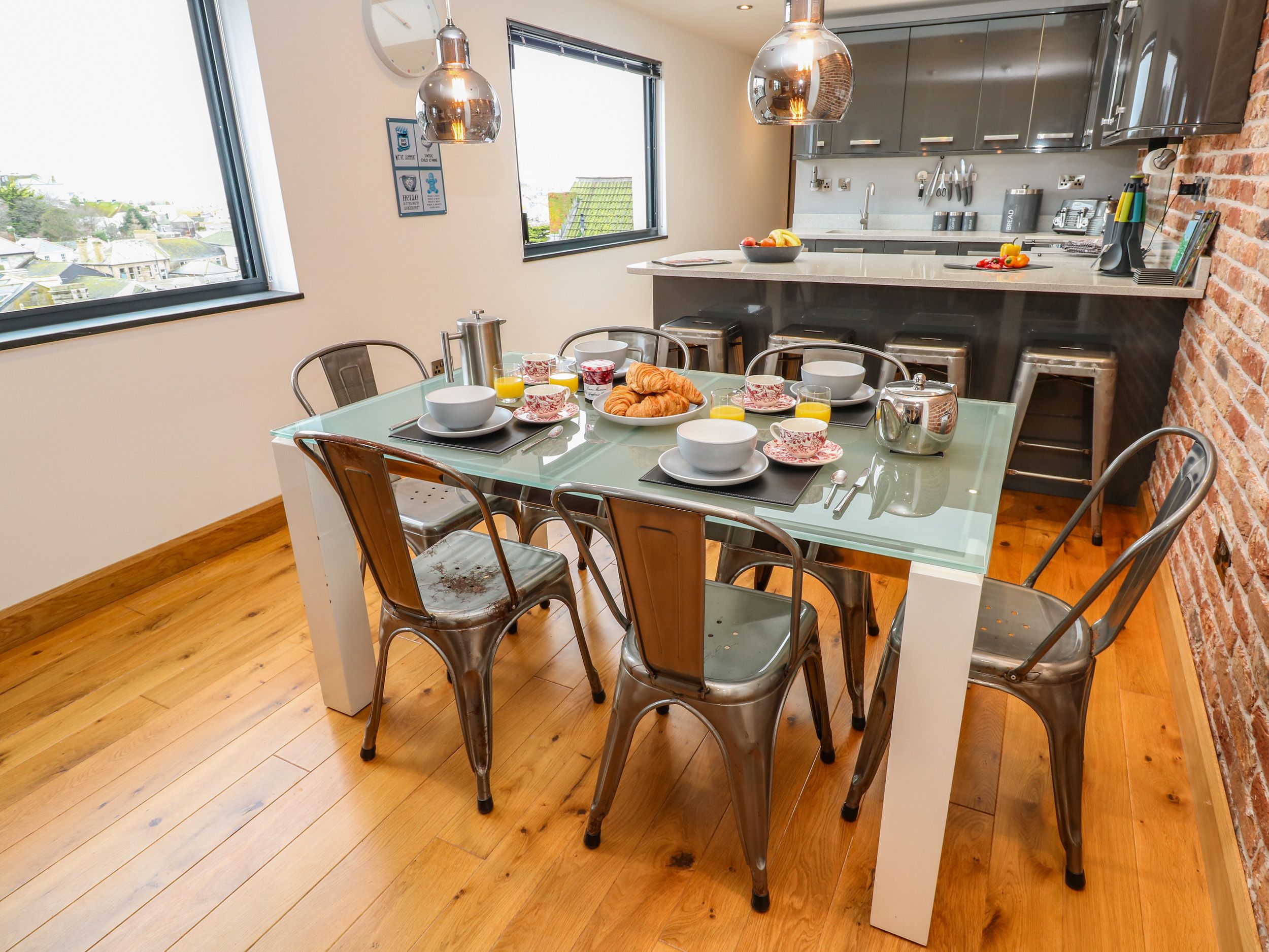 Holiday home Rooftops, a single-storey first-floor flat consists of an open-plan kitchen, living and dining area with an oven, hob, microwave, fridge, kettle, toaster, breakfast bar with seating for four, a dining table with seating for six and a sitting area with a TV. The bedrooms include a double room with a TV and serviced with an en-suite with a shower, basin, heated towel rail and WC and a twin with a TV. The bathroom consists of a bath, basin and WC. Within 0.1 miles you'll find a pub and within 0.1 miles a shop. Sorry, no pets and no smoking allowed. WiFi, fuel, power, bed linen and towels are included in the price. Rooftops is an ideal destination for your coastal Cornwall holiday. Note: There are steps to the interior.