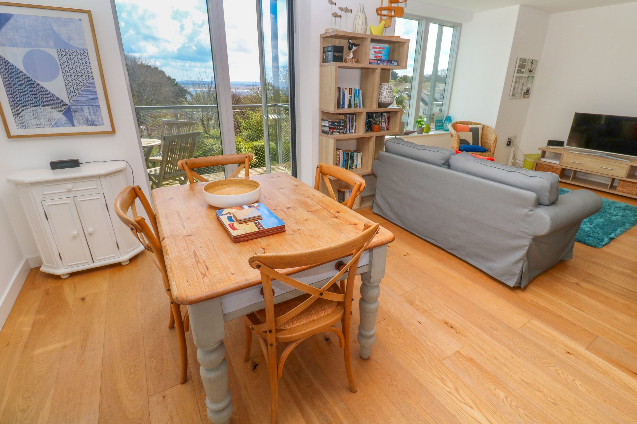 Accomodation Details First-floor apartment. Two bedrooms: 1 x king-size with TV and en-suite walk-in shower, basin, and WC, 1 x twin. Bathroom with bath, shower over, basin, heated towel rail, and WC. Open-plan living space with kitchen, dining area, and sitting area with balcony