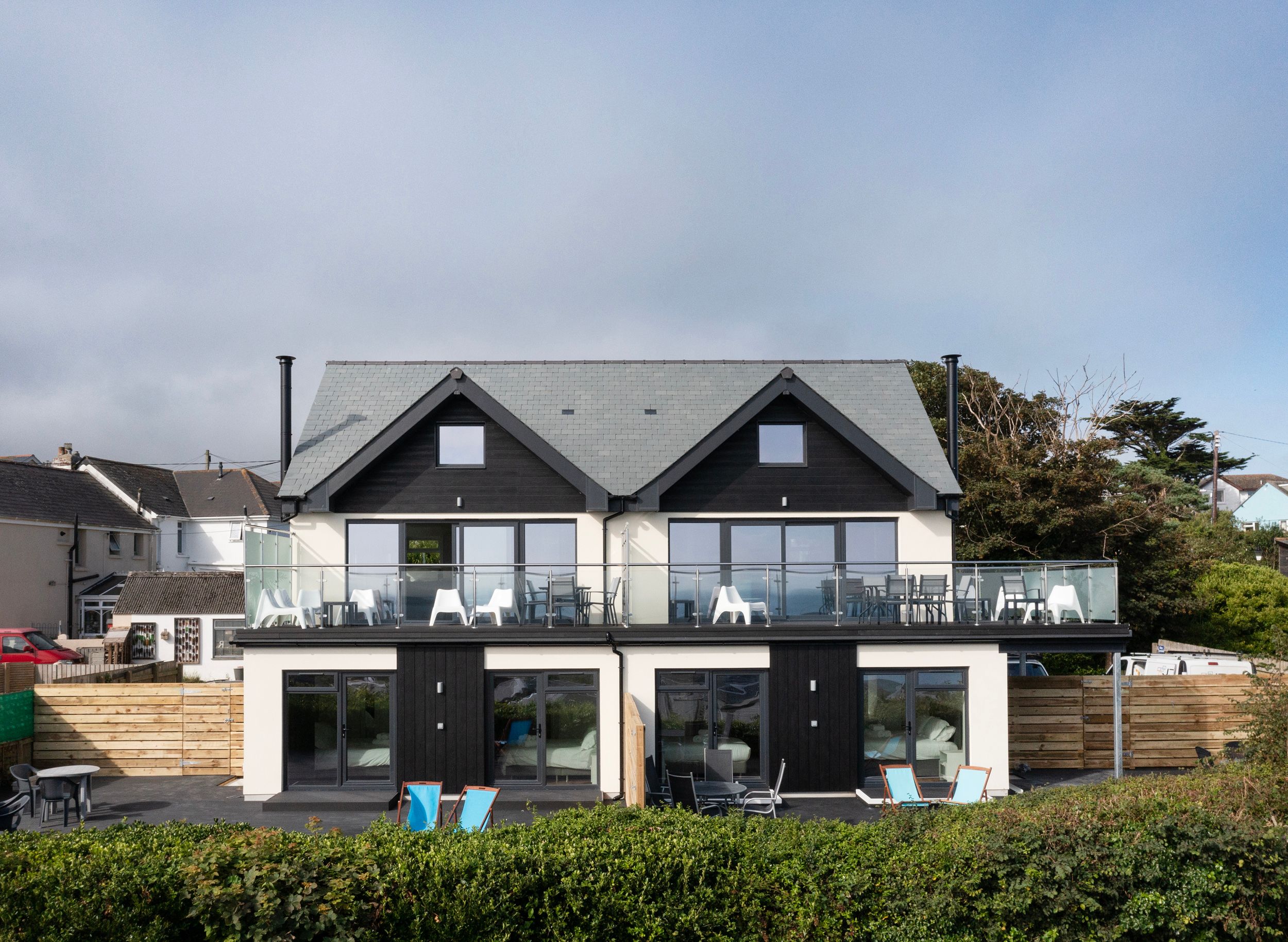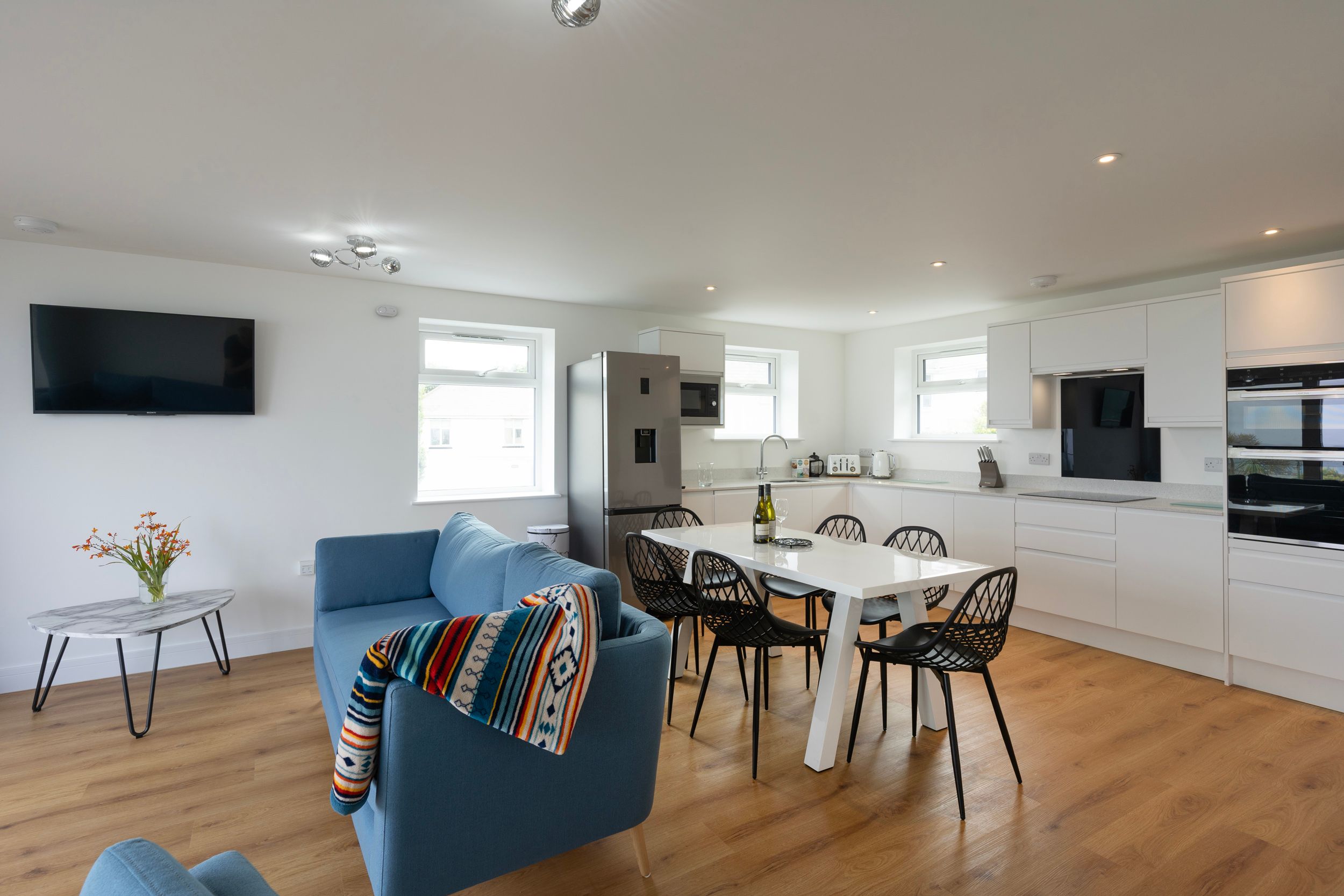 Accomodation Details Reverse-level. Three bedrooms: 1 x ground-floor super-king-size (zip/link, can be twin on request), 1 x ground-floor king-size with en-suite walk-in shower, basin and WC, 1 x ground-floor twin (zip/link, can be super-king-size on request). Bathroom with bath, shower over, basin and WC. Shower room with walk-in shower, basin and WC on first floor. First-floor open-plan living space with kitchen, dining area and sitting area with woodburning stove. Balcony