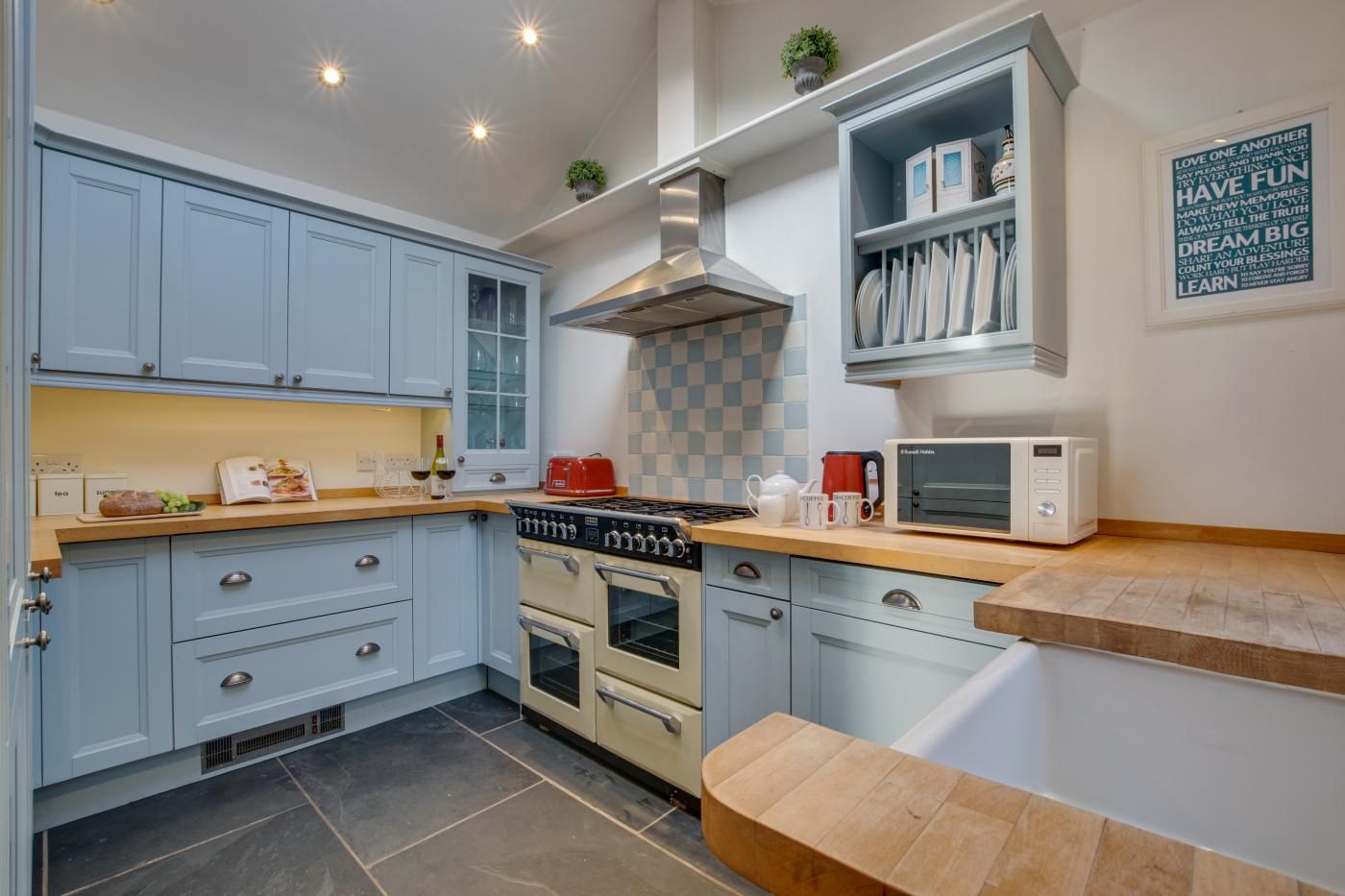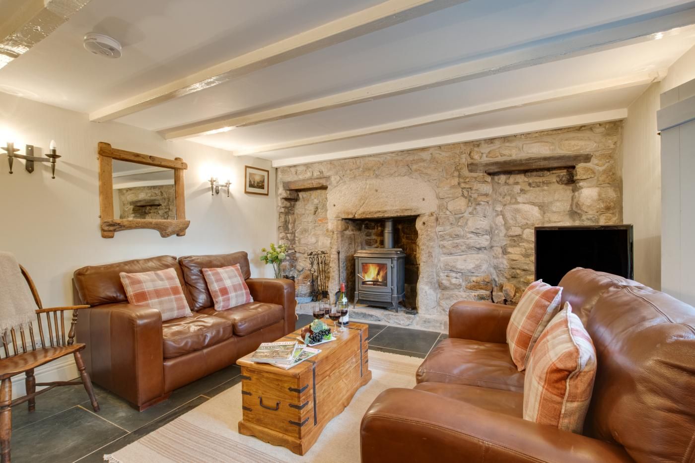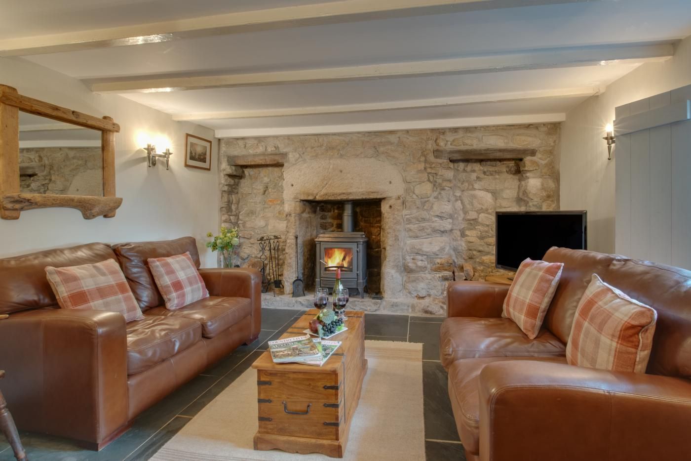 As you enter through the hall you’ll find the lounge with its grand granite fireplace housing a woodburner, luxurious leather sofas and thoughtful decor throughout which seamlessly blends the old with the new.
