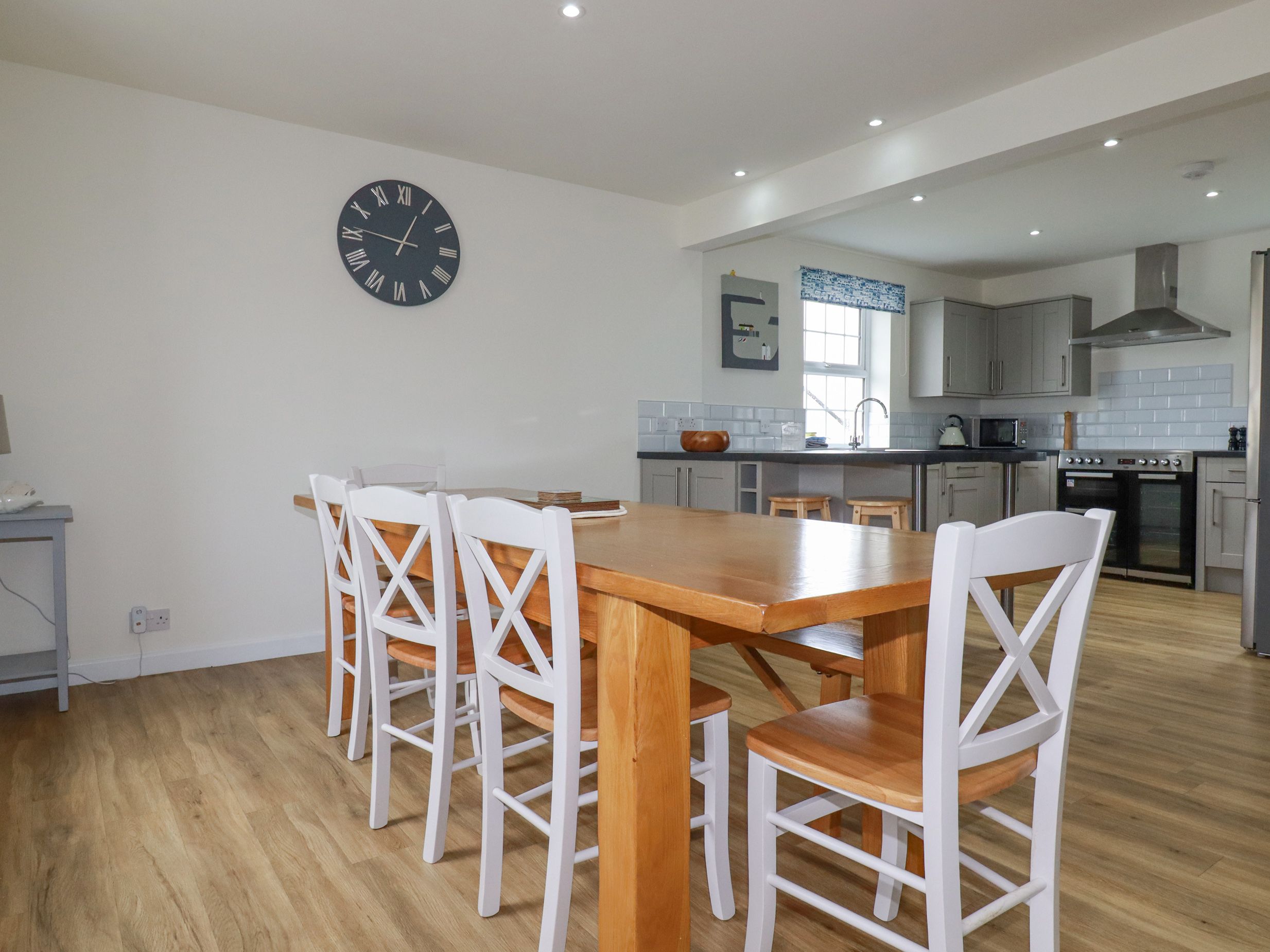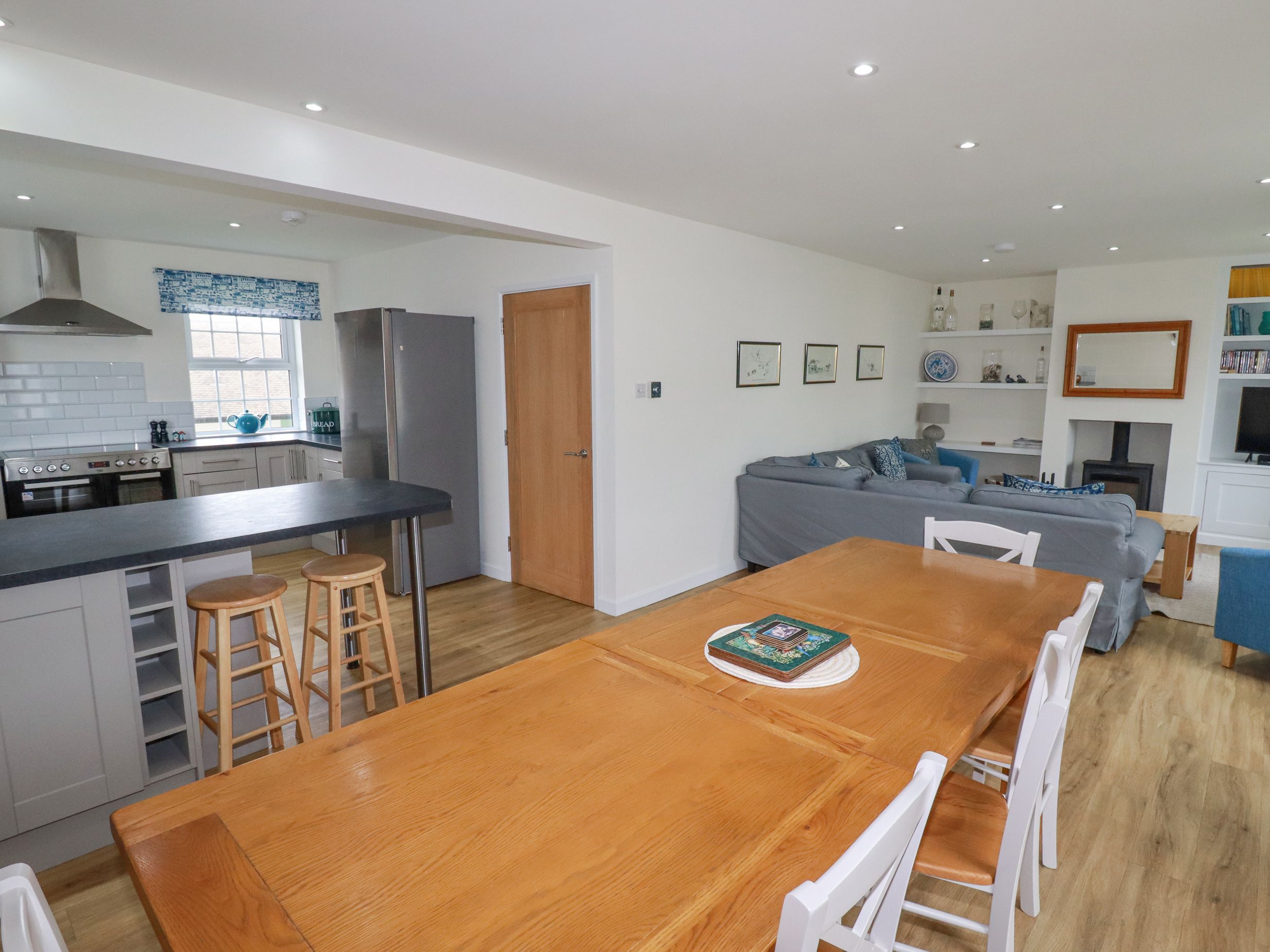 Oil central heating. Electric range cooker, microwave, fridge/freezer, washing machine, dishwasher, Nespresso coffee machine and milk frother, kettle and toaster. Smart TV, Fibre WiFi. Fuel, power and starter pack for woodburning stove inc. in rent. Log burner. Breakfast bar. Bed linen and towels inc. in rent. Travel cot and high chair provided. Off-road parking for 2 cars. Secure rear garden with furniture and barbecue. Two well-behaved pets welcome. Sorry, no smoking. Shop 1.8 miles, pub 1.9 miles, beach 2.7 miles. Note: There are drops in the grounds. Note: This property has a security deposit of £300. Note: Check-in is from 4pm, check-out by 10am