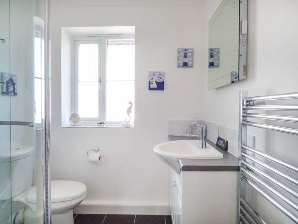 Three bedrooms: 1 x super king-size double, 1 x small bunk room with adult size mattresses.. Shower room with large shower, basin and WC. Ground floor basin and WC. Kitchen with dining area. Sitting room with a low-rise three seater sofa.