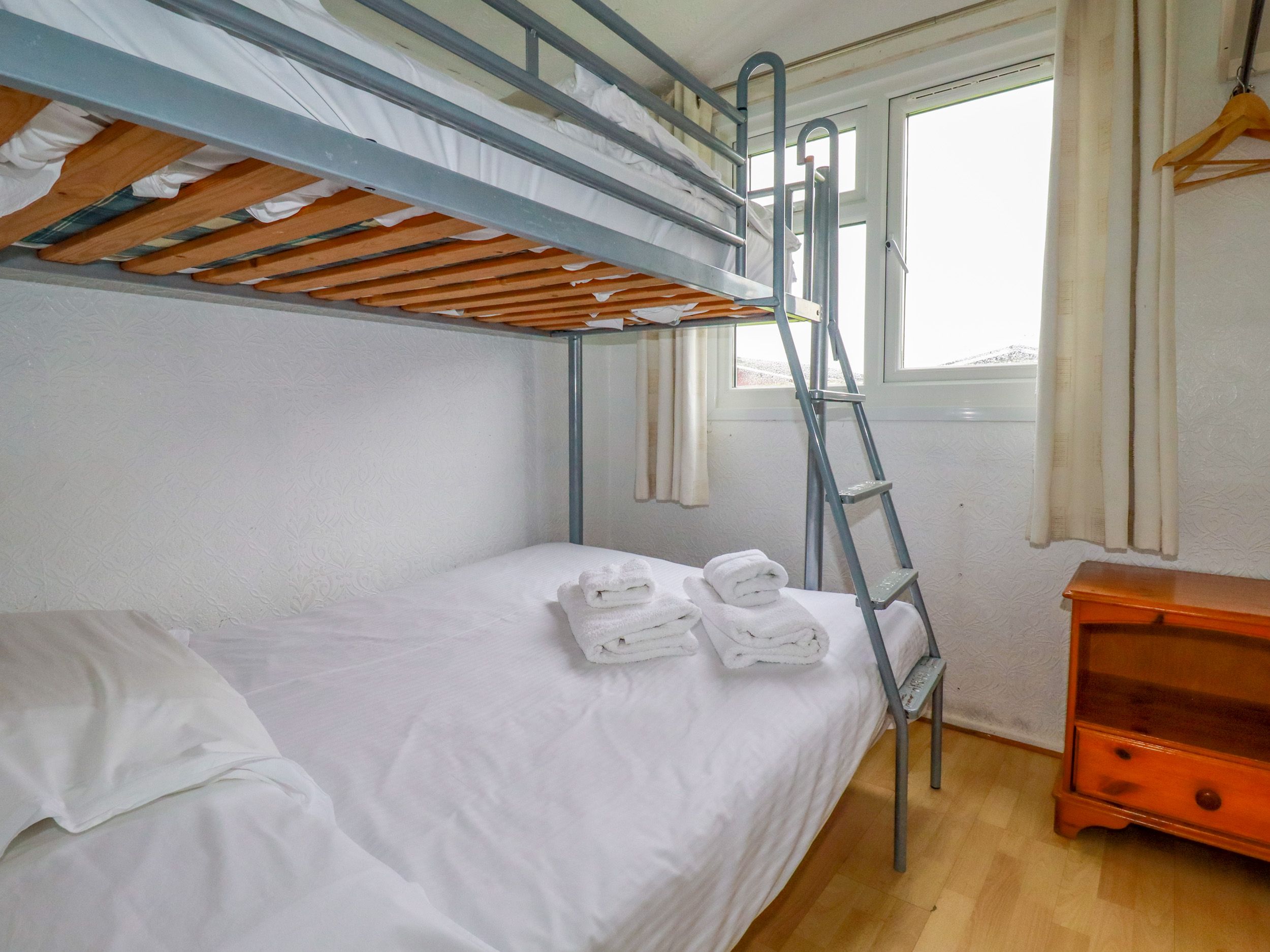 Holiday home Chalet H1, a single-storey abode, consists of an open-plan living space including a kitchen with an electric oven and hob, microwave, fridge, a dining area and a sitting area with TV. The bedrooms consist of a double and a triple bunk (double below, single above), along with a bathroom. Outside, there is a patio area with furniture, plus off-road parking for two cars. WiFi, fuel, power, bed linen, and towels are all included in the price. Sorry, no pets and no smoking. Shop and pub 0.7 miles, beach 2.9 miles. Make special memories with all the family at Chalet H1. Note: When arriving at the property, if you sign in at reception you will have access to on-site WiFi, coverage can be intermittent on occasions.