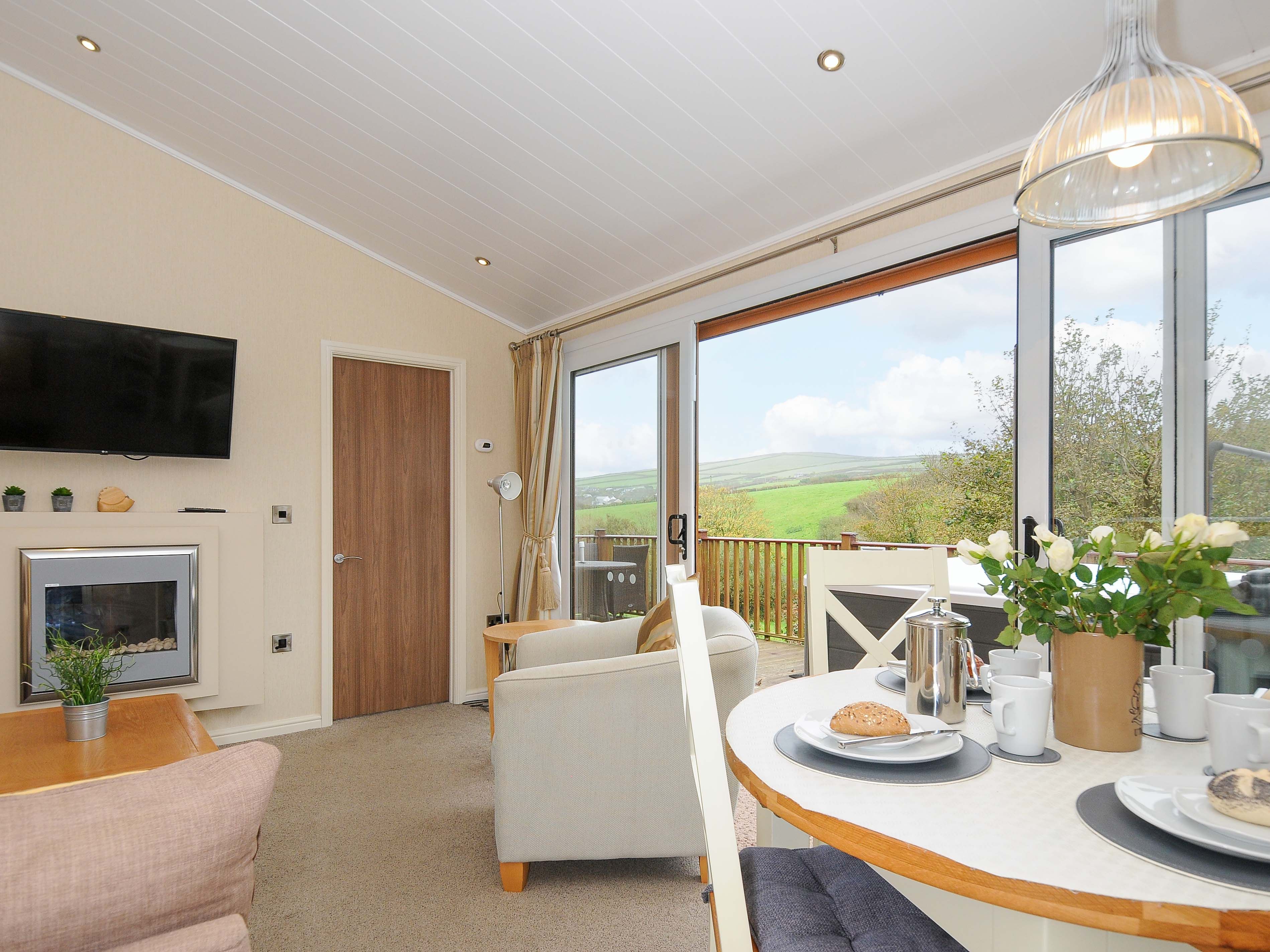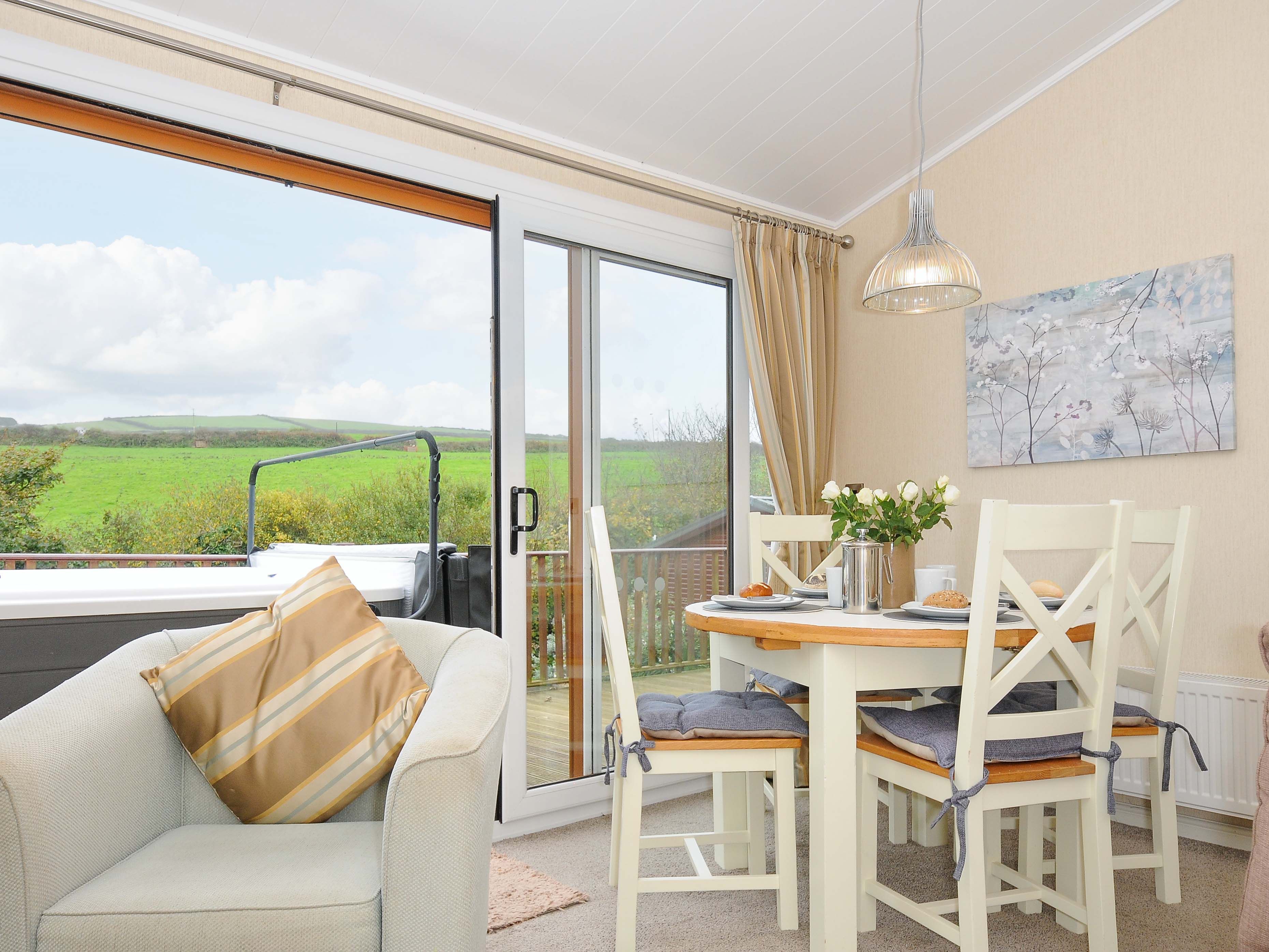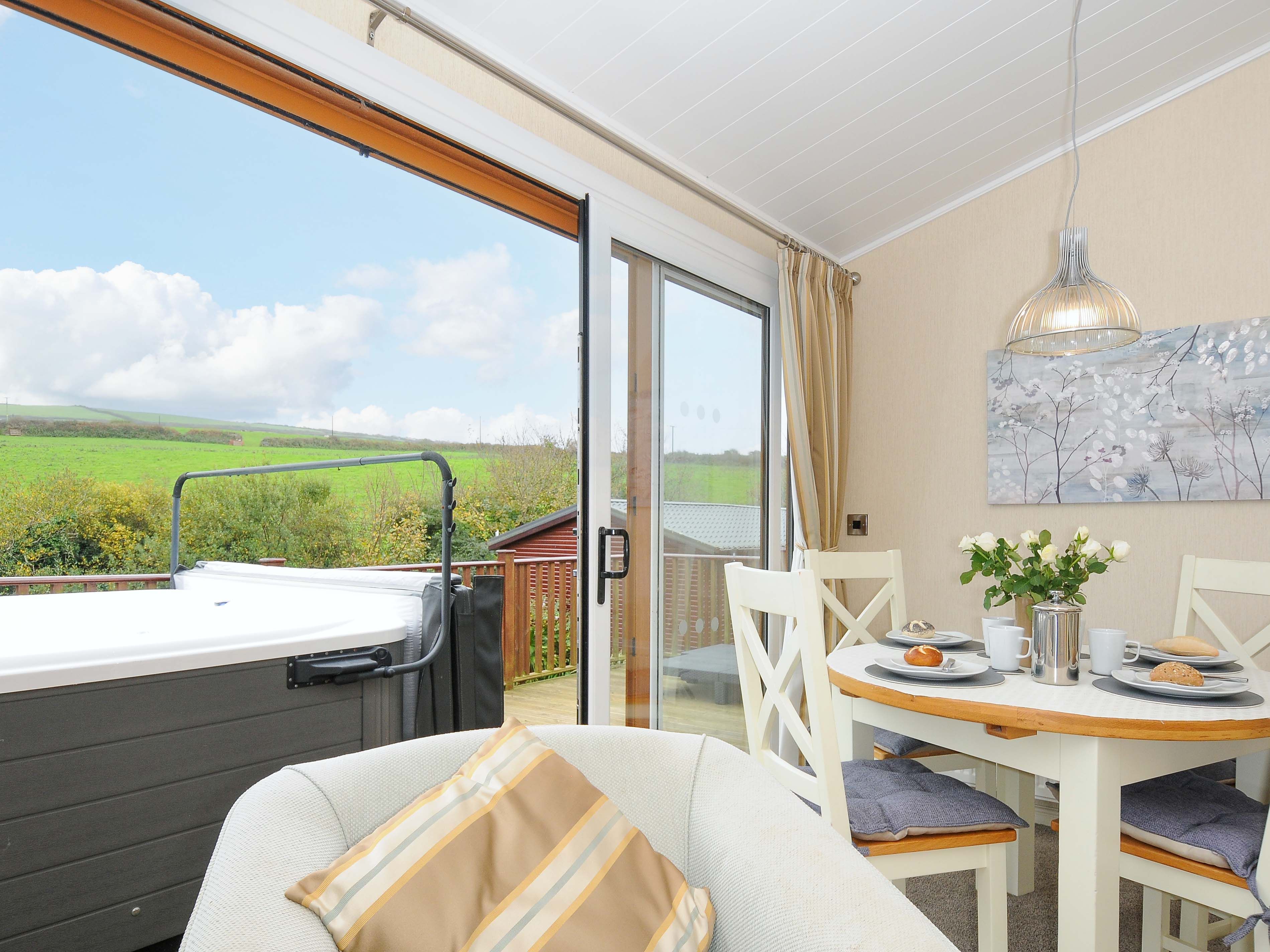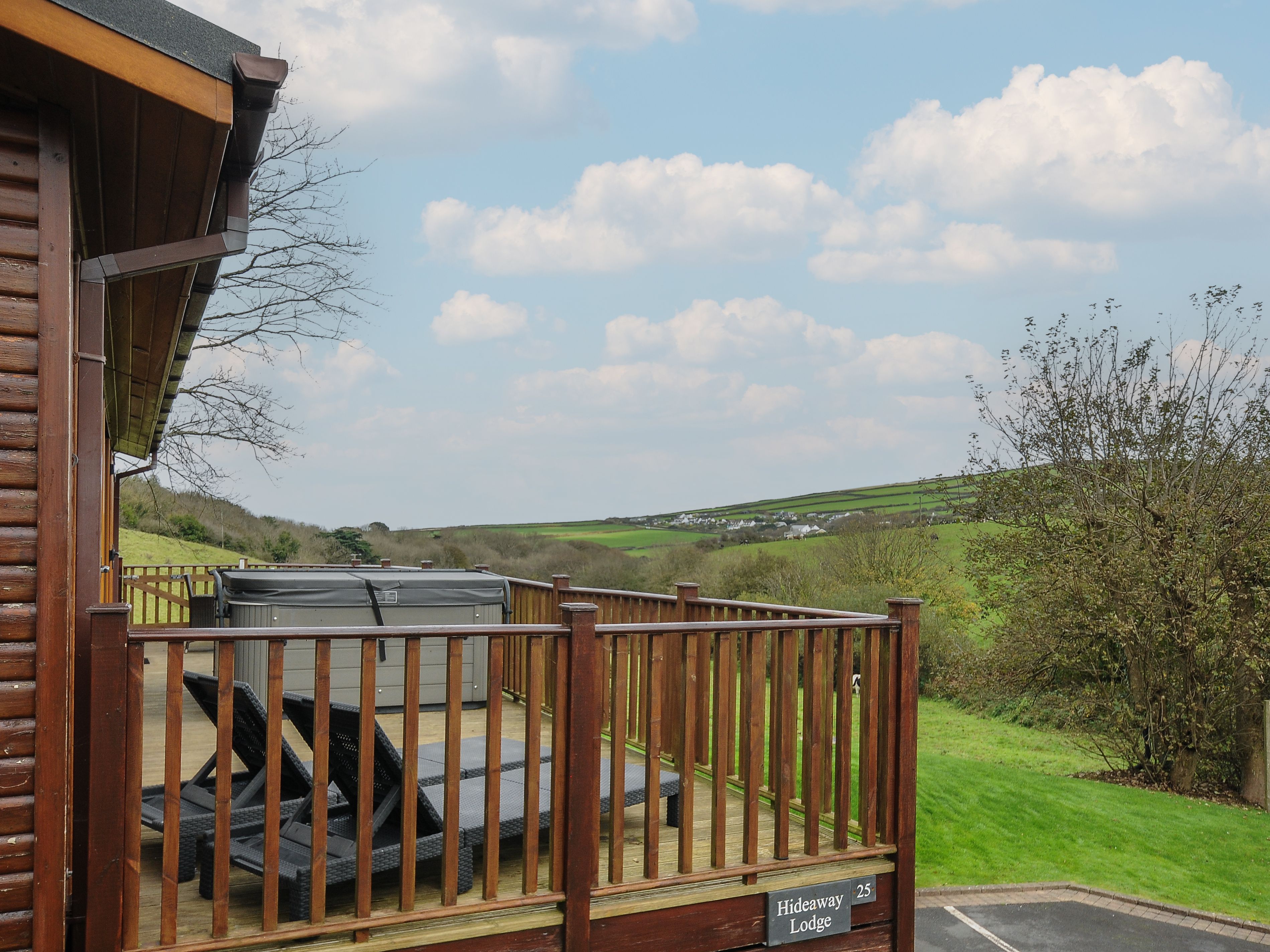 Holiday home Hideaway Lodge, a single-storey lodge with open-plan kitchen, dining and sitting area with; electric fire, 1 king-size bedroom, and 1 twin, both with en-suites. Appliances consist of an electric oven, gas hob, microwave, fridge/freezer, washer/dryer, dishwasher, 2 TVs with Freeview and a selection of books, games, and DVDs. Outside there is an enclosed decked area with furniture and hot tub, off-road parking for one & additional parking near reception. No smoking and no pets. WiFi, fuel, power, bed linen and towels are included. You'll find a shop in 0.6 miles, a pub in 0.8 miles, and beach in 0.2 miles. Steps to the exterior, please take care. No stag, hen, or similar parties. This property can only accept check ins on a Monday, Friday or Saturday, any other check in day is by request only. This property cannot accept Sunday check ins. This property has a 4 night min stay and there is a compulsory £25 supplement for use of the hot tub, if you don't wish to use the hot tub during your stay, please contact us