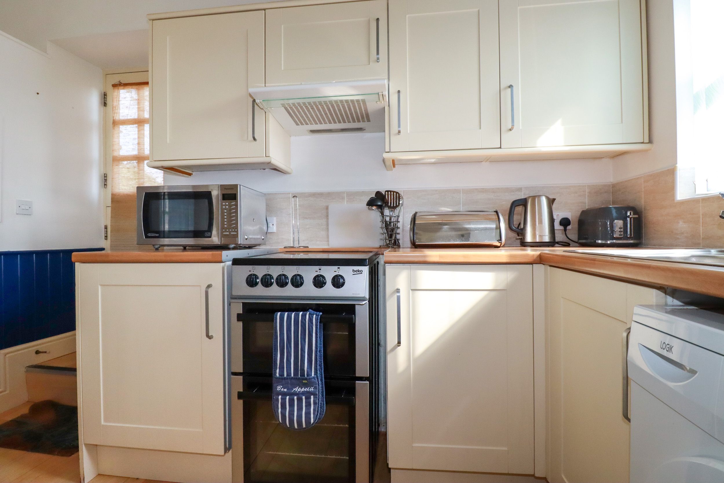 Amenities Electric heating, including a smart meter. Electric oven, hob, microwave, fridge, freezer, washing machine. Freeview TV, DVD player, and WiFi. Bed linen and towels inc. in rent., however please bring your own beach towel. Highchair and travel cot available on request. Private parking for 1 car. Private rear terrace with gravel, and furniture. Clothes line available. One well-behaved dog welcome, £25 per pet per week. Sorry, no smoking. Shop 1.3 miles, pub 4.5 miles. Note: There is a slight level change in the floor near bedrooms. Note: Check-in from 4pm, check-out by 10am. Note: Further gardens are shared with other properties on-site. Note: This property has a Good Housekeeping Bond of £125. Note: Property only takes a minimum 3 night short breaks