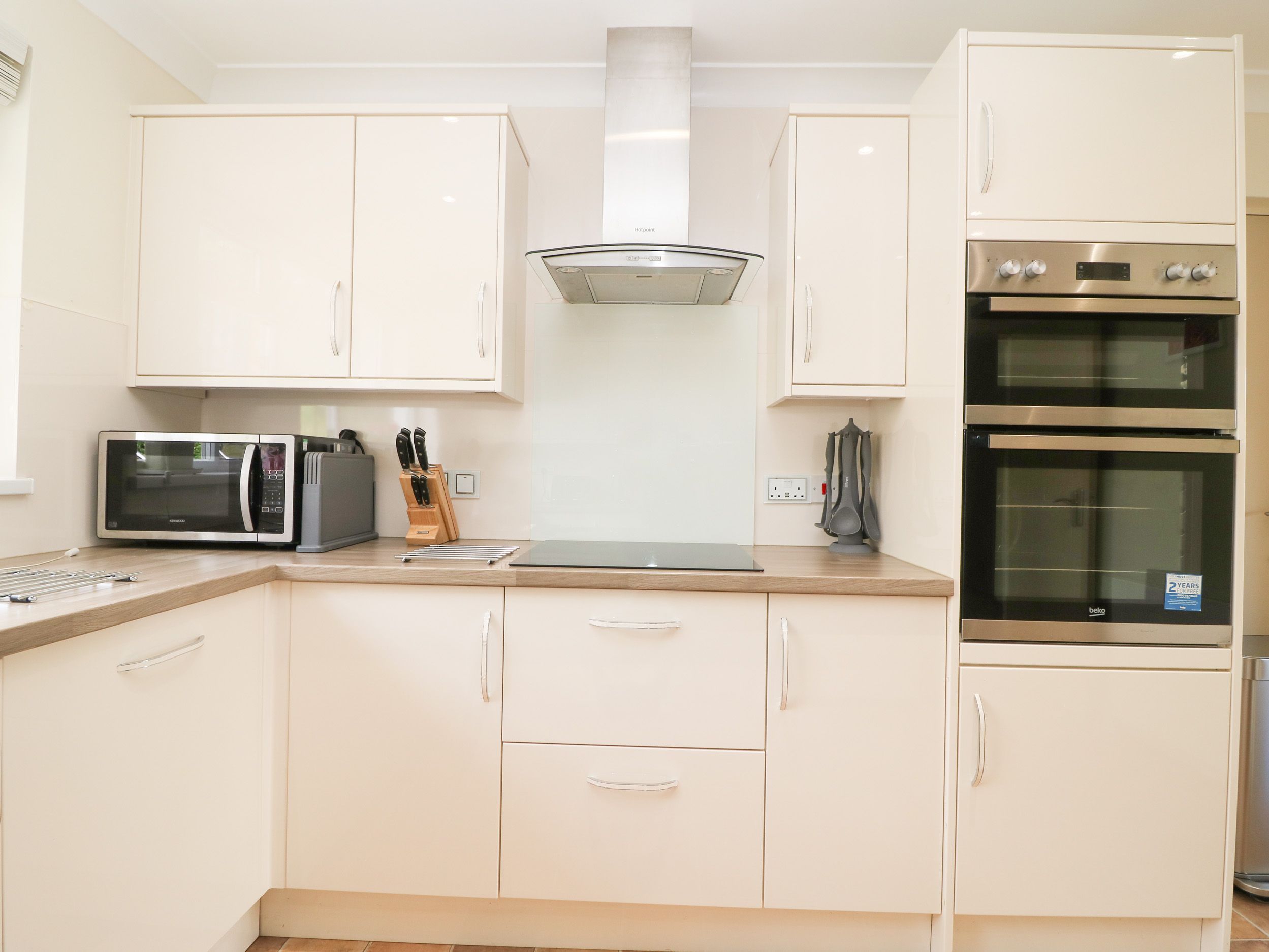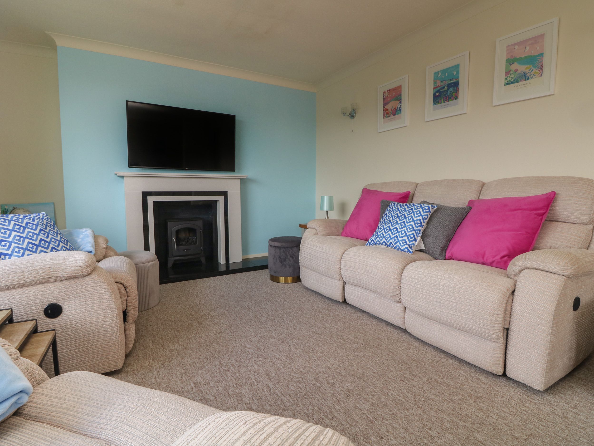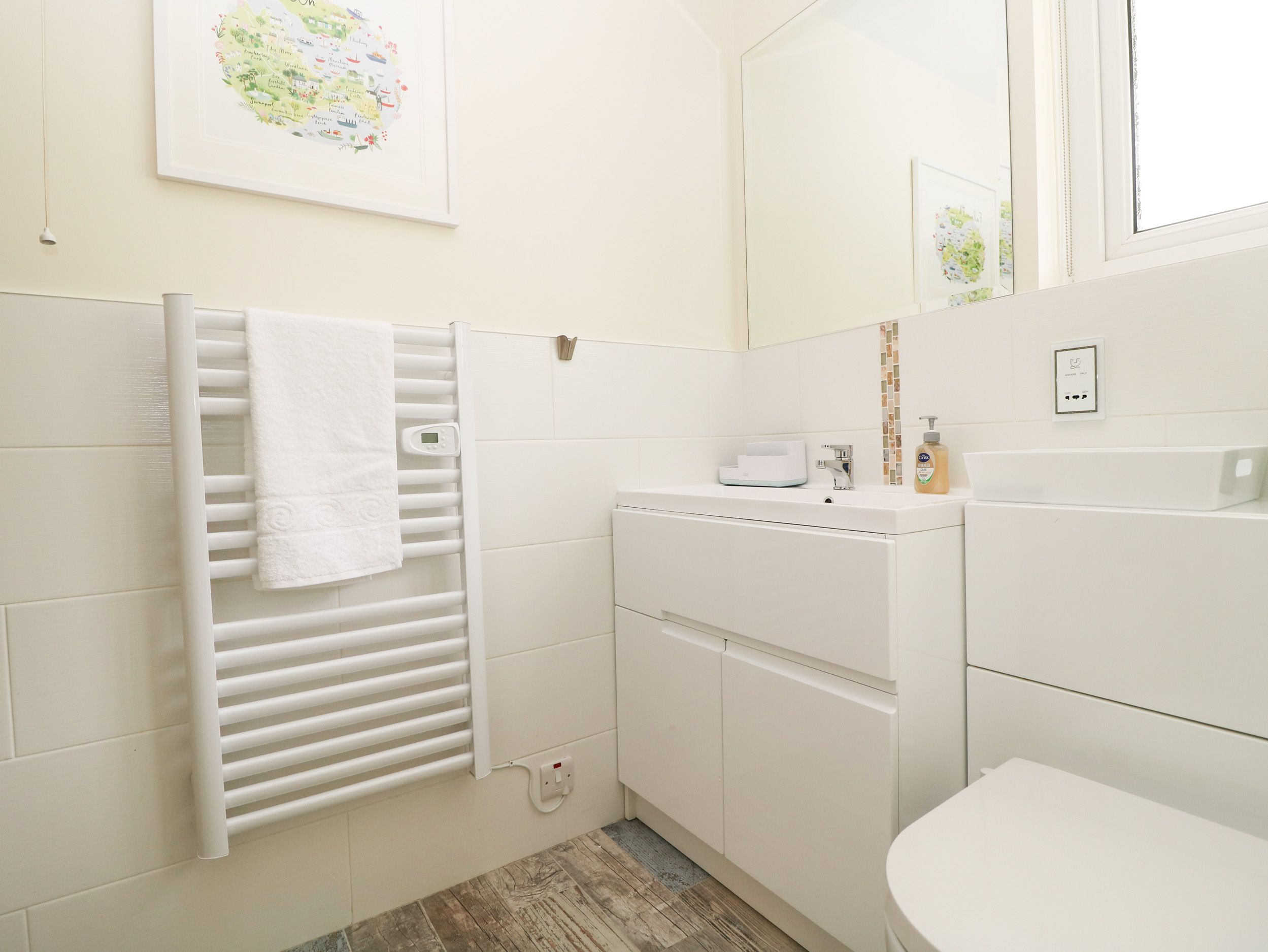 Accomodation Details Three bedrooms: 1 x super-king-size with TV, 1 x twin (zip/link, can be super-king-size on request) with TV, 1 x lower-ground-floor king-size with TV. Shower room with walk-in shower, basin and WC. Kitchen. Living/dining room with electric fire. Decked balcony. Lower-ground-floor bathroom with bath, shower over, basin, heated towel rail and WC.