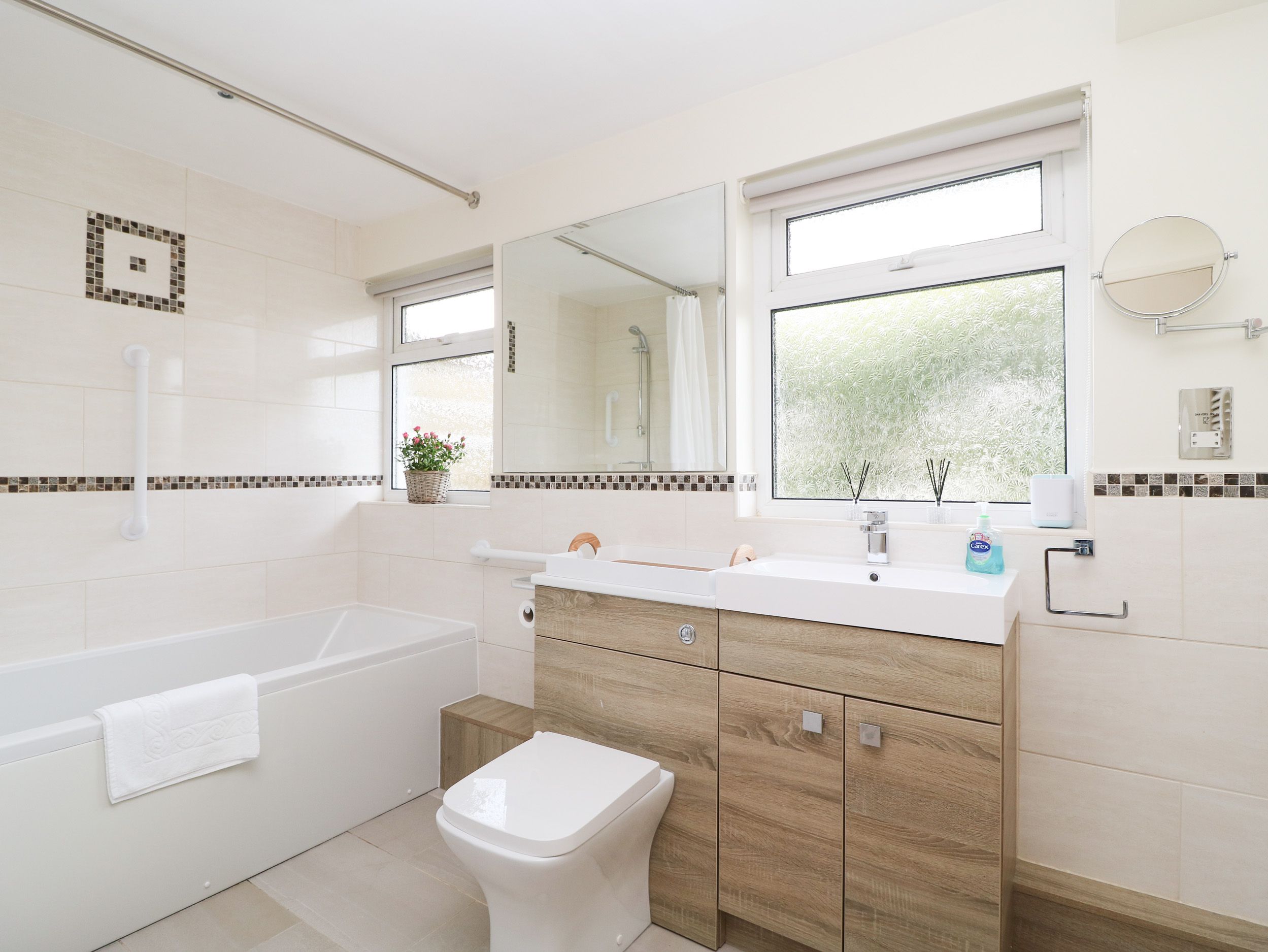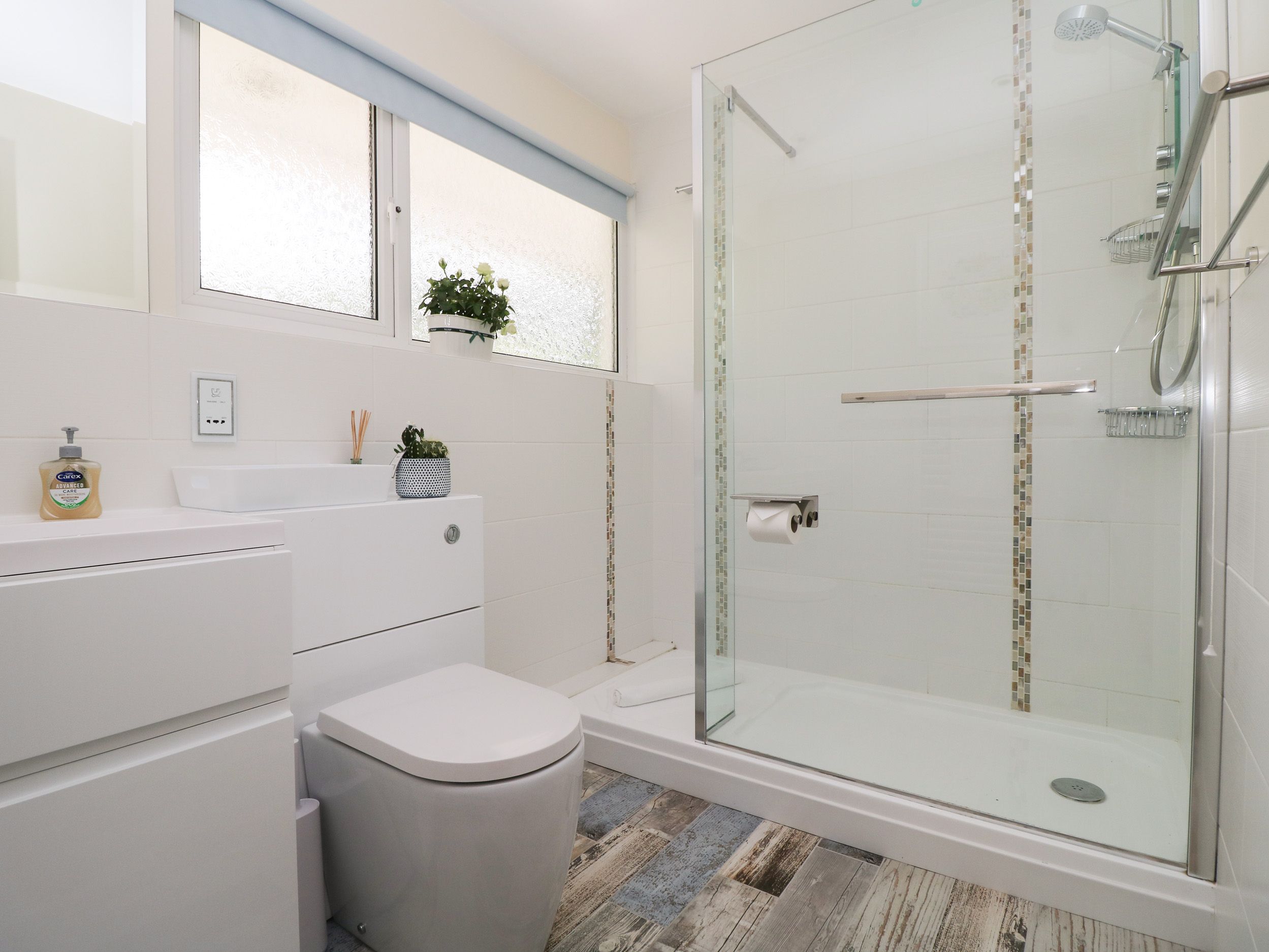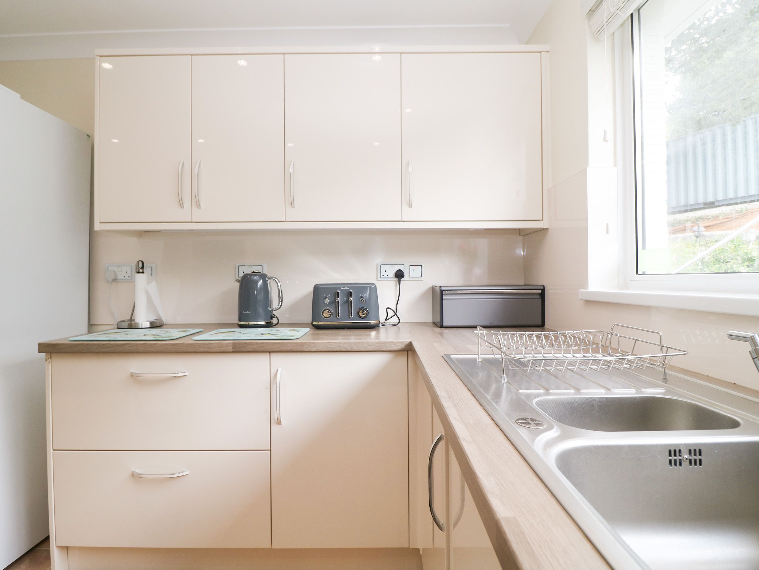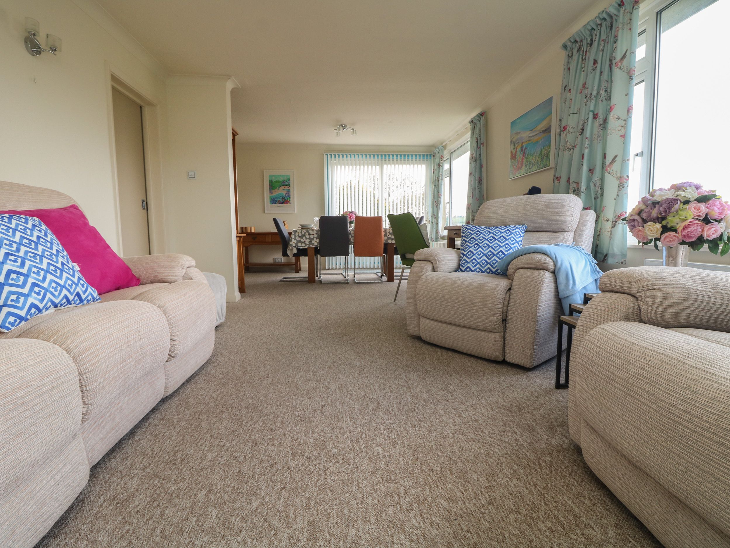 Accomodation Details Three bedrooms: 1 x super-king-size with TV, 1 x twin (zip/link, can be super-king-size on request) with TV, 1 x lower-ground-floor king-size with TV. Shower room with walk-in shower, basin and WC. Kitchen. Living/dining room with electric fire. Decked balcony. Lower-ground-floor bathroom with bath, shower over, basin, heated towel rail and WC.