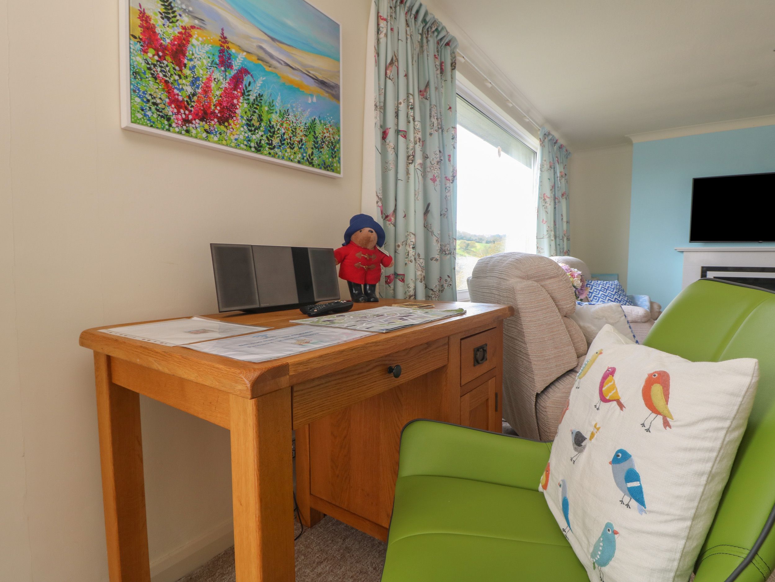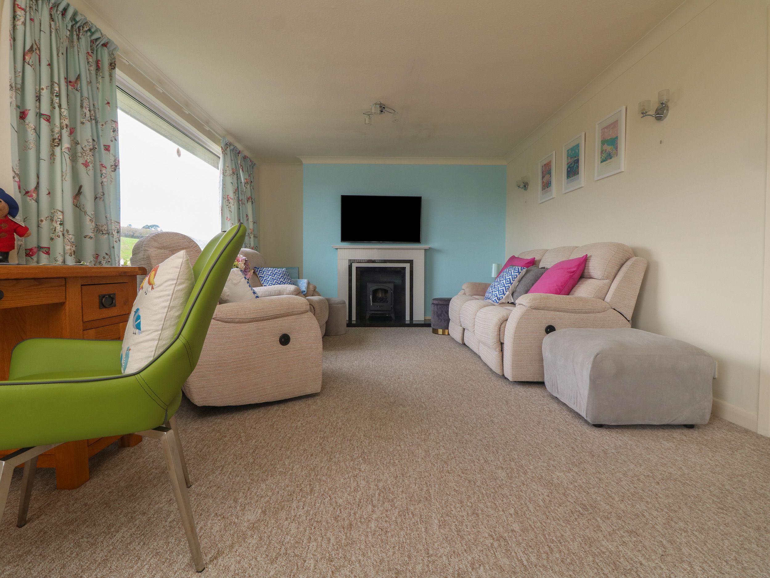 Amenities Oil central heating with electric fire. Electric oven and hob, microwave, fridge/freezer, dishwasher, washing machine. TV and WiFi. Fuel and power inc. in rent. Bed linen and towels inc. in rent. Off-road parking for two cars. Decked balcony and sun terrace with furniture. Sorry, no pets and no smoking. Shop 2.1 miles, pub 1.3 miles, beach 1.6 miles. Note: Guests are not permitted beyond the wooden fence in the garden due to steep drops - children must be supervised. Note: Some steps down to the garden are steep and uneven. Note: The owner lives in the neighbouring annexe - there is an interconnecting door that is permanently locked. Note: The property across the road is having extensive building works completed.