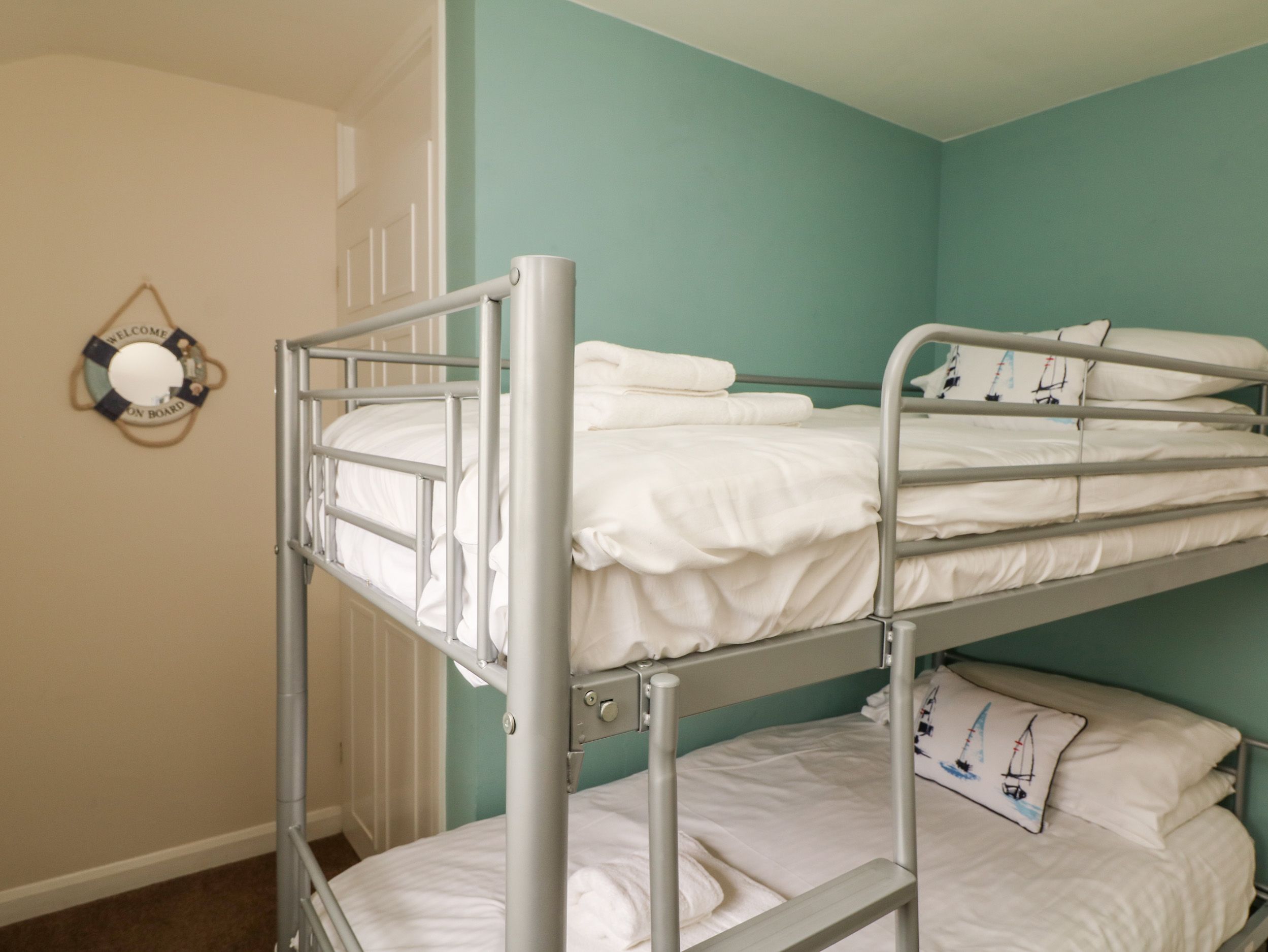Three bedrooms: 1 x king size double with TV, 1 x twin (zip/link to super king on request) with TV and en-suite basin and WC, 1 x bunk room. Bathroom with bath, shower over, basin and WC. Open plan living space with sitting area with electric fire and dining area. Kitchen.