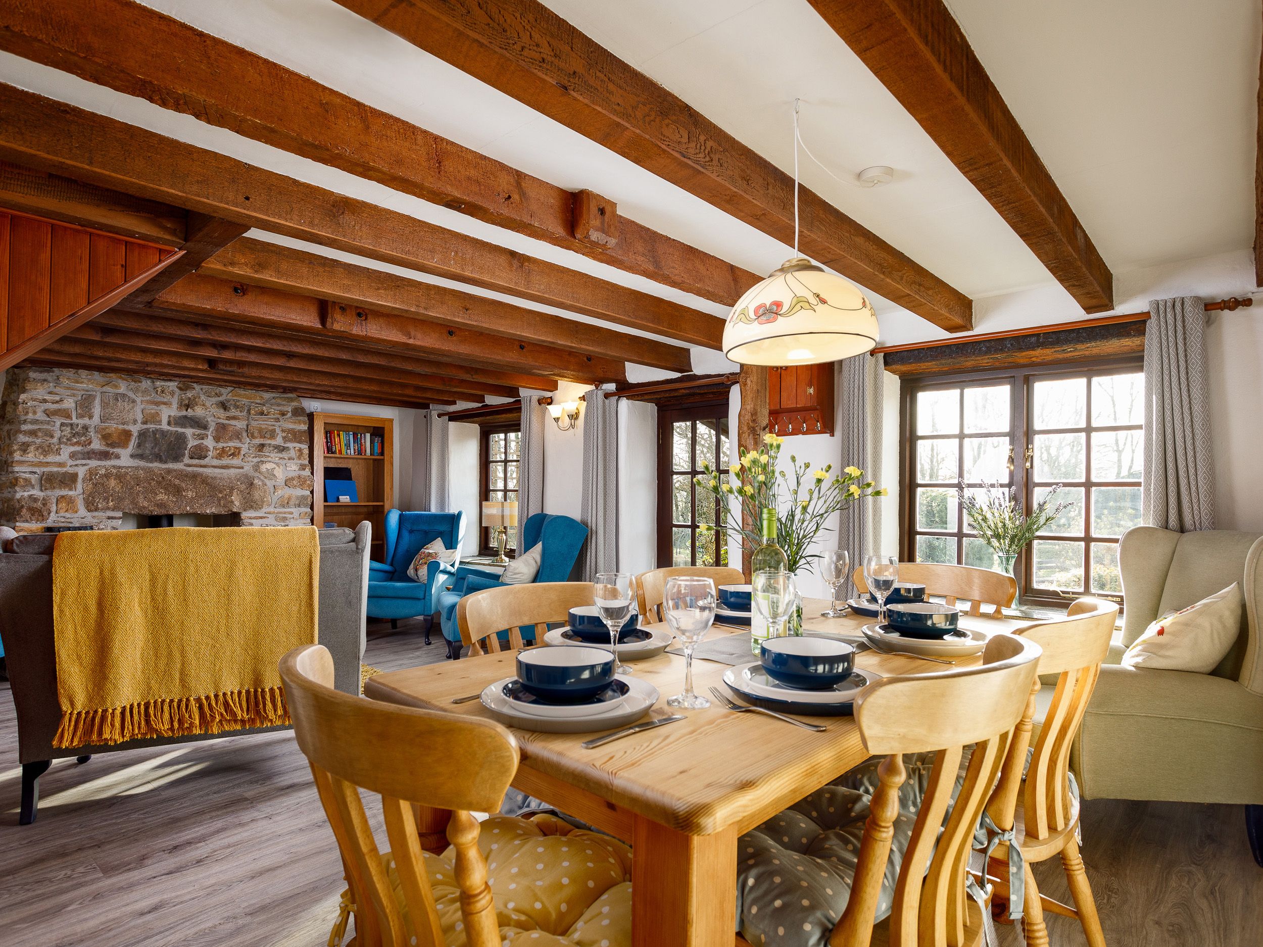 Electric heating with woodburning stove. Electric oven and hob, microwave, fridge, washer/dryer, dishwasher, smart TV, superfast Wifi, docking station, selection of books and games. Fuel, power and starter pack for wood burner inc. in rent. Bed linen and towels inc. in rent. Cot and highchair available. Table tennis, darts and communal freezer available in open fronted barn. Children's play area, boules, BBQ and fire pit. Off road parking for two cars. EV charging point available. Gold Award for Green Tourism 2021. Three well-behaved dogs welcome £20 supplement applies per pet, fenced garden. Sorry, no puppies or cats allowed at the property. Sorry no smoking. Shop and pub 3 miles. Coast 5 miles. Note: This property has a 4pm check in time. Note: This property has some low beams, those over 6'2 should be aware.
