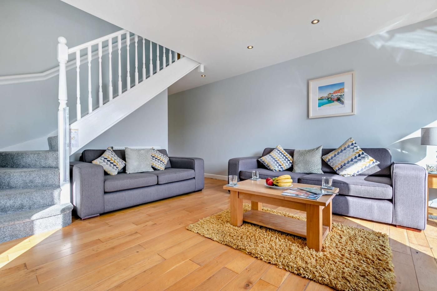 Slip onto the sofa with a cup of tea in hand and relax in the coastal chic interiors in the living room.