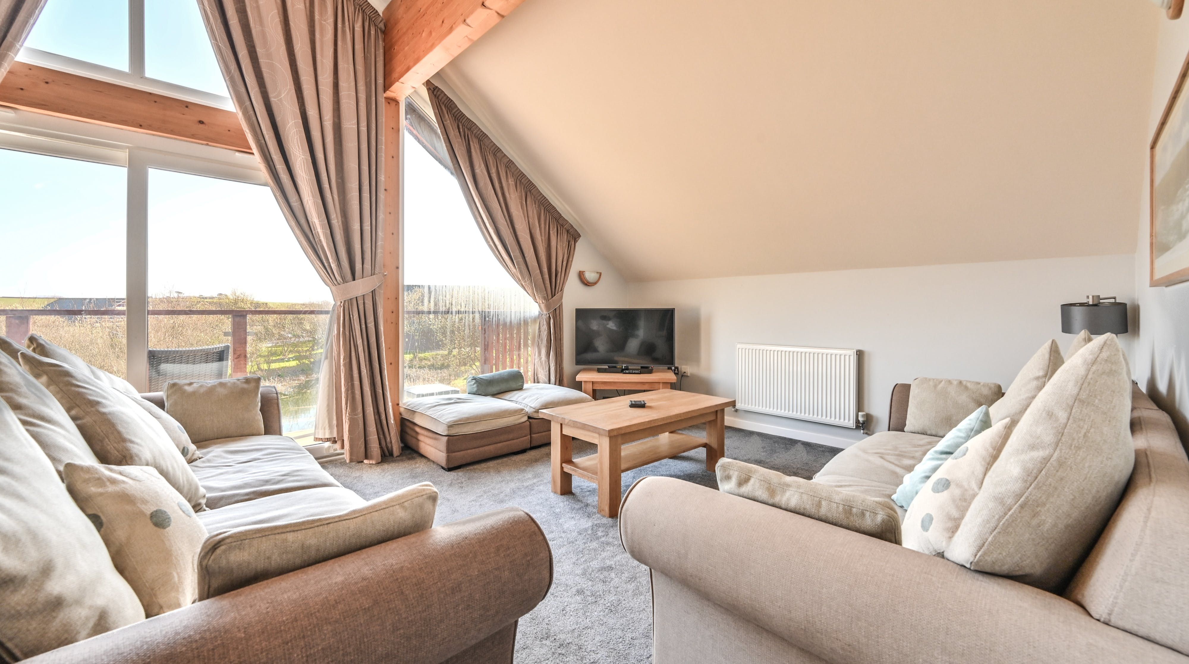 With two living rooms and an outdoor terrace, everyone can find their own patch of peace and quiet to enjoy with a good book. When you get hungry, fire up the barbeque and serve up a tasty alfresco feast as you admire the view across the lake. If you're feeling active, head out for a walk around the shared grounds, run on the 5k track, or swim some laps in the indoor swimming pool. If you'd rather take it easy, treat yourself to a session in the spa, before slipping into your private hot tub for a soak under the stars.