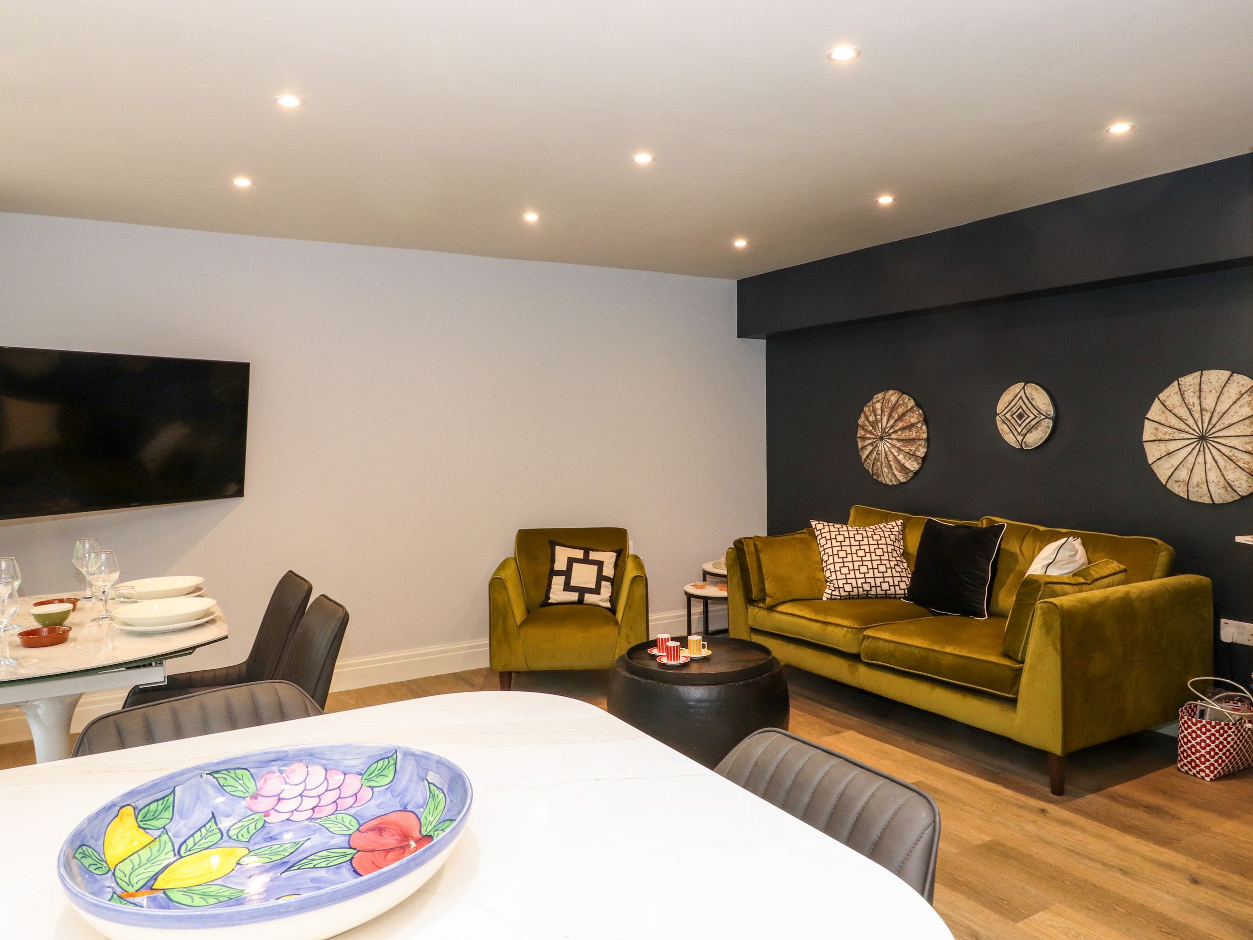Over three floors. Two bedrooms: 1 x second-floor king-size, 1 x second-floor twin (zip/link can be super-king-size on request). Second-floor shower room with walk-in shower, basin, heated towel rail and WC. Second-floor cloakroom with basin and WC. First-floor open-plan living space with kitchen, dining area and sitting area with balcony