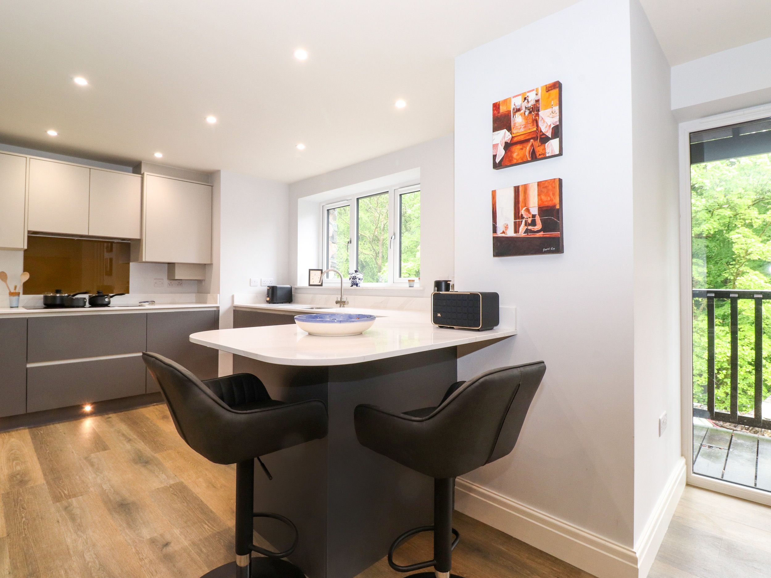 Jenever Cottage has one second-floor king-size and one second-floor twin (zip/link can be super-king-size on request) serviced by a second-floor shower room with walk-in shower, basin, heated towel rail and WC and a second-floor cloakroom with basin, heated towel rail and WC. There’s a first-floor open-plan living space with a kitchen equipped with an electric oven and induction hob, microwave, fridge/freezer, washer/dryer, dishwasher, kettle and toaster, a dining area and sitting area with a Smart TV and balcony. Central heating, WiFi, fuel and power, bed linen and towels are included in the rent. Outside there’s a balcony with furniture. Sorry, no smoking. Shop 0.4 miles, pub 0.3 miles, lake 1.4 miles, river 0.1 miles. Visit the wonders of the Lake District with a stay at Jenever Cottage. Note: Check-in from 4pm, check-out by 10am.