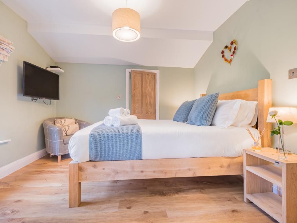 From the ground floor entrance hall head up the stairs to the beautiful living accommodation. On the first floor is the fantastic living room, with a cosy wood burner perfect for relaxing evenings, and the well equipped dining kitchen.
