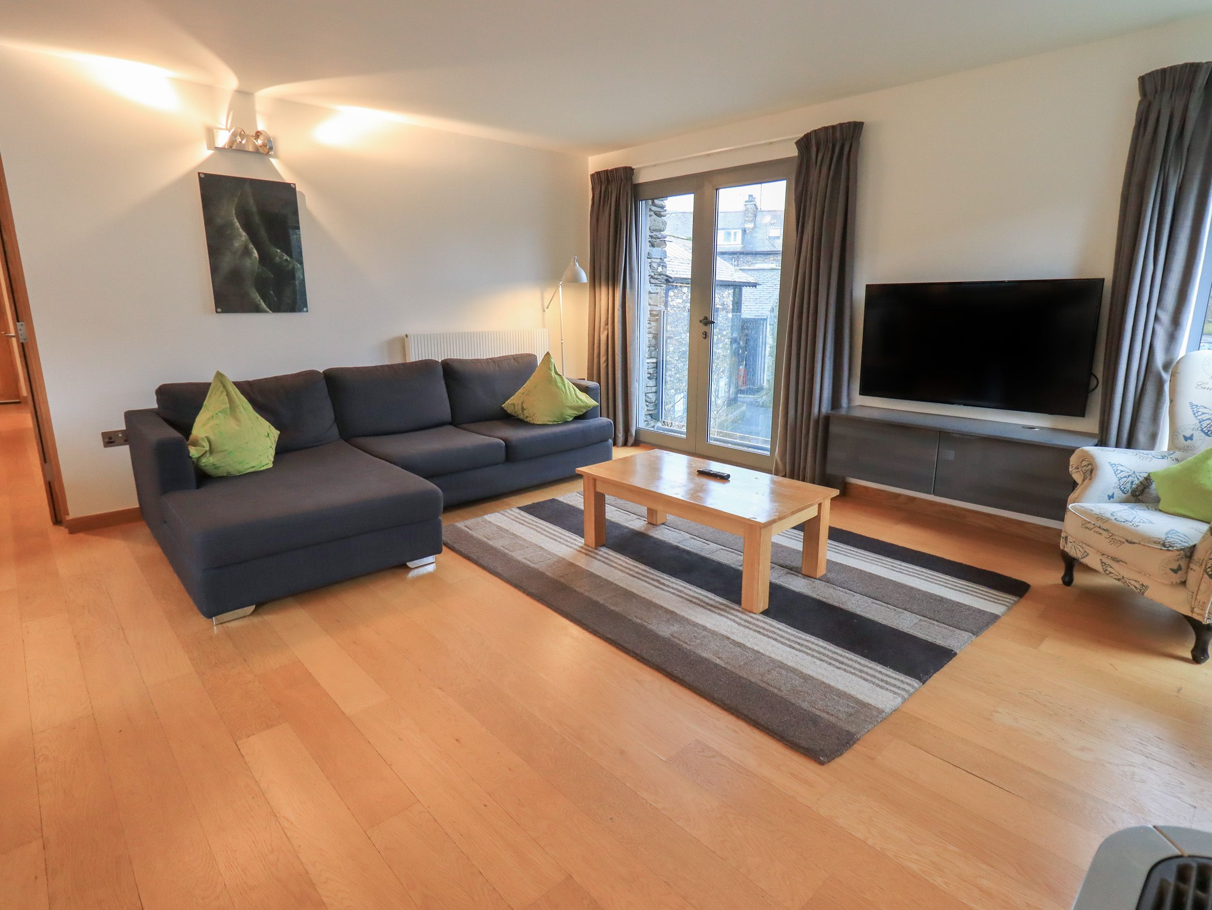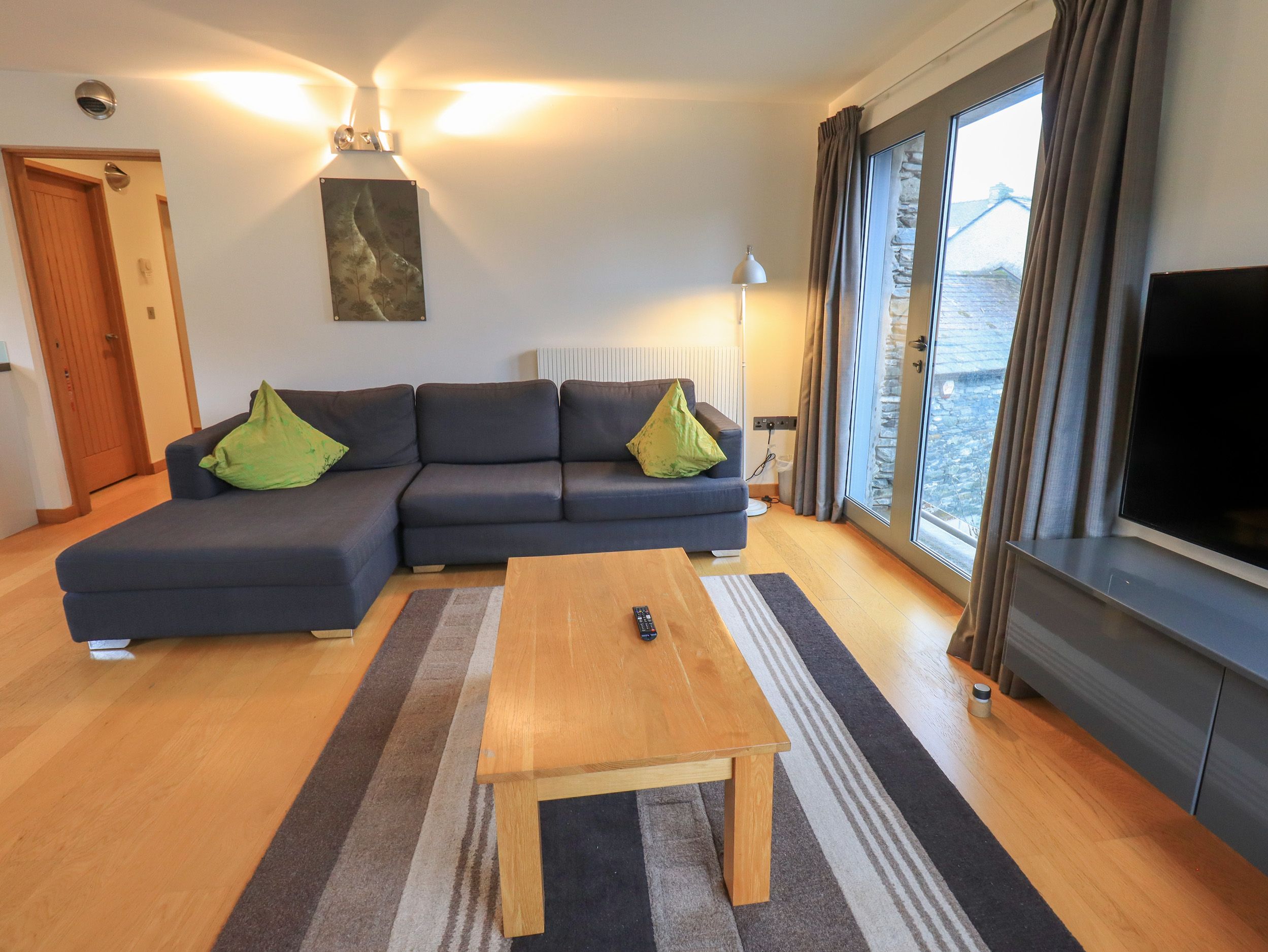 Amenities Breathtaking panoramic 'bird's eye' views from this contemporary apartment. Gas central heating. Contemporary gas fire. Central village setting. Wi-Fi. Washer/dryer in utility room. Electric oven. Gas hob. Microwave and dishwasher. Fridge / freezer. Lavazza coffee machine (there will be some pods provided on arrival). Glass viewing balcony. Flight of stairs from main entrance to apartment Riverside seating. Parking permit for 1 in nearby SLDC car park. Bed linen and towels provided. Cot and highchair available on request.