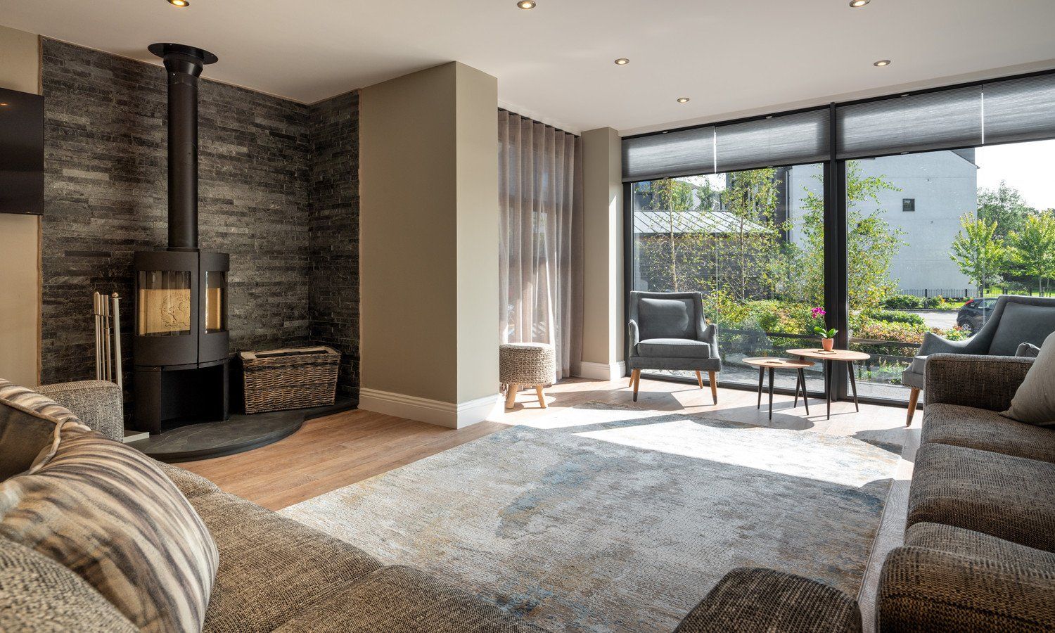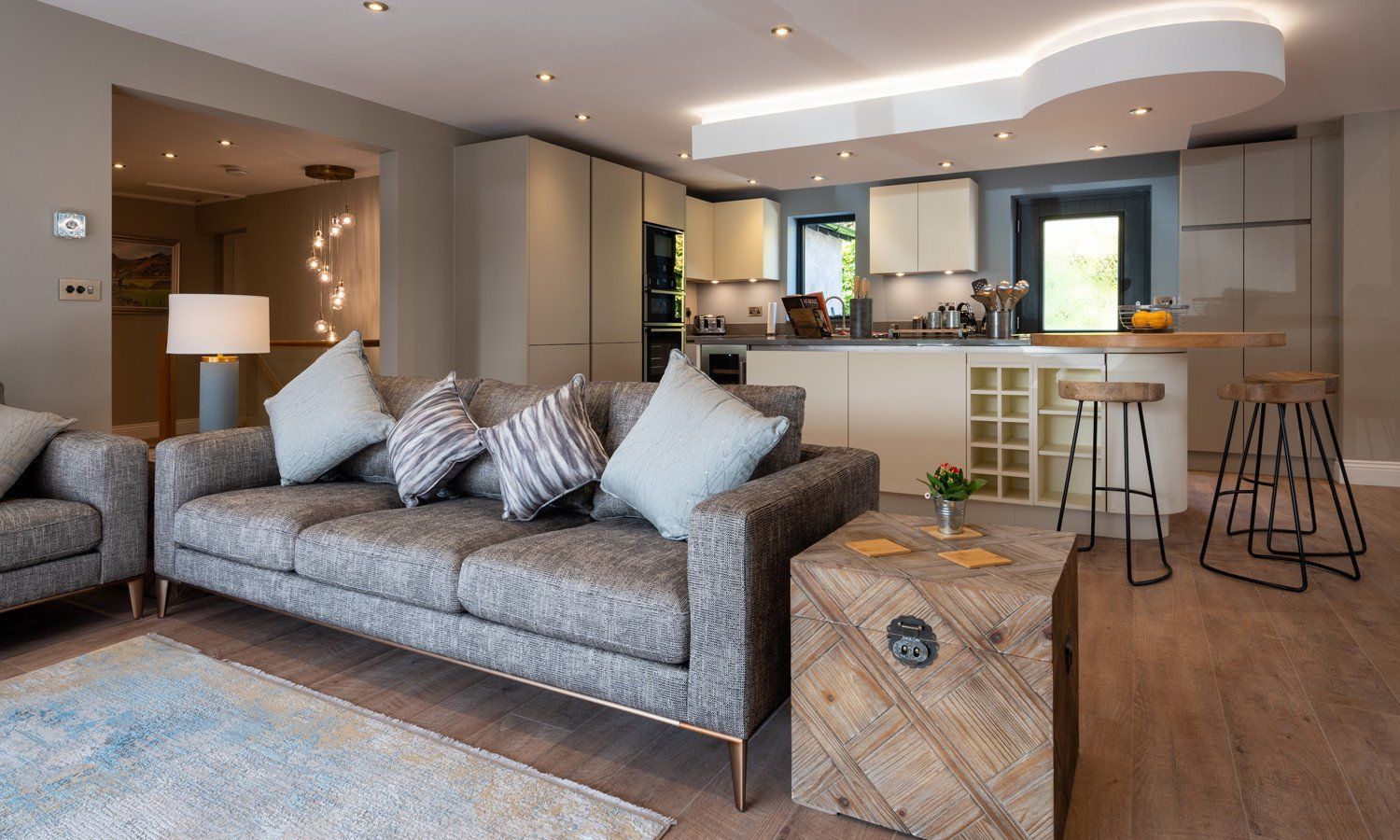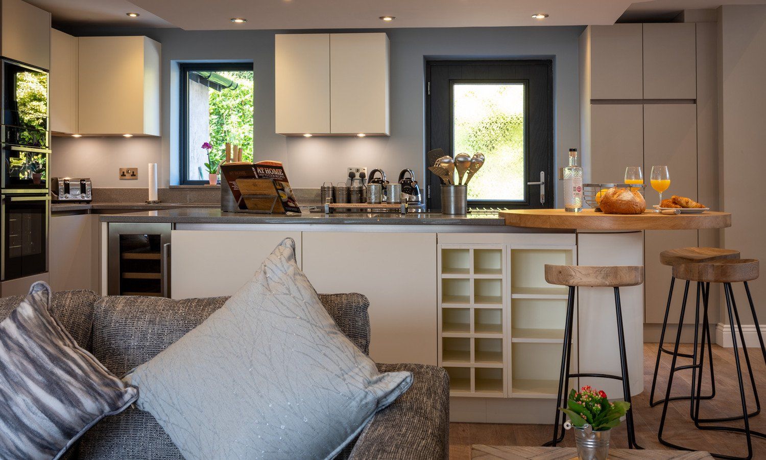 Four bedrooms: 1 x king-size with en-suite bathroom with free standing bath, separate shower, basin and WC, 2 x super king size (zip/link can be split into twins on request) both with en-suite shower rooms with basin and WC, 1 x super king-size with en-suite shower room with basin and WC. Open plan living area with kitchen, dining area and sitting area with woodburning stove. Utility room. Highchair and cot provided. Towels and linen inc.