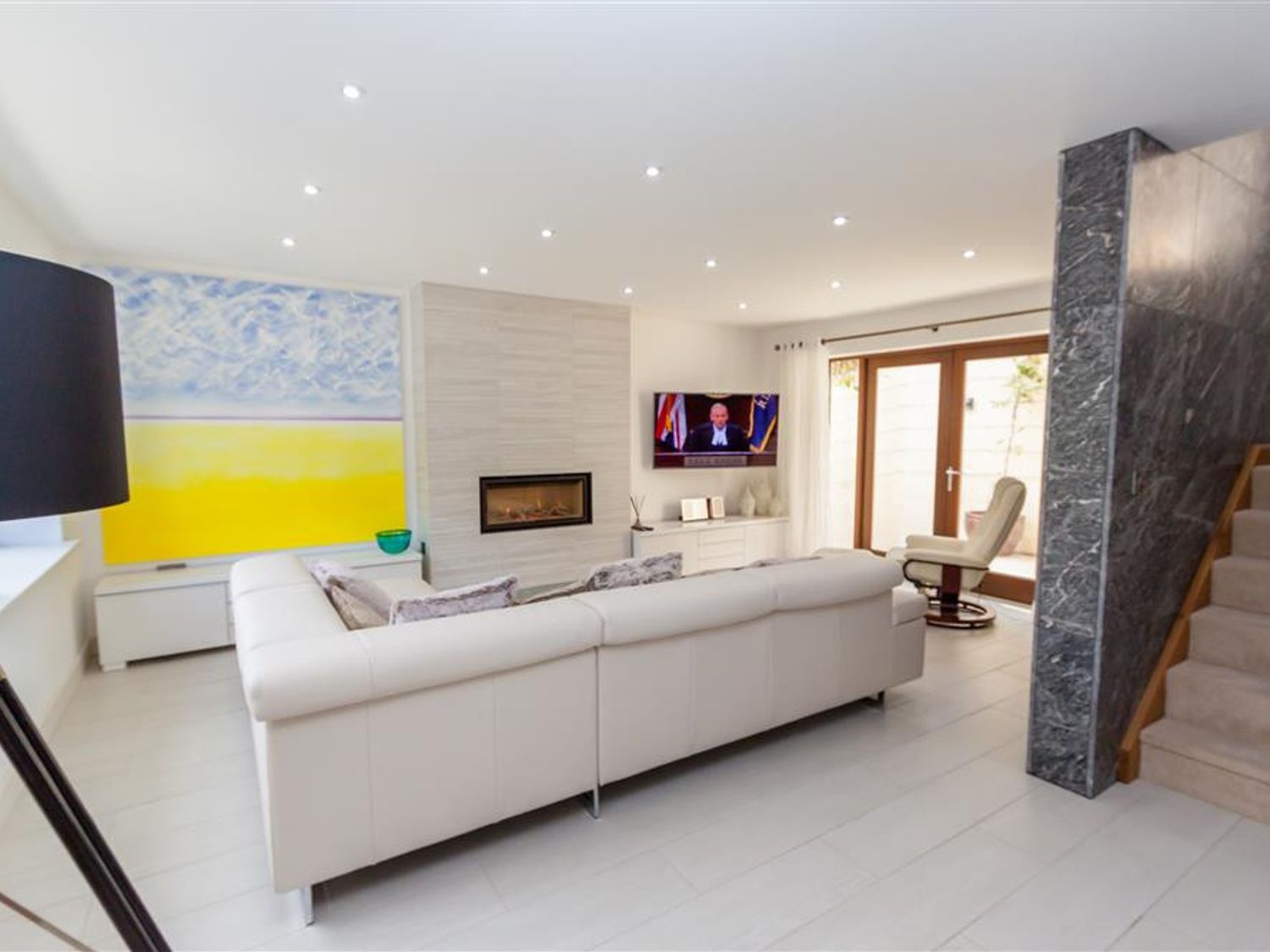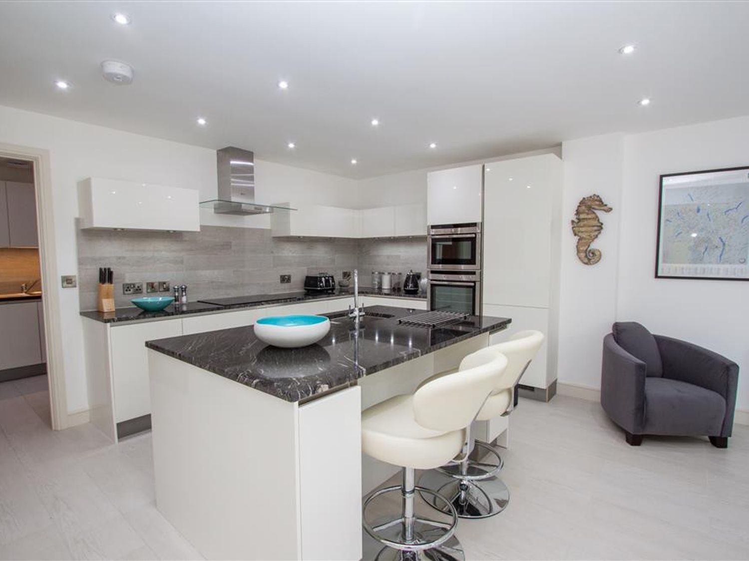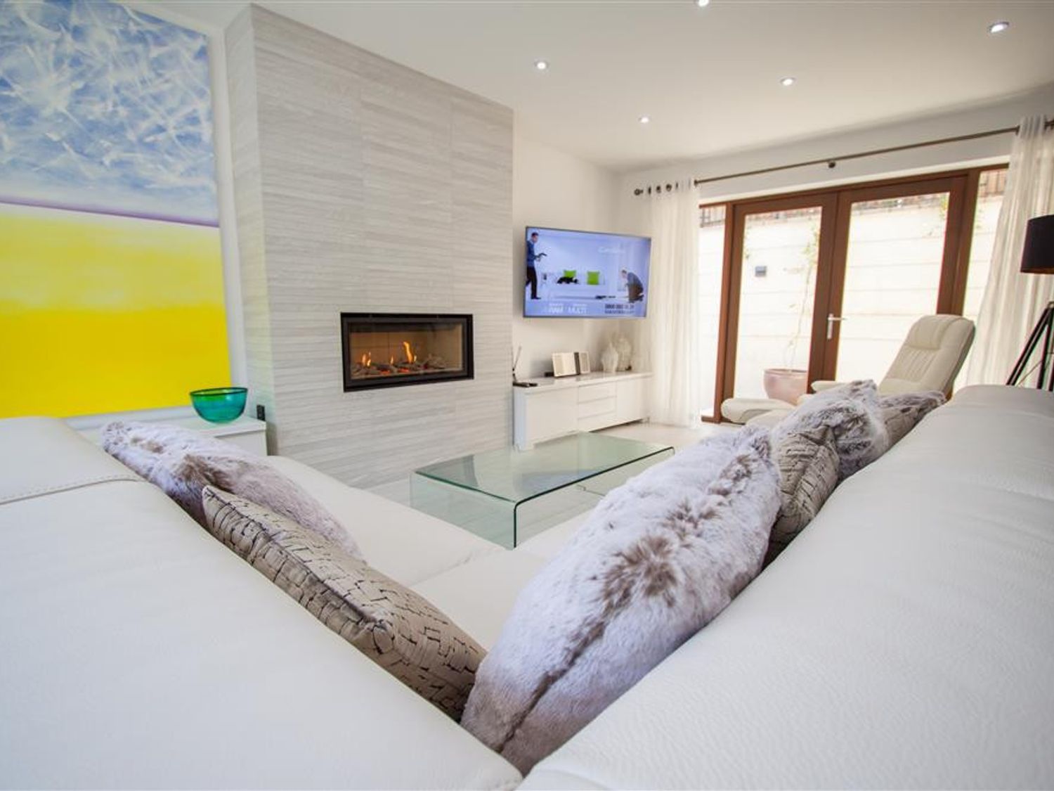 Four bedrooms with TVs: 1 x super-king-size with en-suite walk-in shower, basin and WC, plus private patio area, 1 x super-king-size (zip/link, can be twin on request), 1 x king-size, 1 x single. Bathroom with bath, basin, heated towel rail and WC. Ground-floor shower room with walk-in shower, basin, heated towel rail, and WC. Open-plan living space with kitchen, dining area and sitting area. Utility. Sitting room with living flame gas fire