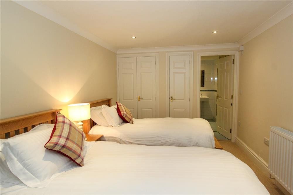 Duplex first-floor apartment. Reverse-level-accommodation. Three first-floor bedrooms: 1 x king-size with en-suite walk-in shower, basin, heated towel rail and WC, 1 x double, 1 x twin with en-suite bath, shower over, basin, heated towel rail and WC. Bathroom with bath, hand-held shower, basin, heated towel rail and WC. Second-floor cloakroom with basin and WC. Second-floor kitchen. Second-floor living/dining room with balcony