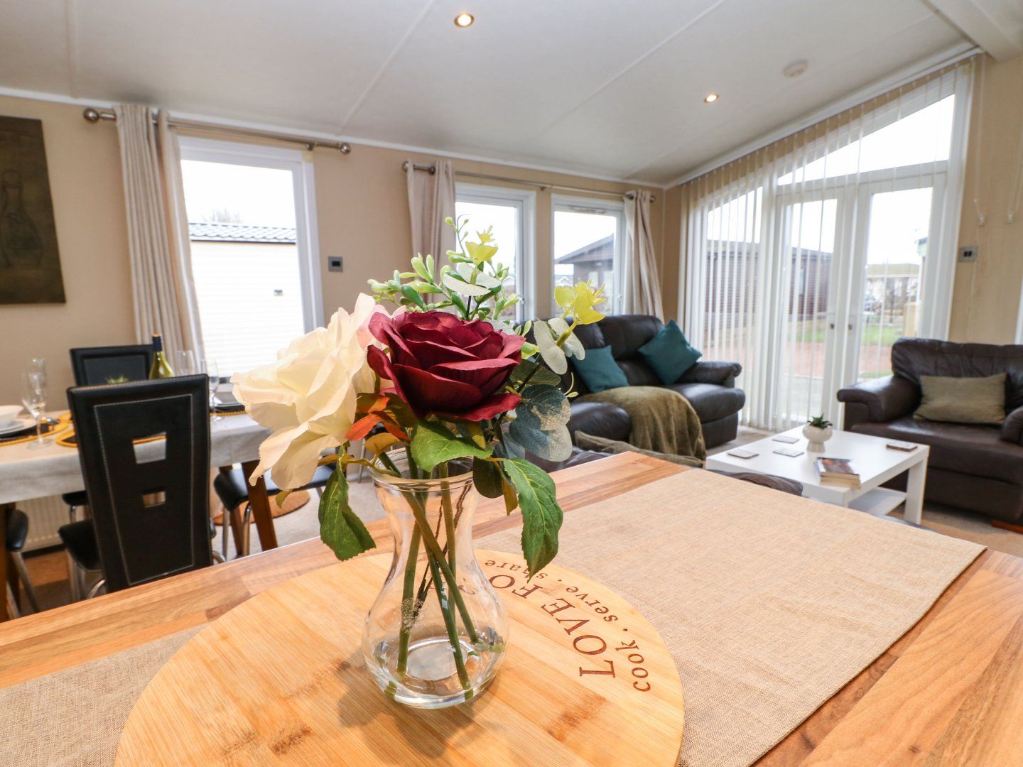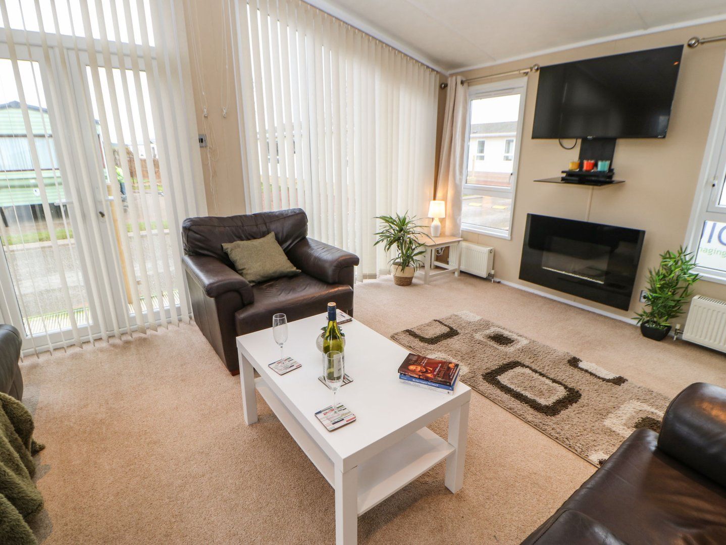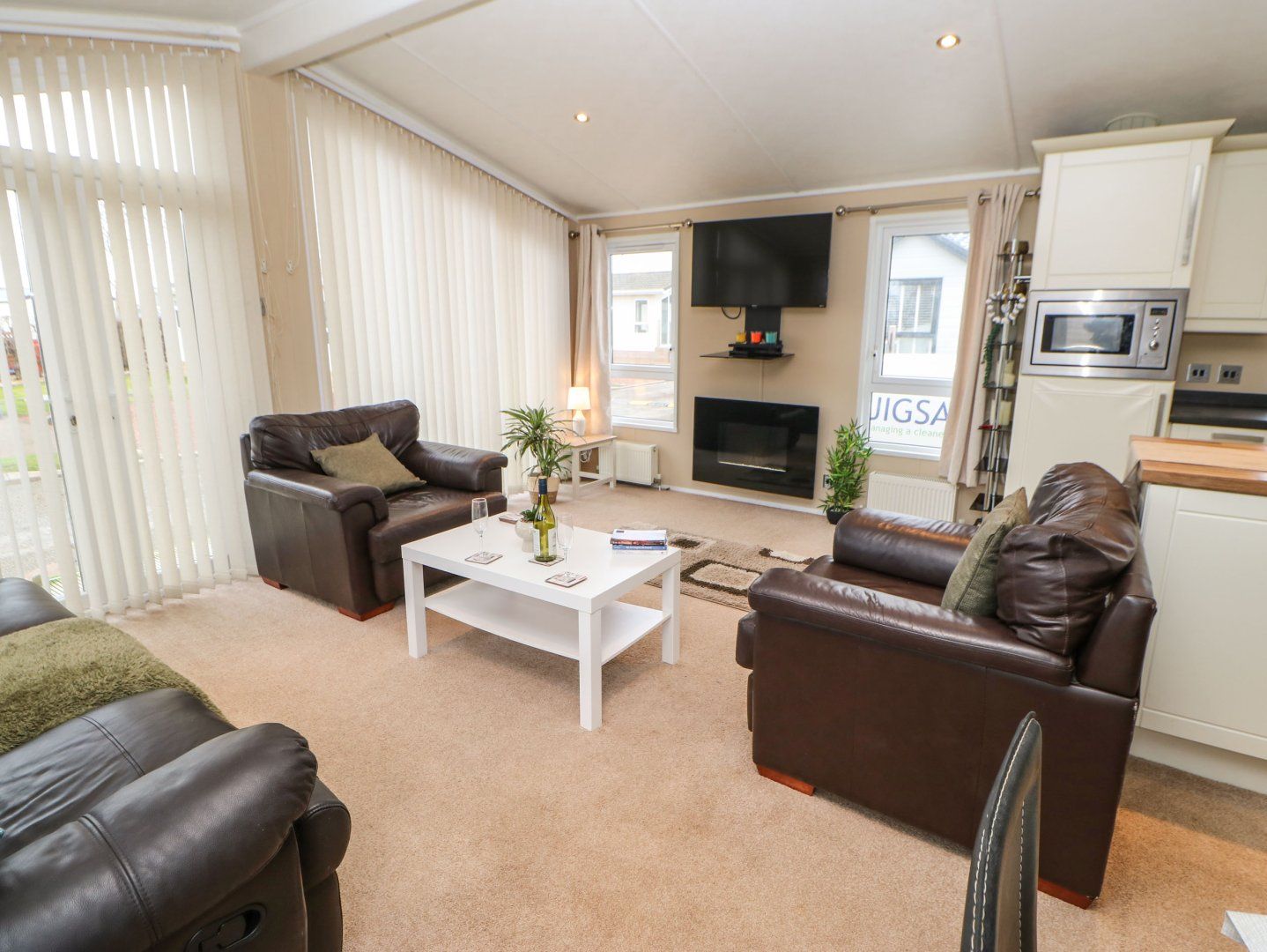 Accomodation Details Single-storey. Three bedrooms: 1 x double with TV and en-suite walk-in shower, basin and WC, 2 x twin. Shower room with walk-in shower, basin, heated towel rail and WC. Open-plan living space with kitchen, dining area and sitting area with electric fire