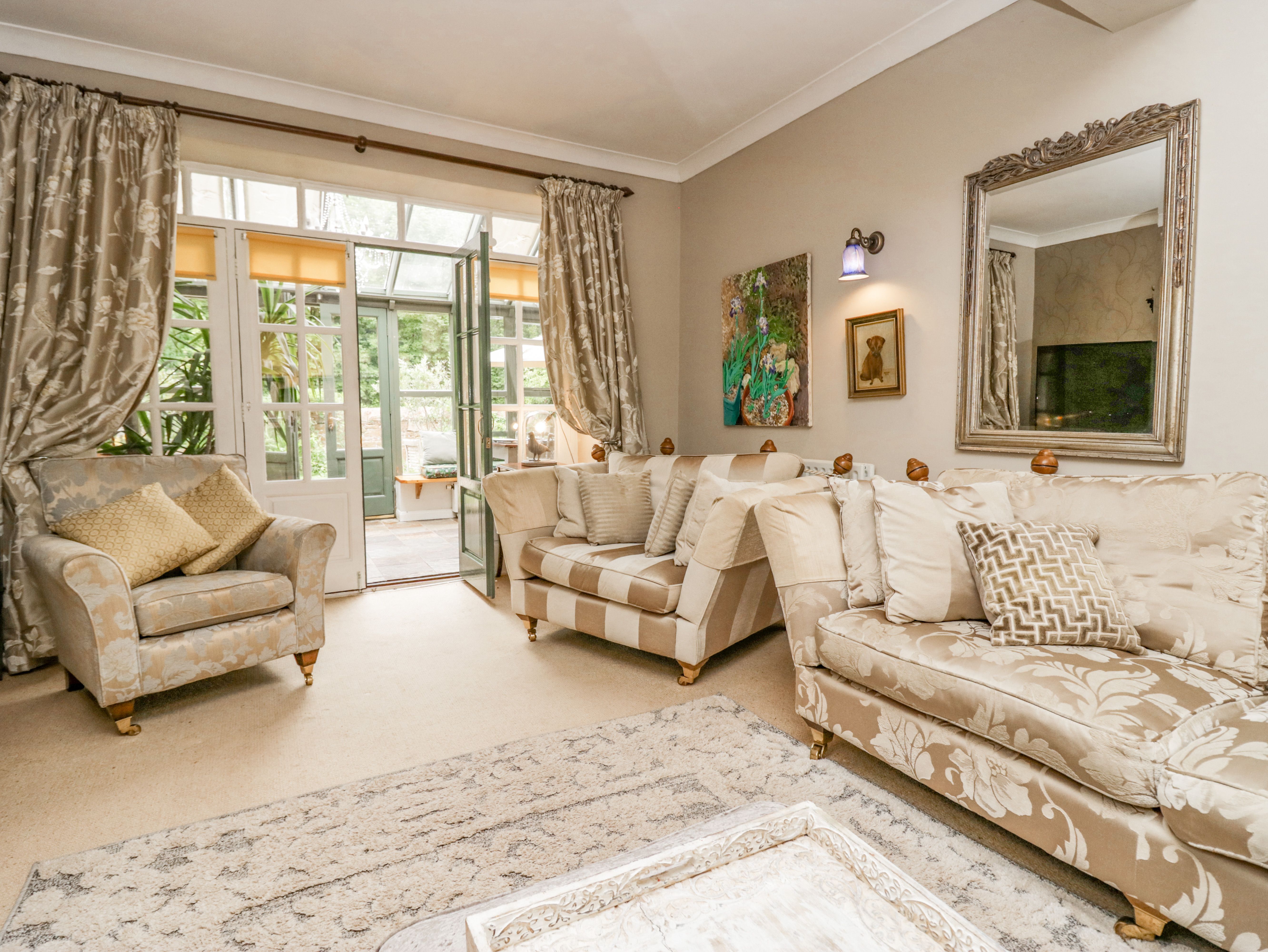 Accomodation Details Six bedrooms: 1 x ground-floor king-size with en-suite bathroom with roll-top bath, walk-in shower, basin, heated towel rail and WC, 1 x ground-floor king-size with TV and walk-in shower, basin, heated towel rail and WC, 1 x ground-floor double with TV and en-suite walk-in shower, basin, heated towel rail and WC, 1 x super-king with TV and en-suite walk-in shower, basin and WC, 1 x super-king-size (zip/link, can be twin on request) with TV and en-suite bathroom with freestanding bath, walk-in shower, basin and WC, 1 x king-size with TV and en-suite walk-in shower, basin and WC. Kitchen with woodburning stove. Dining room. Sitting room with woodburning stove