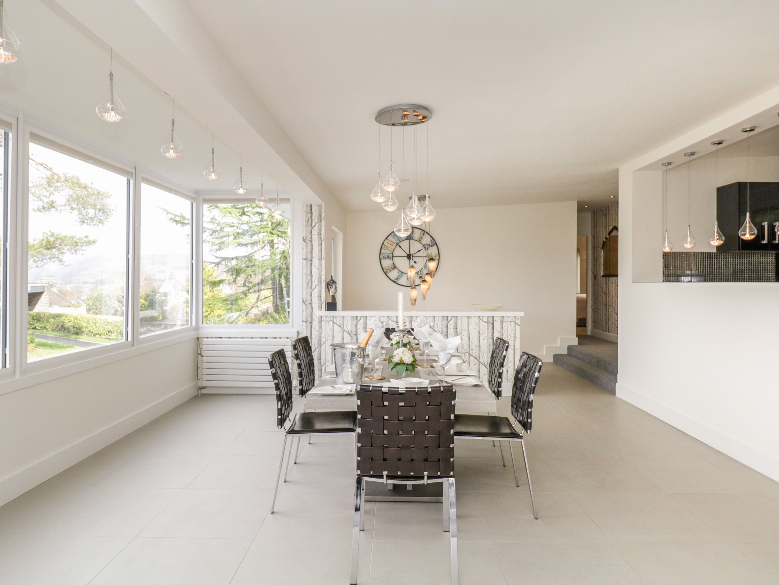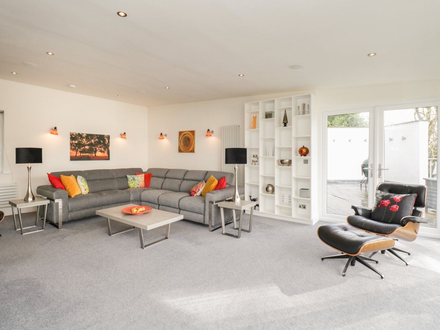 Accomodation Details Reverse-level. Four bedrooms: 1 x ground-floor super-king-size (zip/link, can be twin on request) with TV and en-suite bathroom with bath, shower over, basin, heated towel rail and WC, 1 x ground-floor super-king-size (zip/link, can be twin on request) with TV, 2 x king-size with TV and en-suite walk-in shower, basin, heated towel rail and WC. Ground-floor shower room with walk-in shower, basin, heated towel rail and WC. First-floor open-plan living space with kitchen, dining area and sitting area with flame-effect electric fire and balcony. Internal utility room with washer/dryer