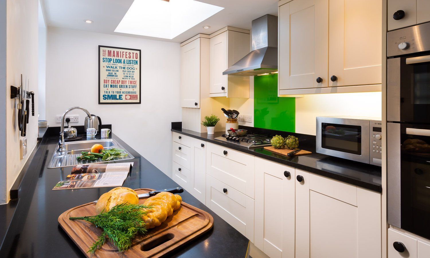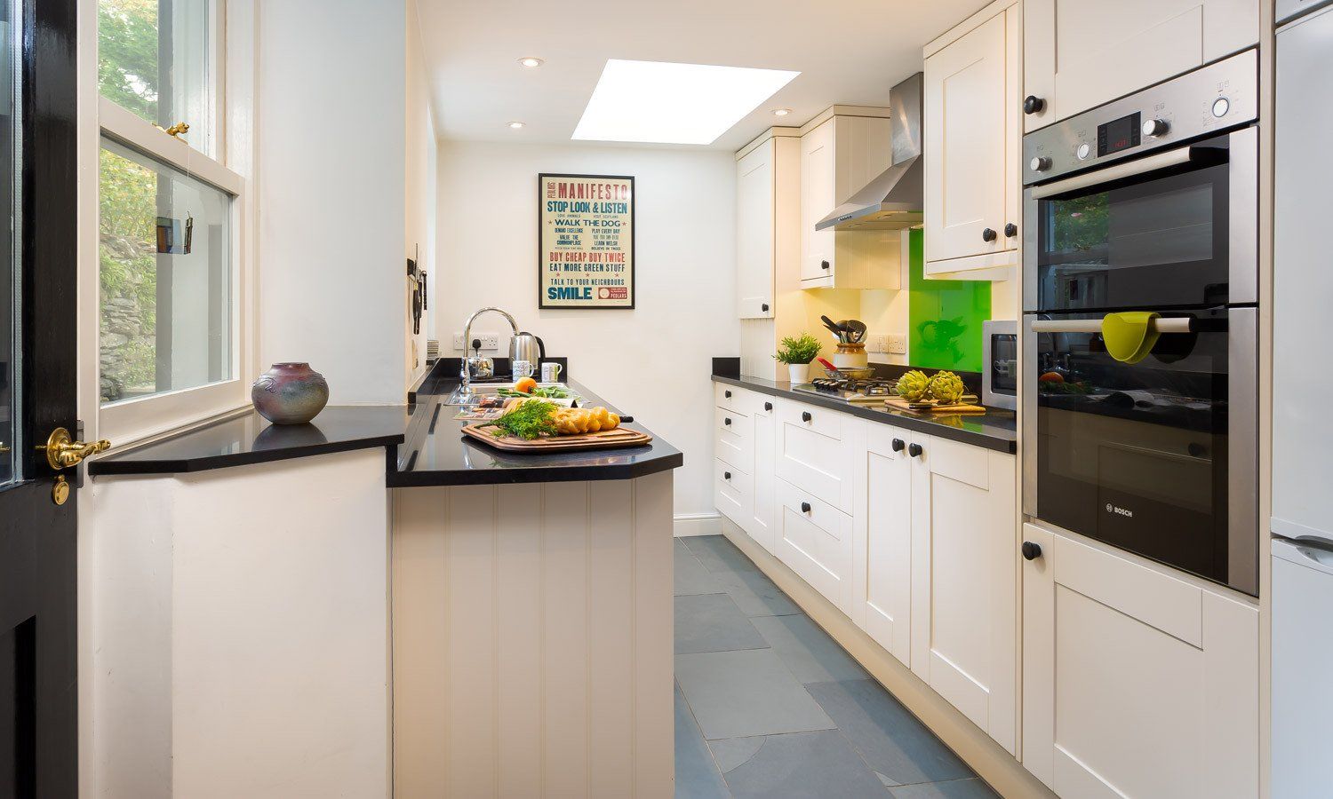 Amenities Gas central heating with woodburning stove. Electric oven and gas hob, microwave, fridge/freezer, washing machine, dishwasher, TV with DVD player, WiFi. Underfloor heating in kitchen and bathroom. Fuel and power inc. in rent. Bed linen and towels inc. in rent. Parking in a garage for one small car accessed via back lane.. Secure bike storage. Courtyard with seating. Sorry, no pets and no smoking. Access to garage via back lane.